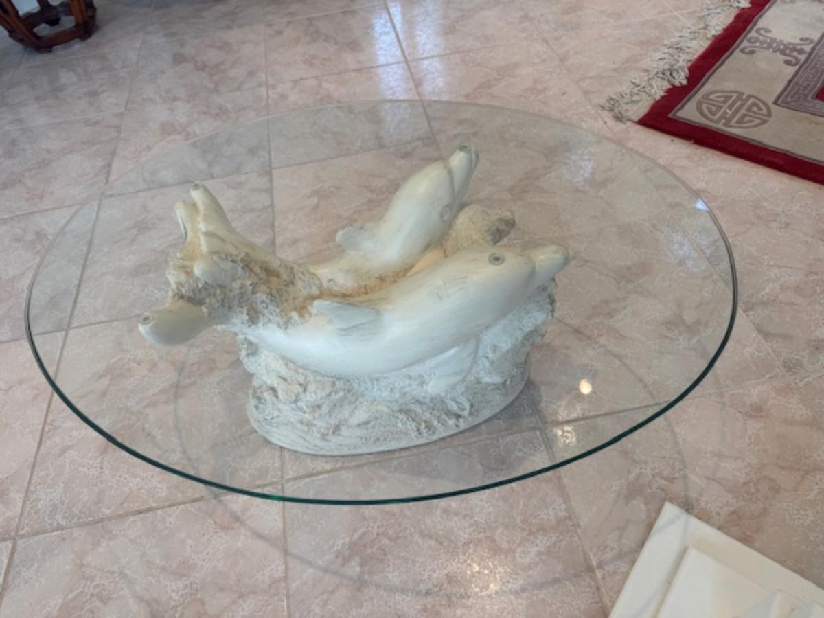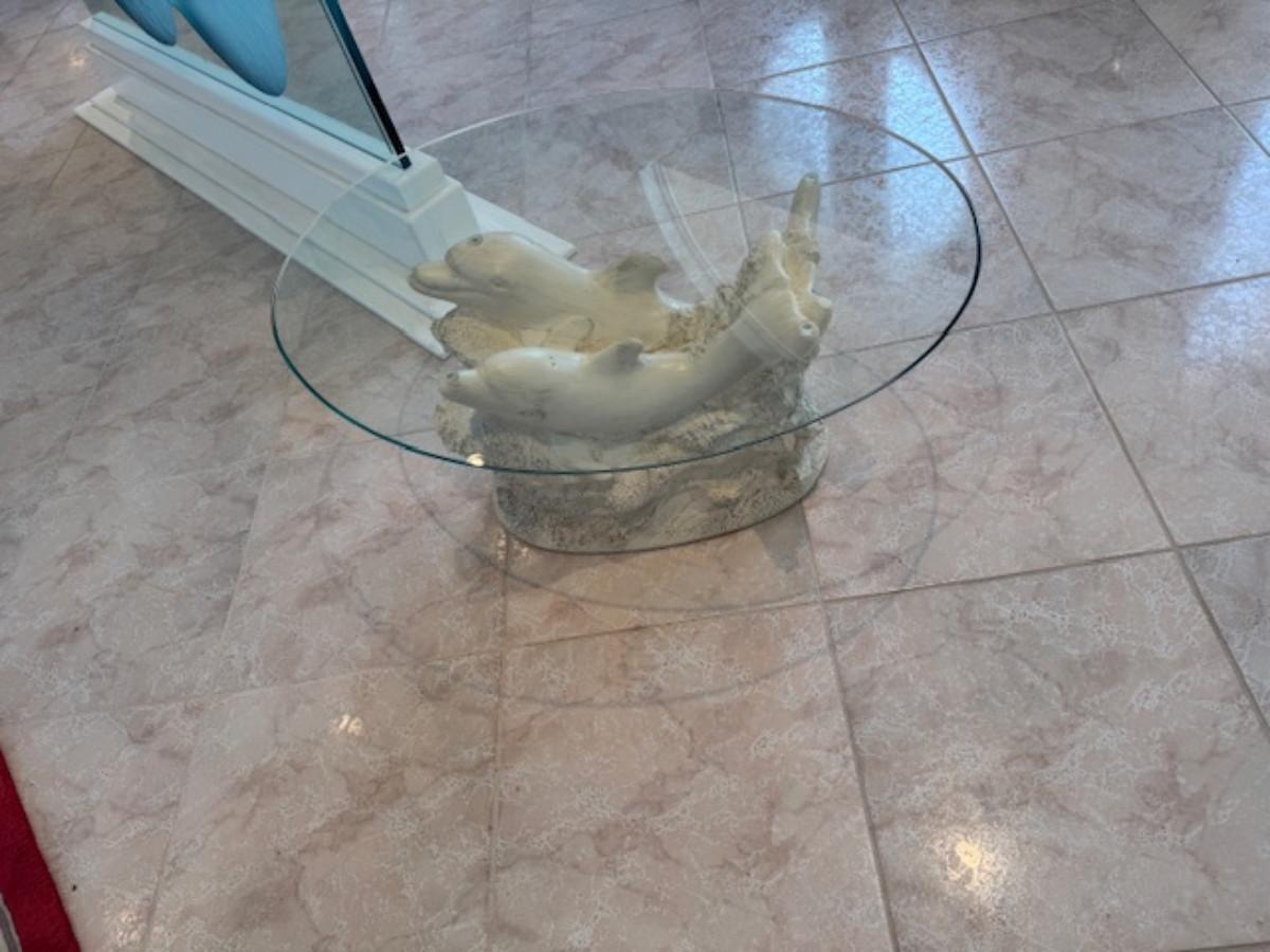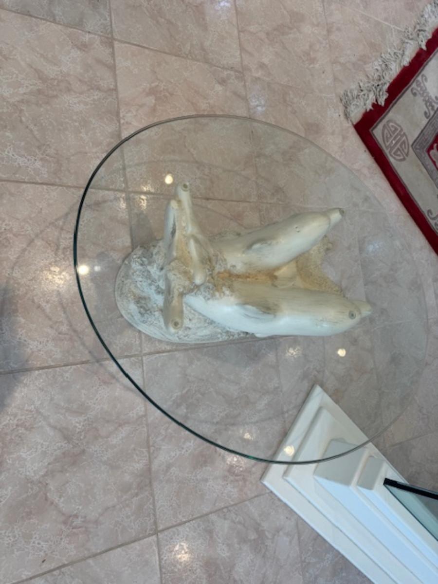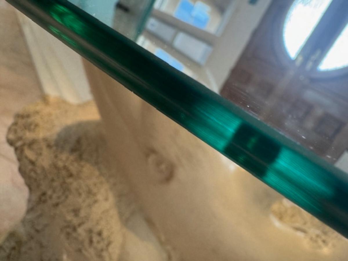 Glass comes off of the base which is very light weight. Base has been repaired but is very sturdy and only noticeable when we took off the glass and inspected the item for pictures. Glass top has a scratch that was only discovered when we put it on a red carpet to clean both sides.