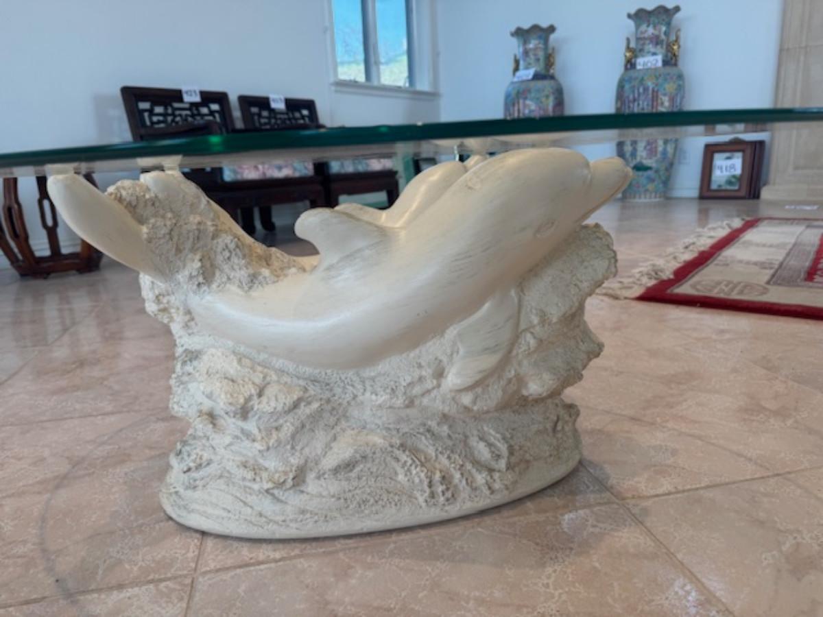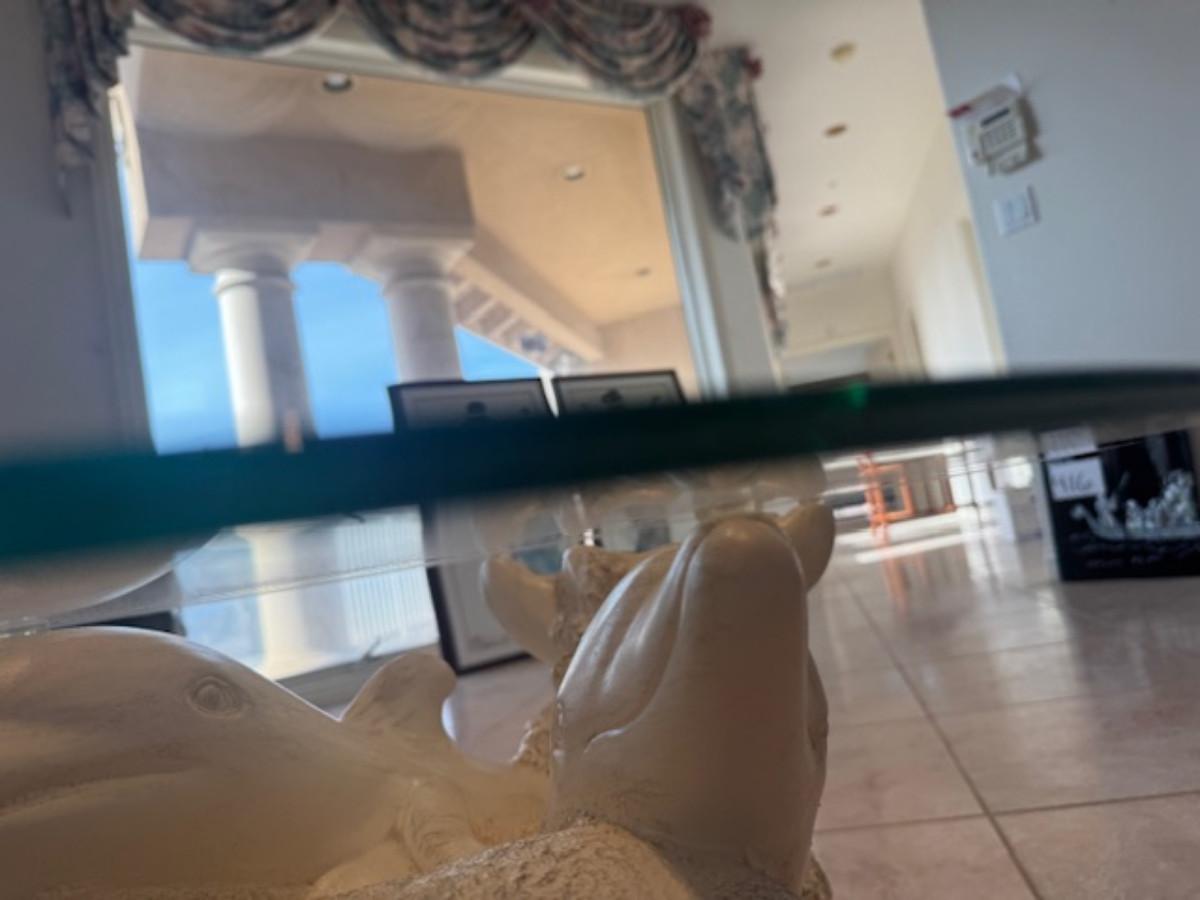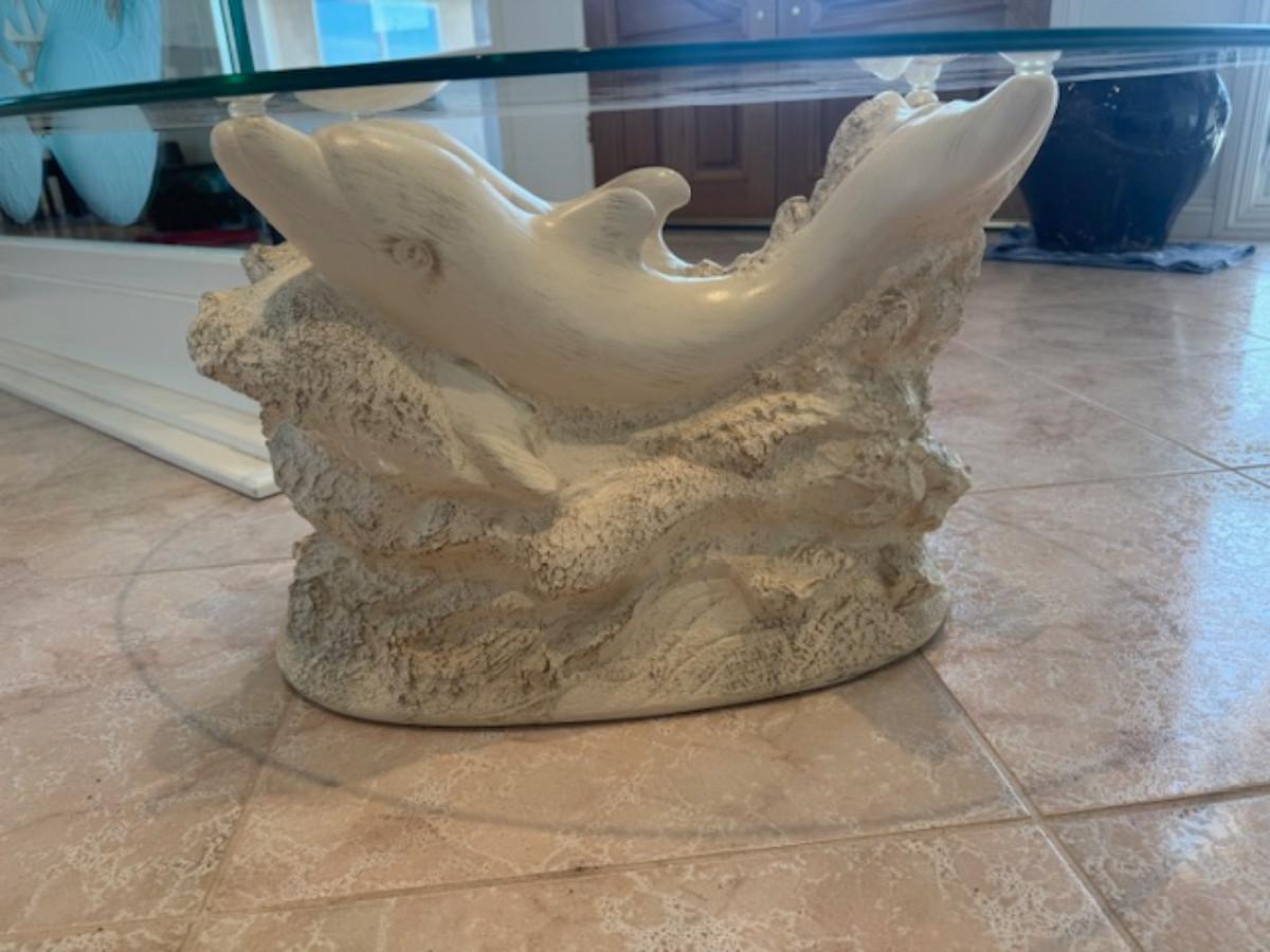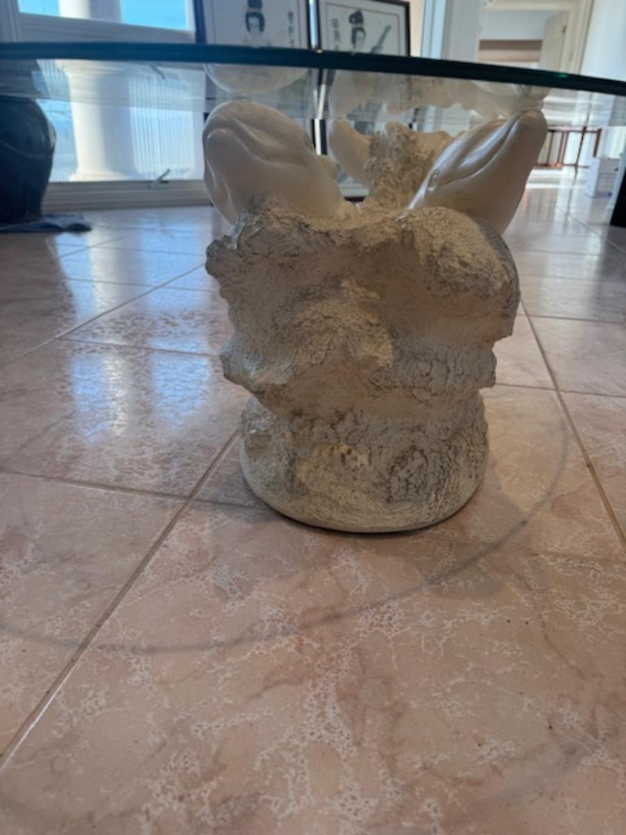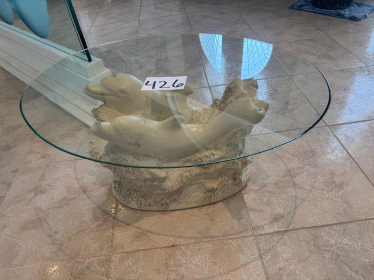 Glass comes off of the base which is very light weight. Base has been repaired but is very sturdy and only noticeable when we took off the glass and inspected the item for pictures. Glass top has a scratch that was only discovered when we put it on a red carpet to clean both sides.