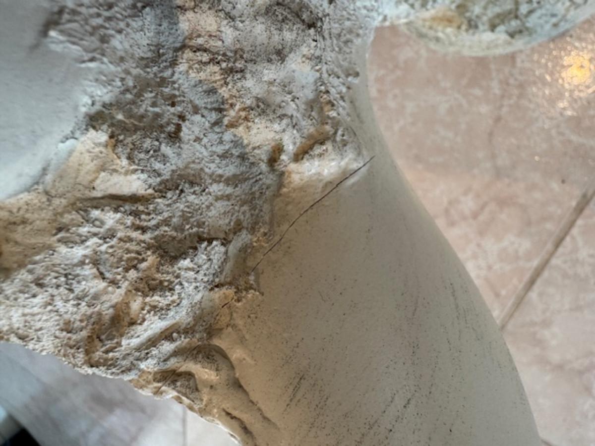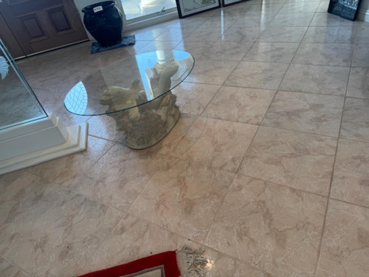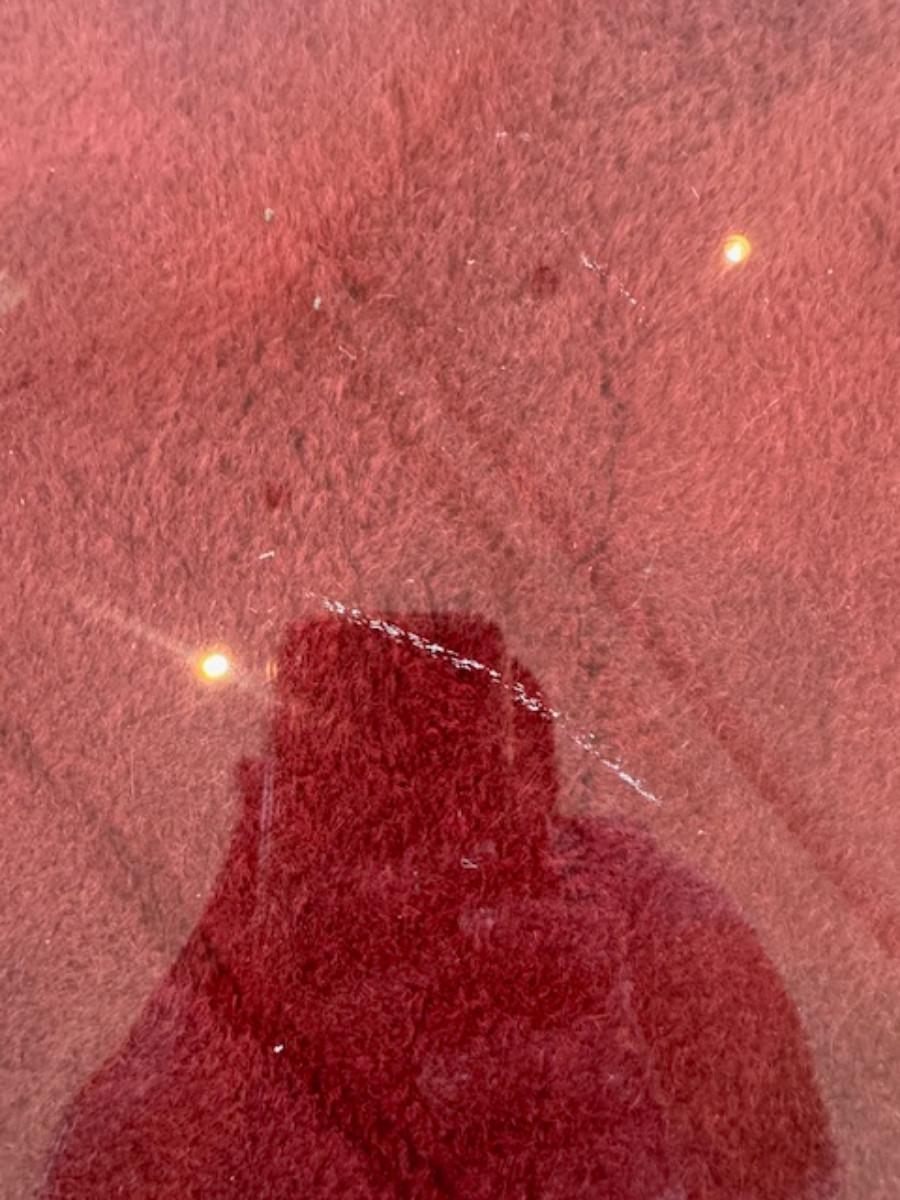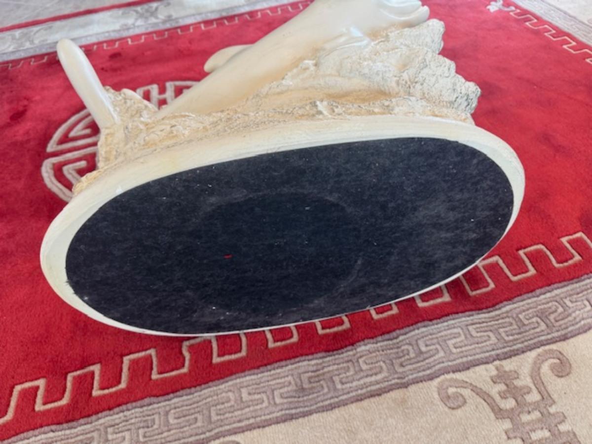 Glass comes off of the base which is very light weight. Base has been repaired but is very sturdy and only noticeable when we took off the glass and inspected the item for pictures. Glass top has a scratch that was only discovered when we put it on a red carpet to clean both sides.