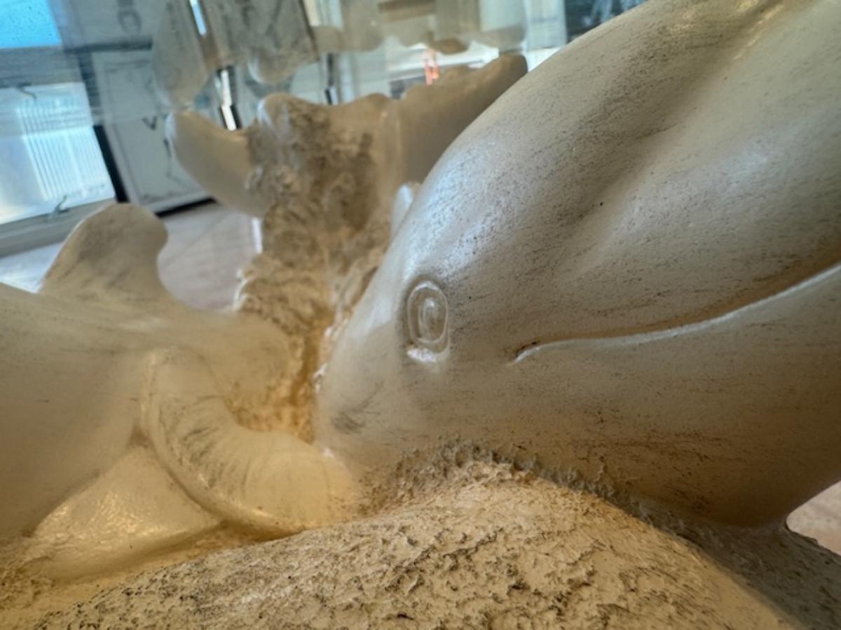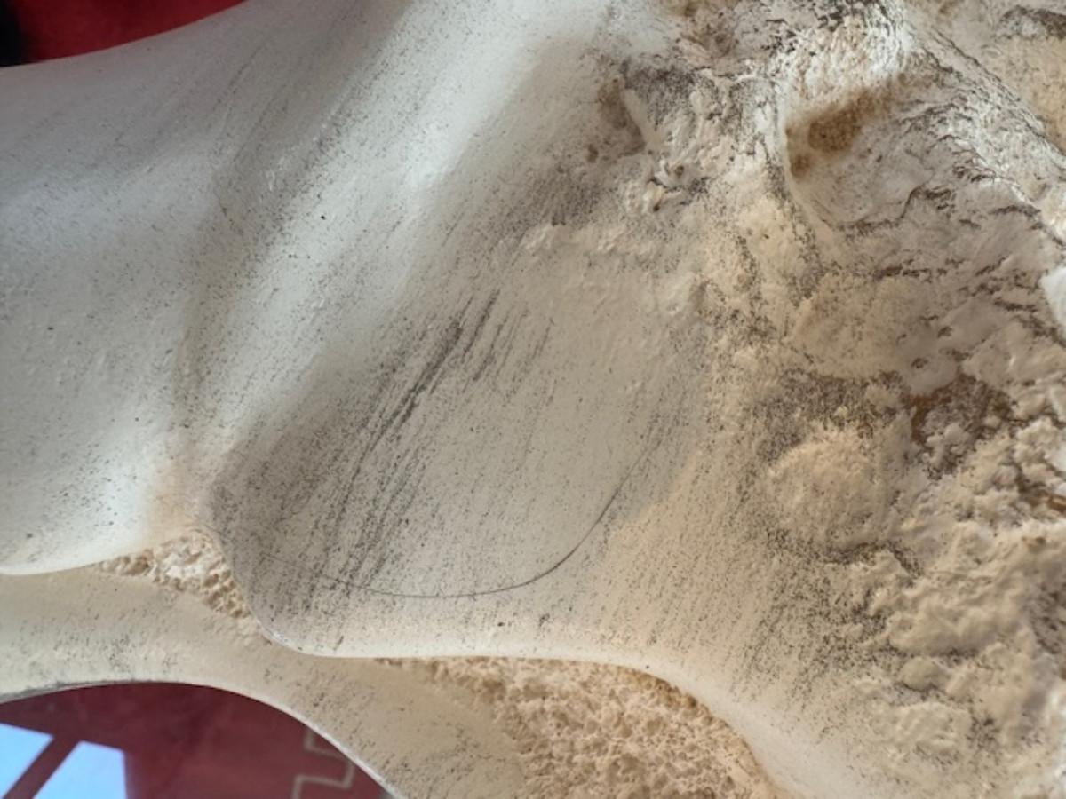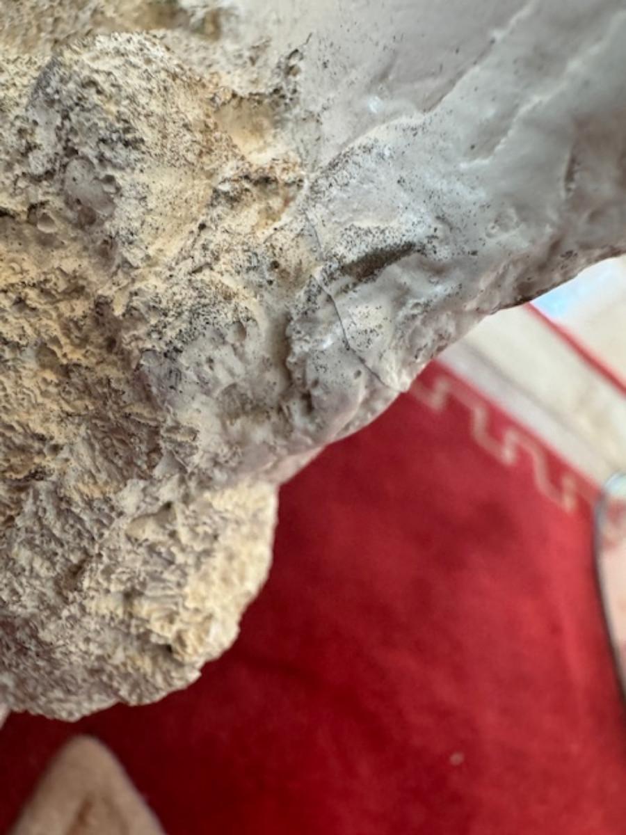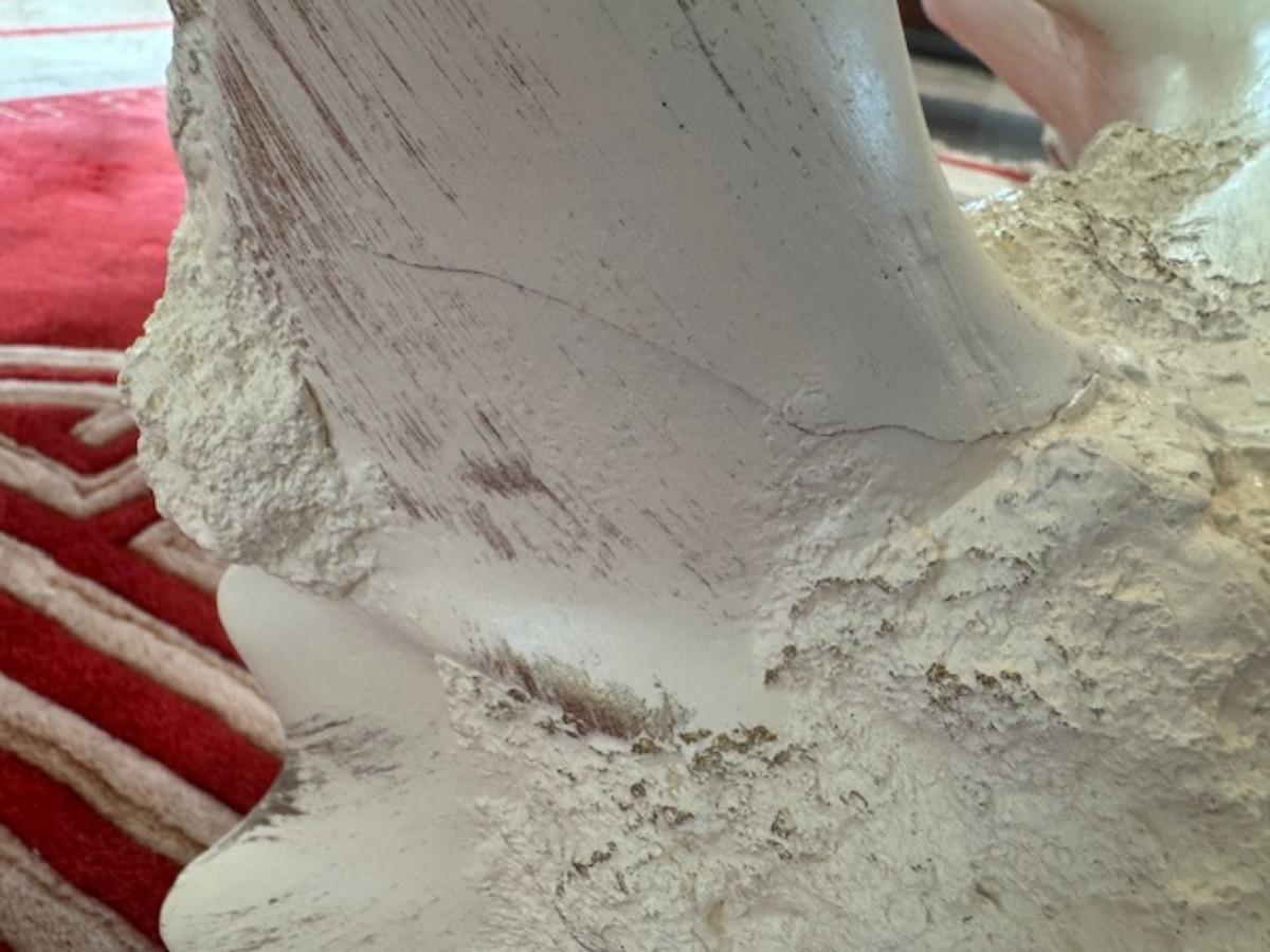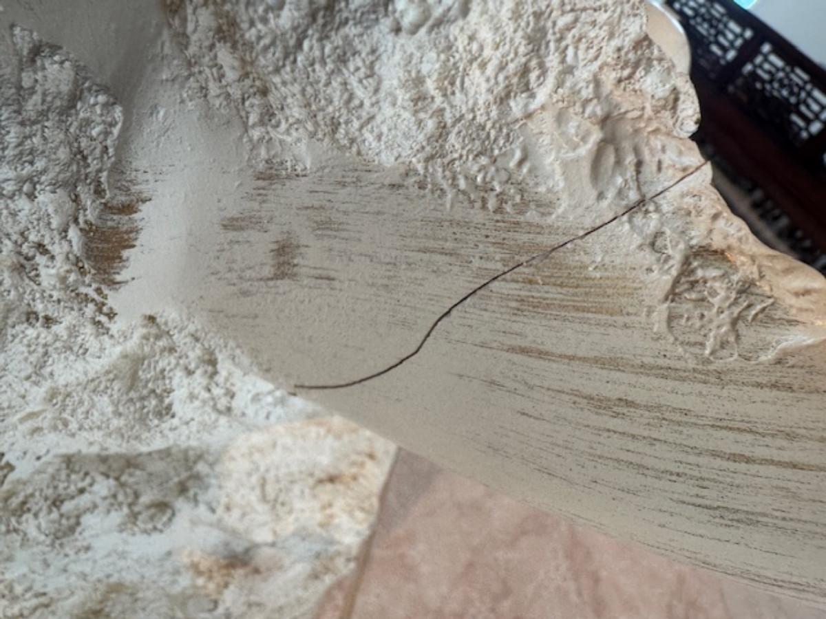 Glass comes off of the base which is very light weight. Base has been repaired but is very sturdy and only noticeable when we took off the glass and inspected the item for pictures. Glass top has a scratch that was only discovered when we put it on a red carpet to clean both sides.