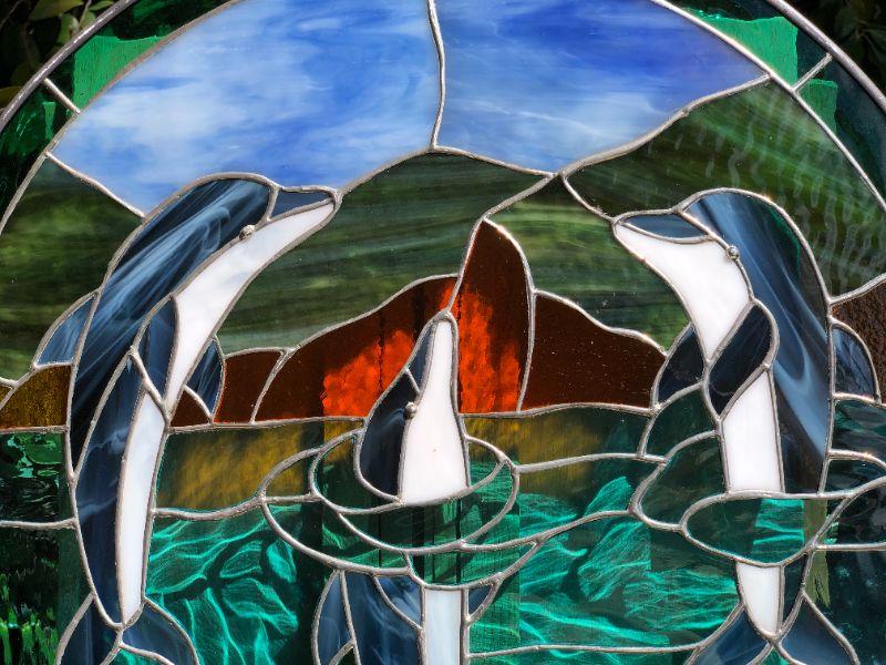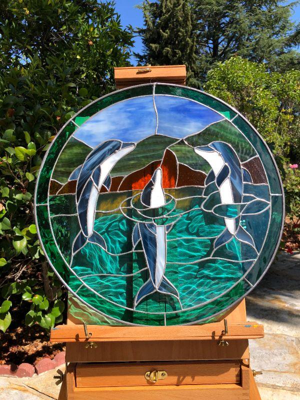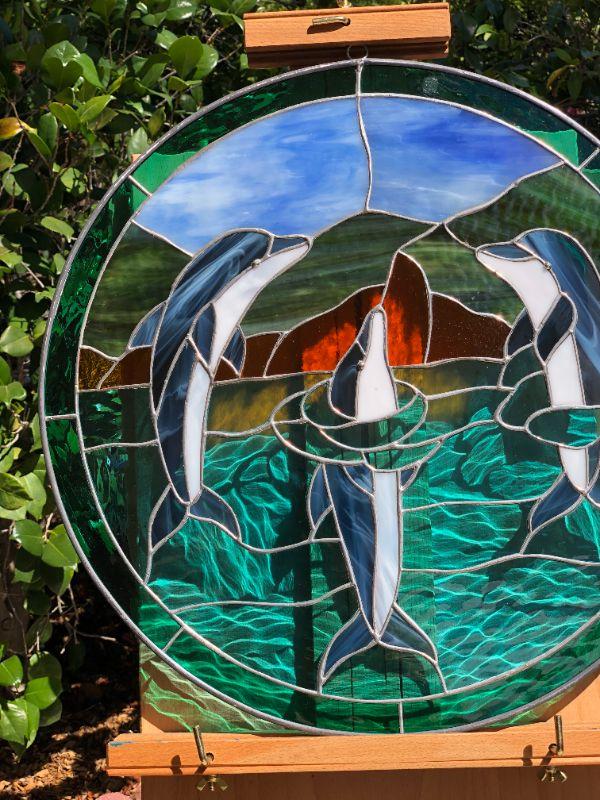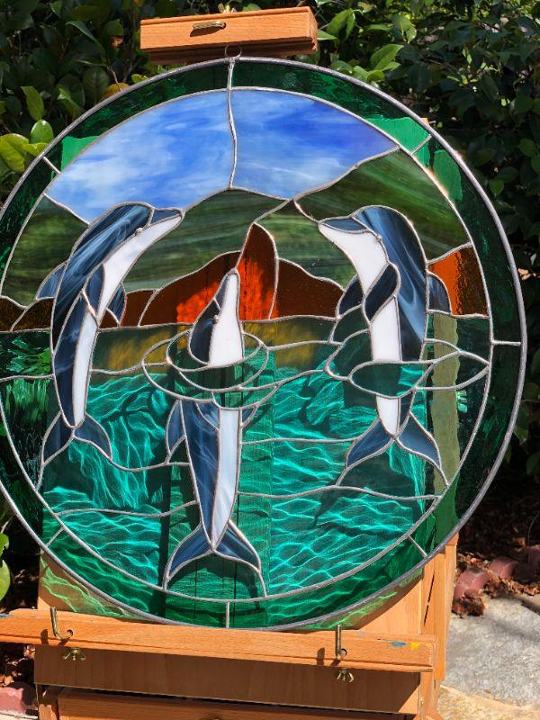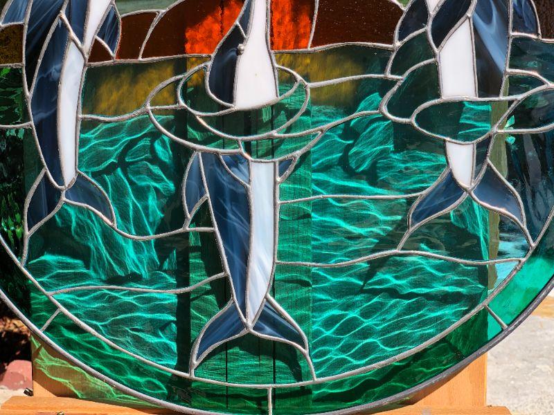 Dolphins Swimming in the Ocean 19 Inch Diameter Circle Stained Glass Window