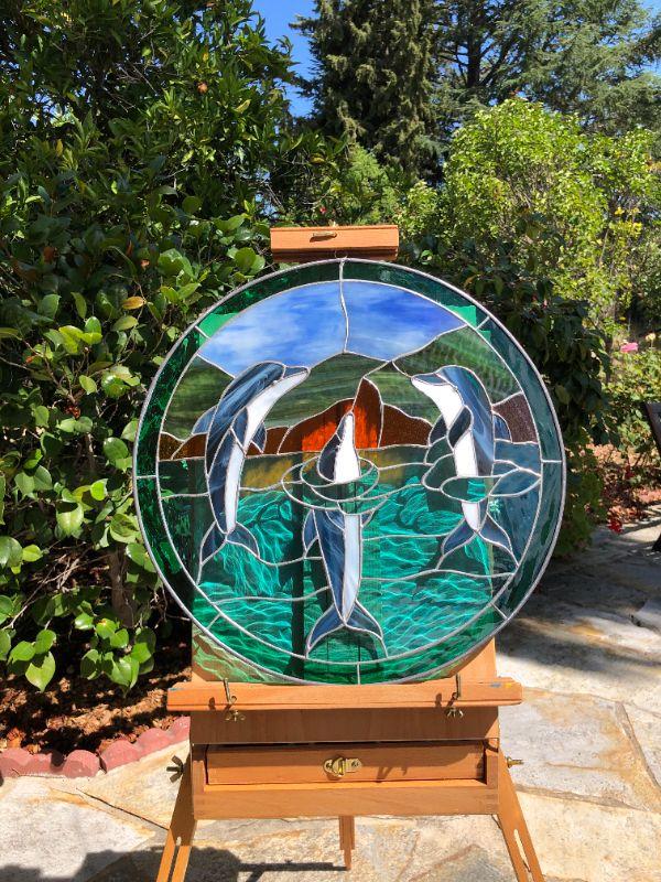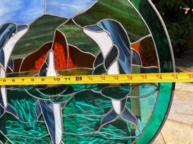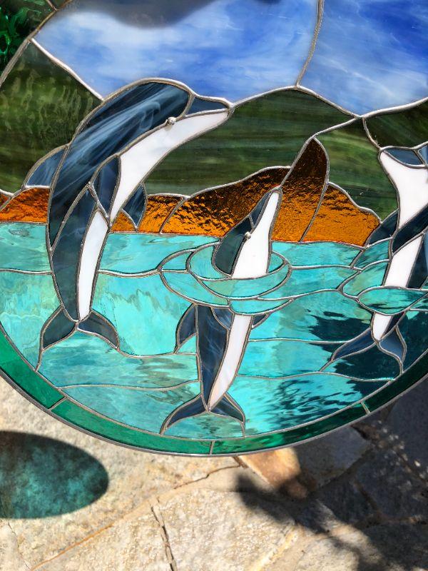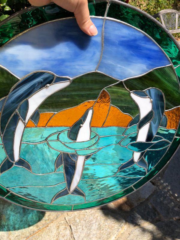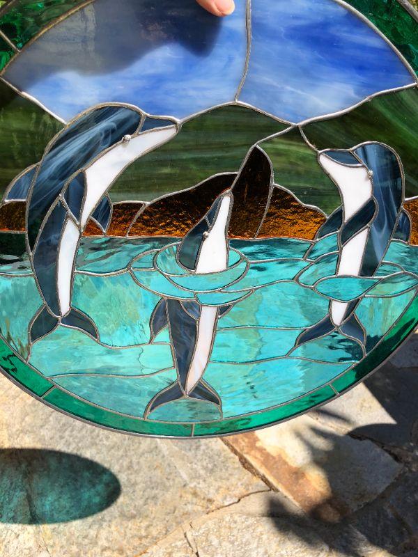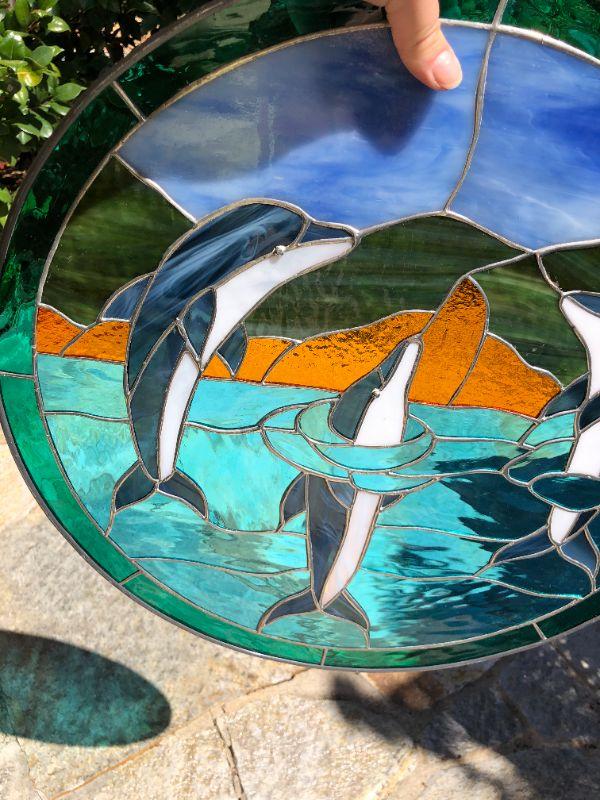 Beautiful scene of dolphins swimming the in the turquoise blue waters of the tropical ocean. Bring this little piece of paradise into your home! In excellent condition, no visible chips or cracks. We provided pictures with different light and background to give you an accurate sense of the window's beauty. Approximately 19 inches in diameter.
