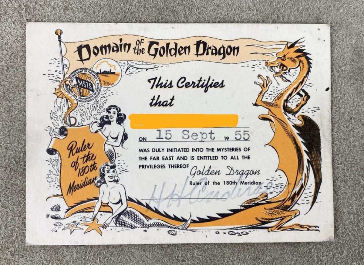 Given to American sailors and military branch members and to crew members of ships which cross the International Date Line here is an original certificate for the Domain of the Golden Dragon...Ruler of the 180th Meridian, issued by the MILITARY SEA TRANSPORTATION SERVICE (MSTS) in 1955...*Name onscured in photos.