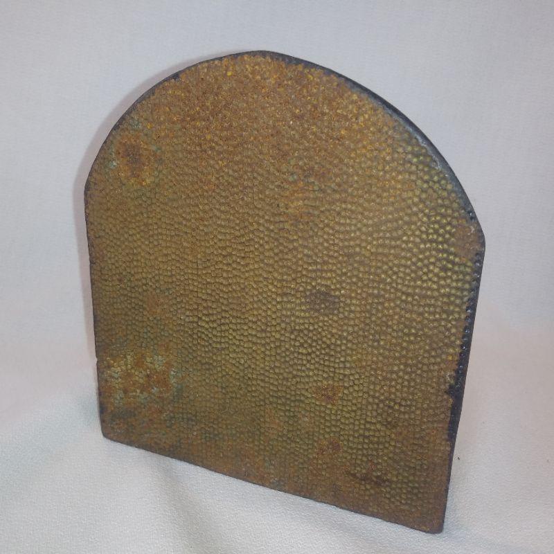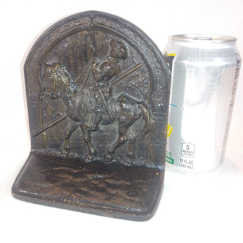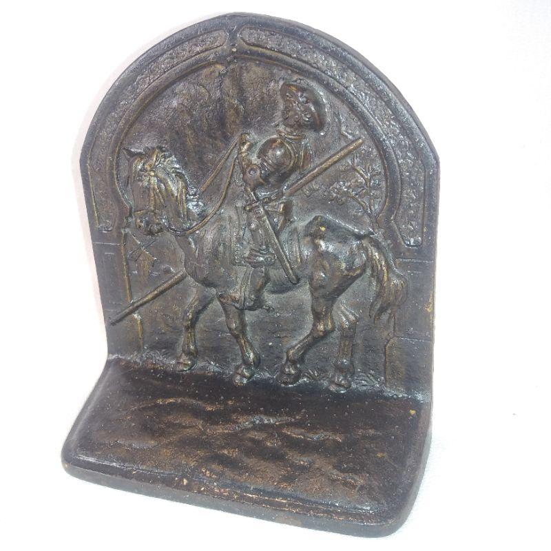 This lot is for a heavy, molded iron, single bookend which stands ready to hold back centuries of literature or hold back most any interior door. Decorated with the likeness of Don Quixote out searching for his windmill this wonderful bookend will serve your purposes and more. It stands 5 3/4-inches tall X 5-inches wide. Very good.
