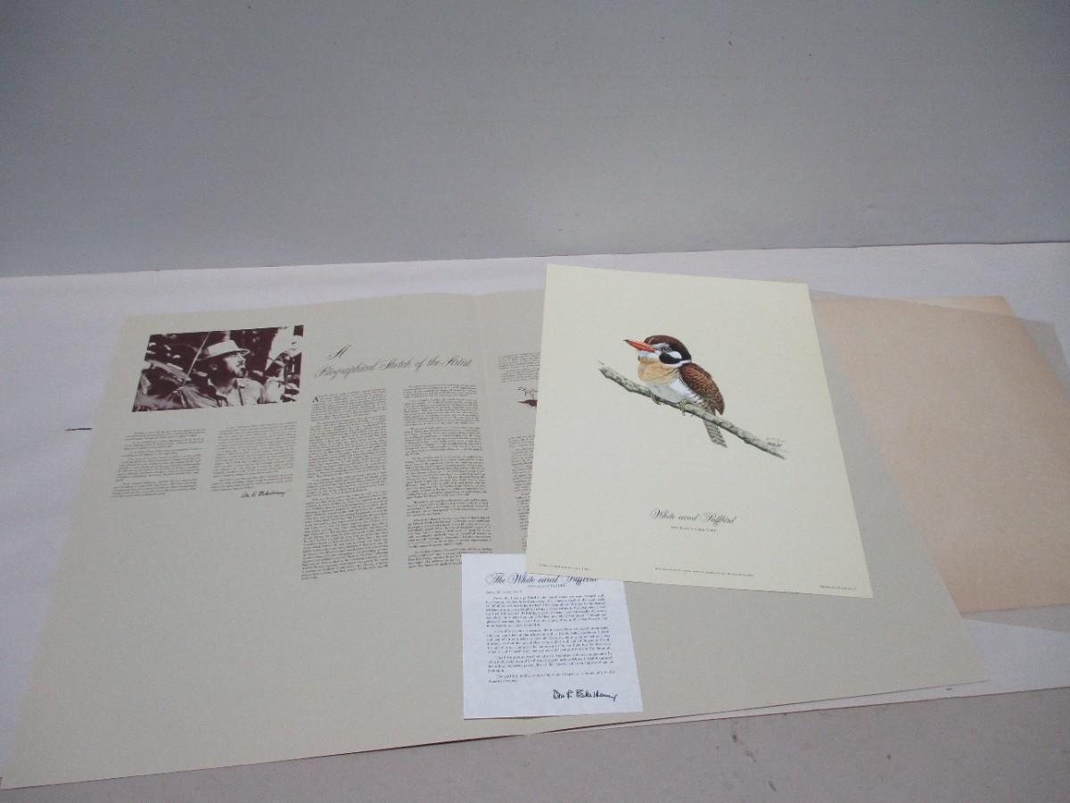 Depicted is a white eared puffbird sitting on a branch in nature - Offset Lithograph on paper - sight size 15.5"w x 19.5"h