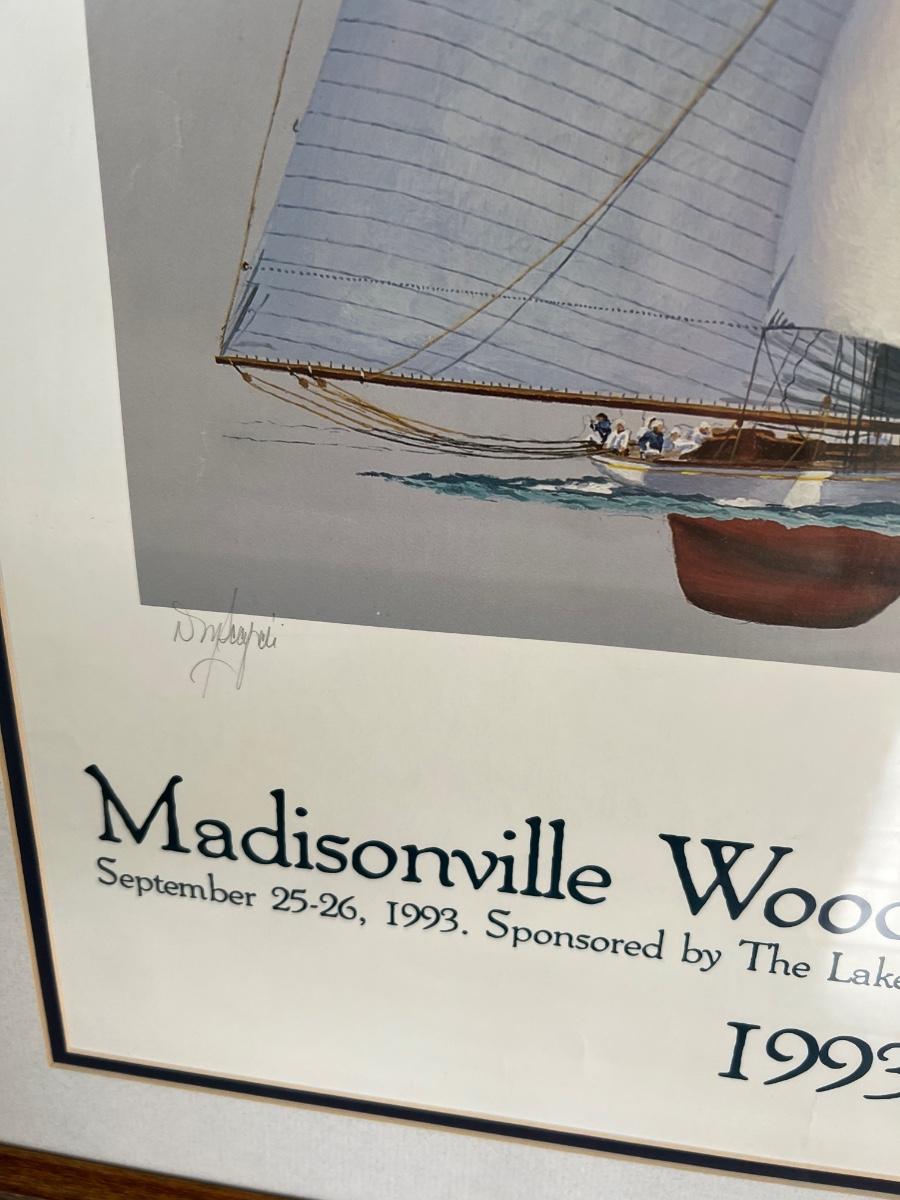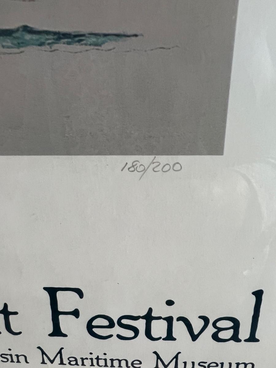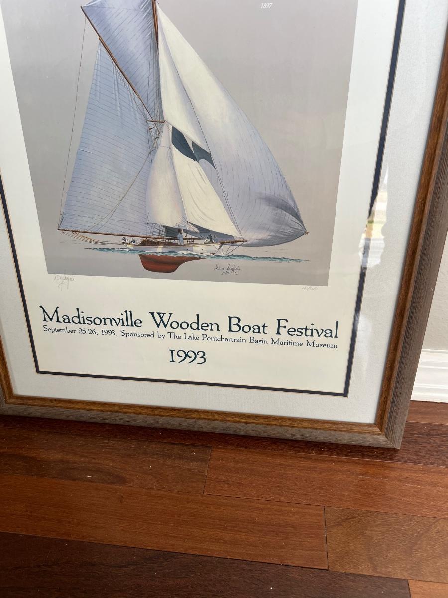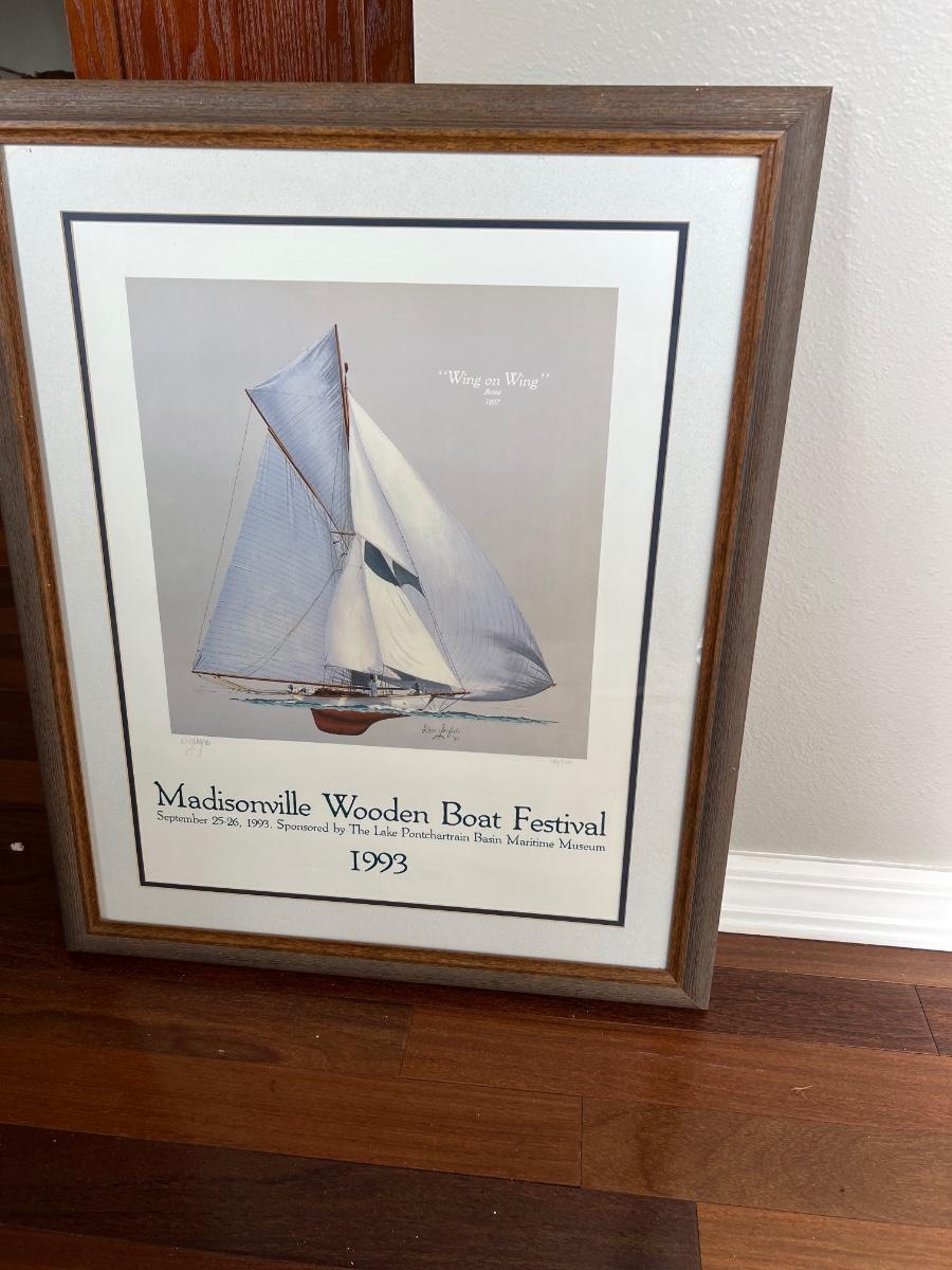 DON SCOFIDI SIGNED & NUMBERED Wings On Wings, Madisonville Wooden Boat, Festival, 1993. Numbered 180/200. Measures 29 inches tall and 24 inches wide.