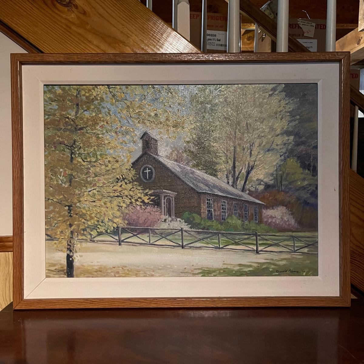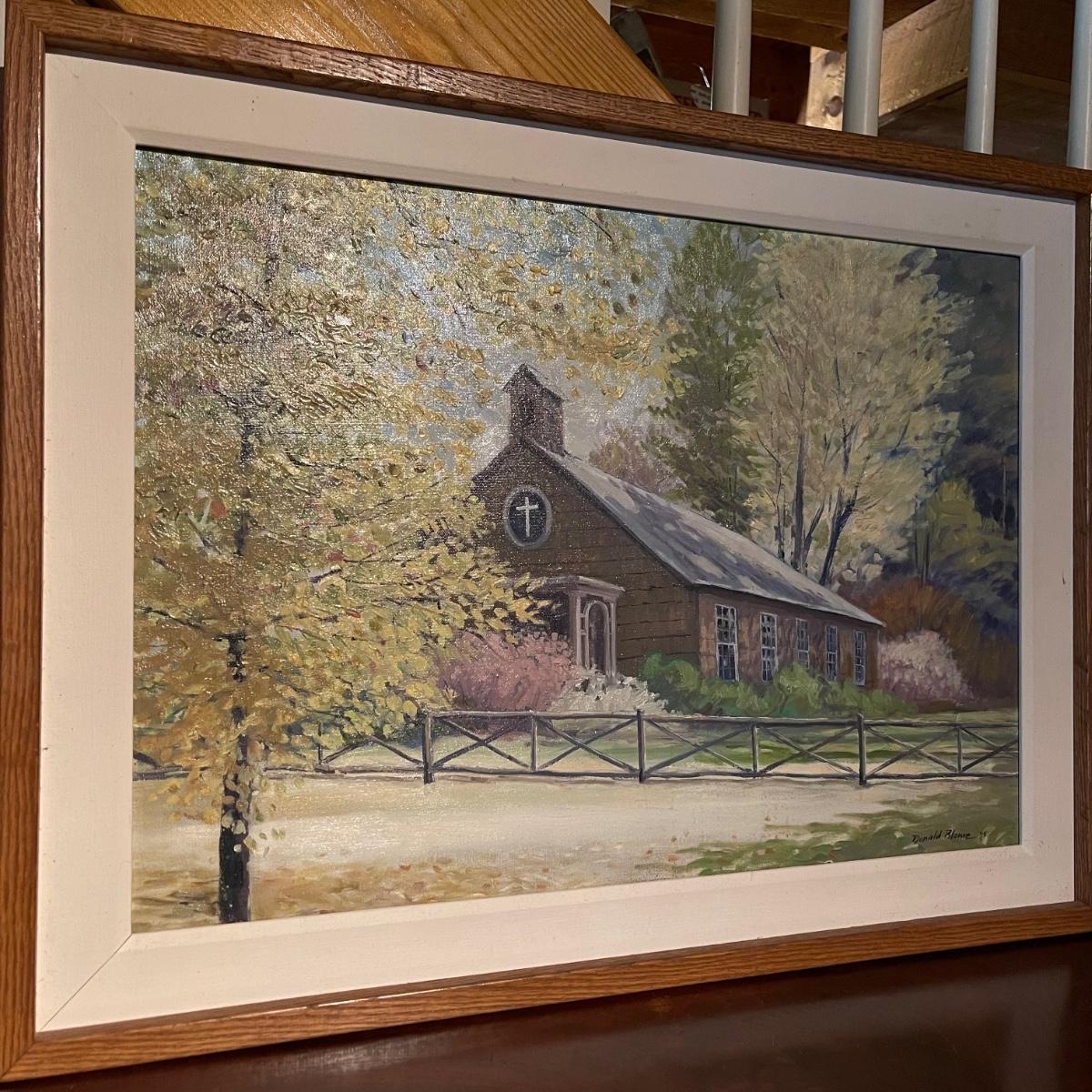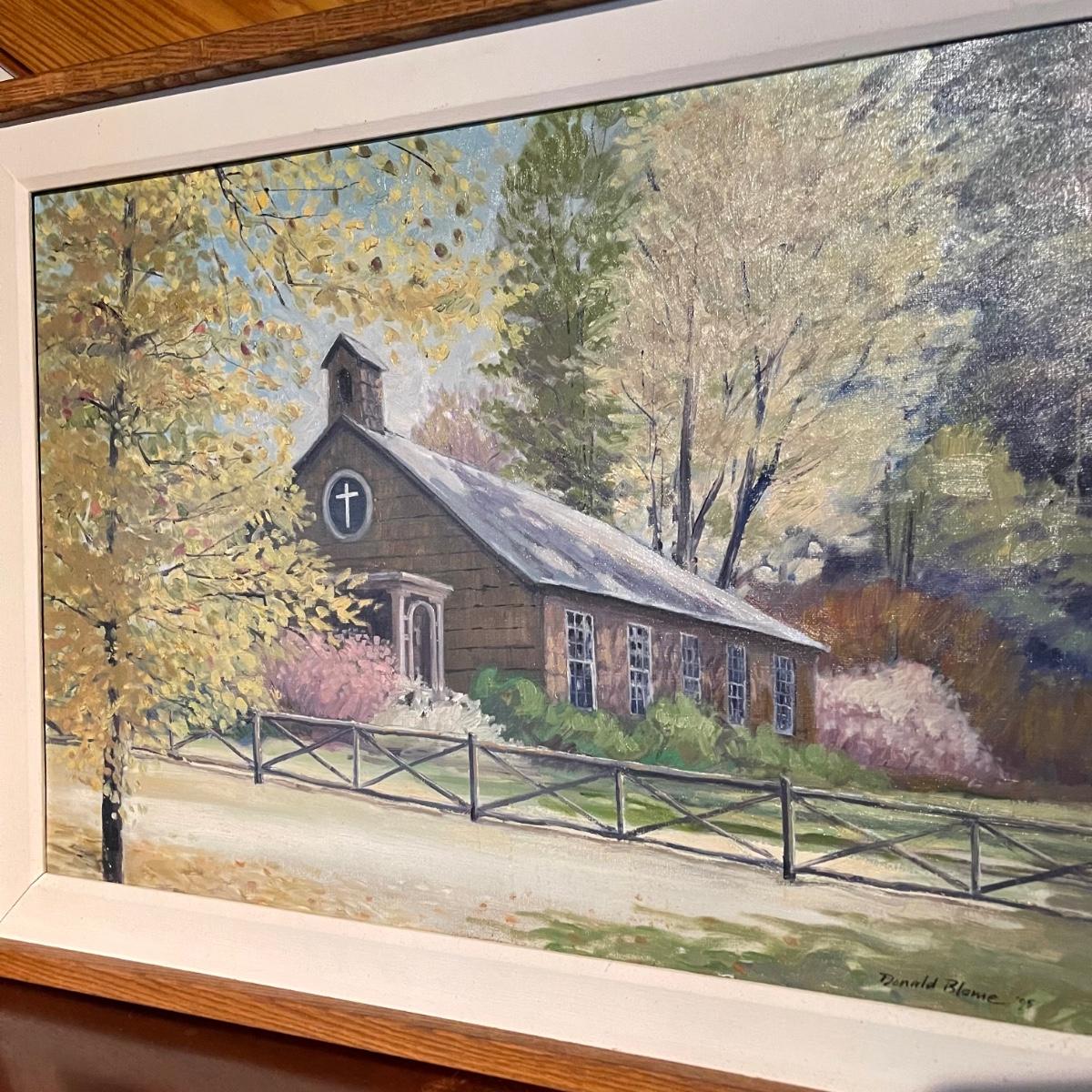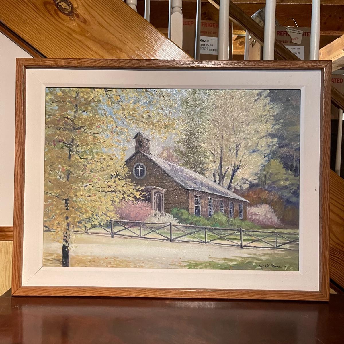 This painting of a church, presumably in springtime, is by local Asheville artist, Donald Blome, who has since passed away. The painting is 22.5” x 29.5” and, with the frame, has a thickness of 2”. The signature in the bottom corner says “Donald Blome “˜95”.