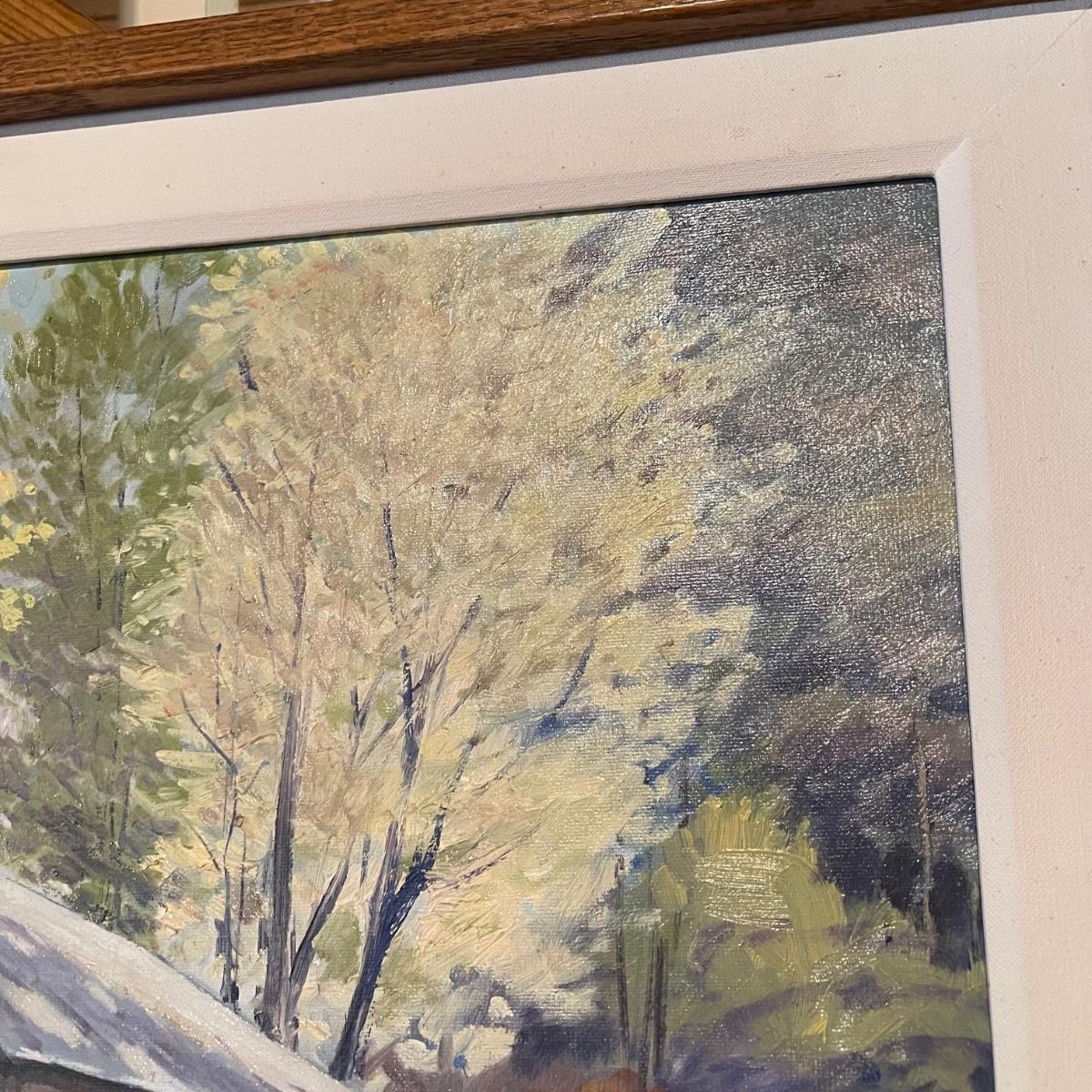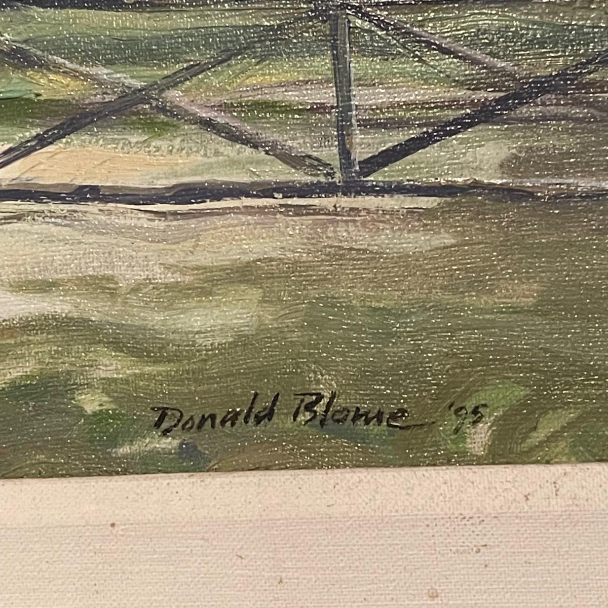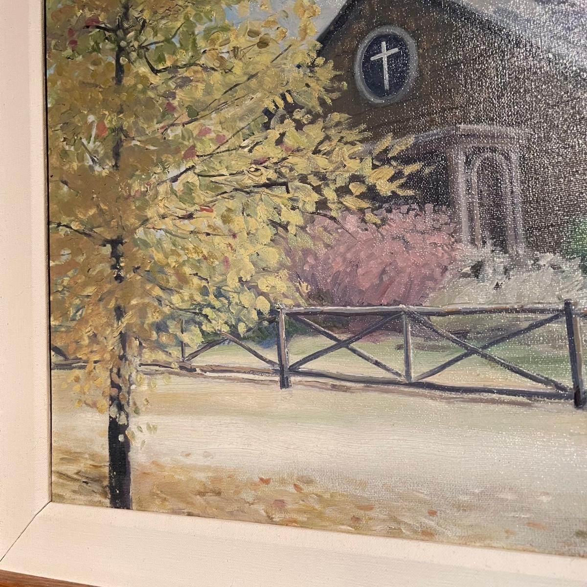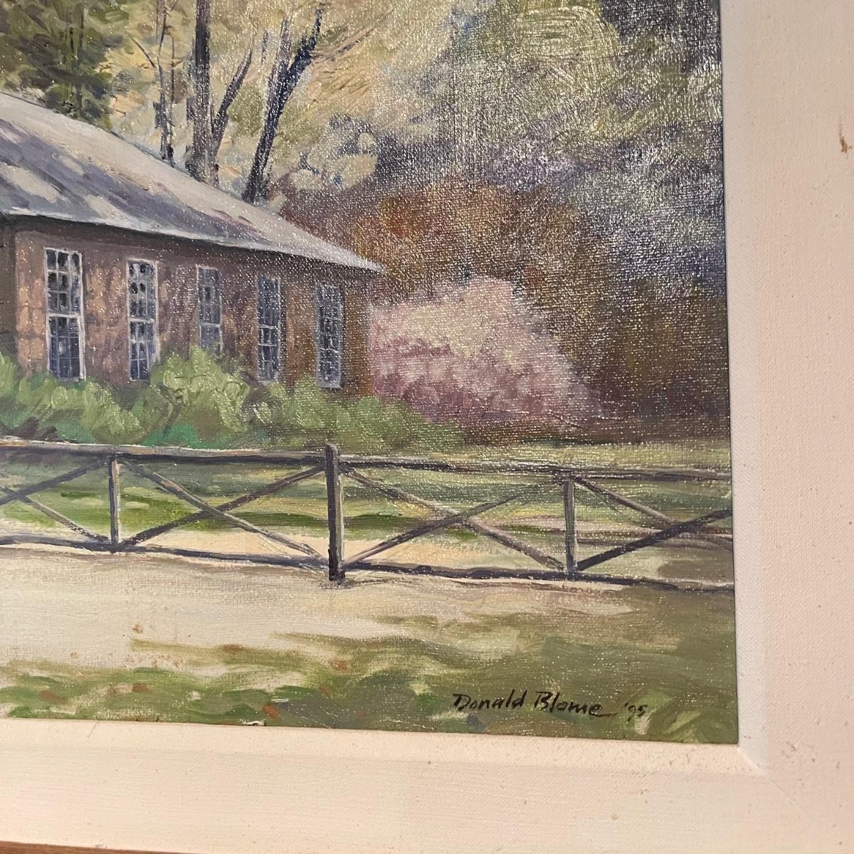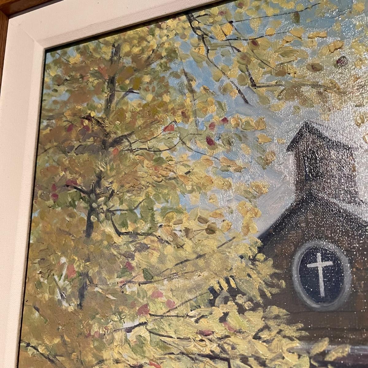This painting of a church, presumably in springtime, is by local Asheville artist, Donald Blome, who has since passed away. The painting is 22.5” x 29.5” and, with the frame, has a thickness of 2”. The signature in the bottom corner says “Donald Blome “˜95”.