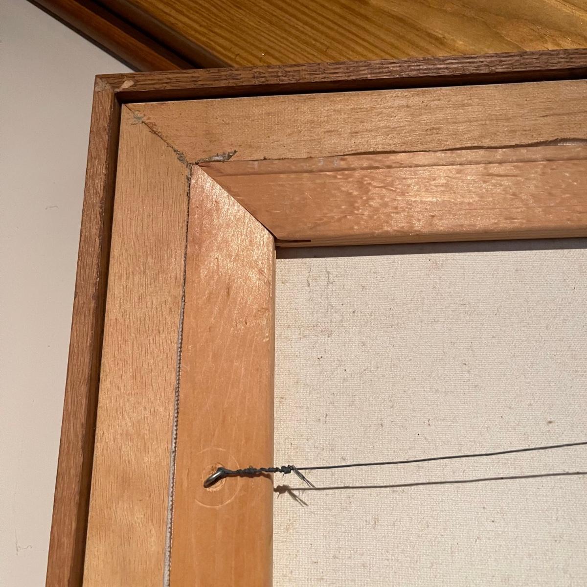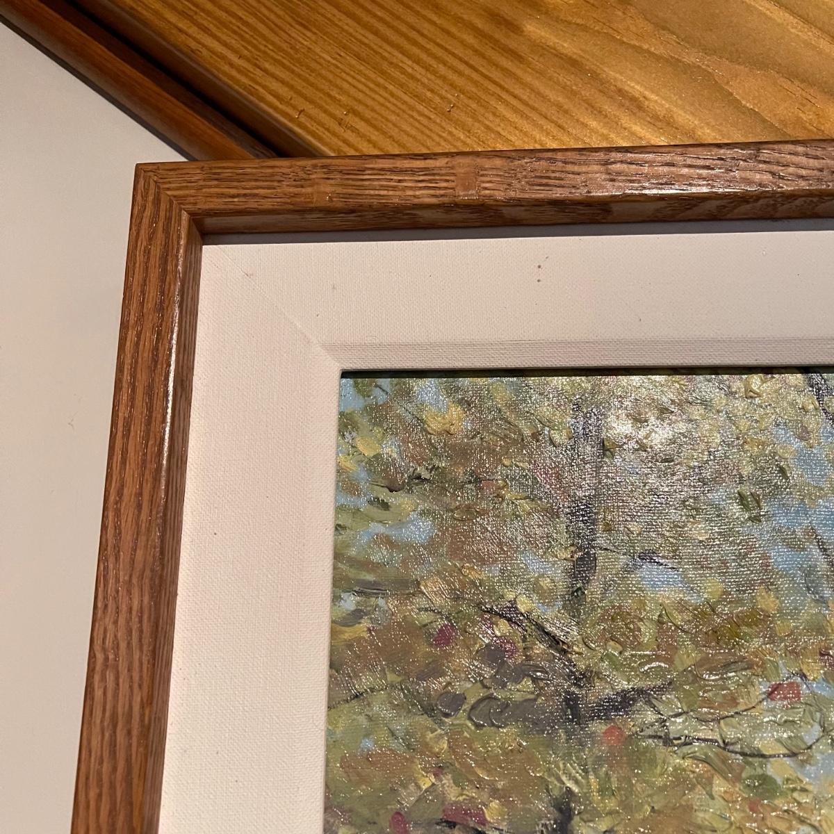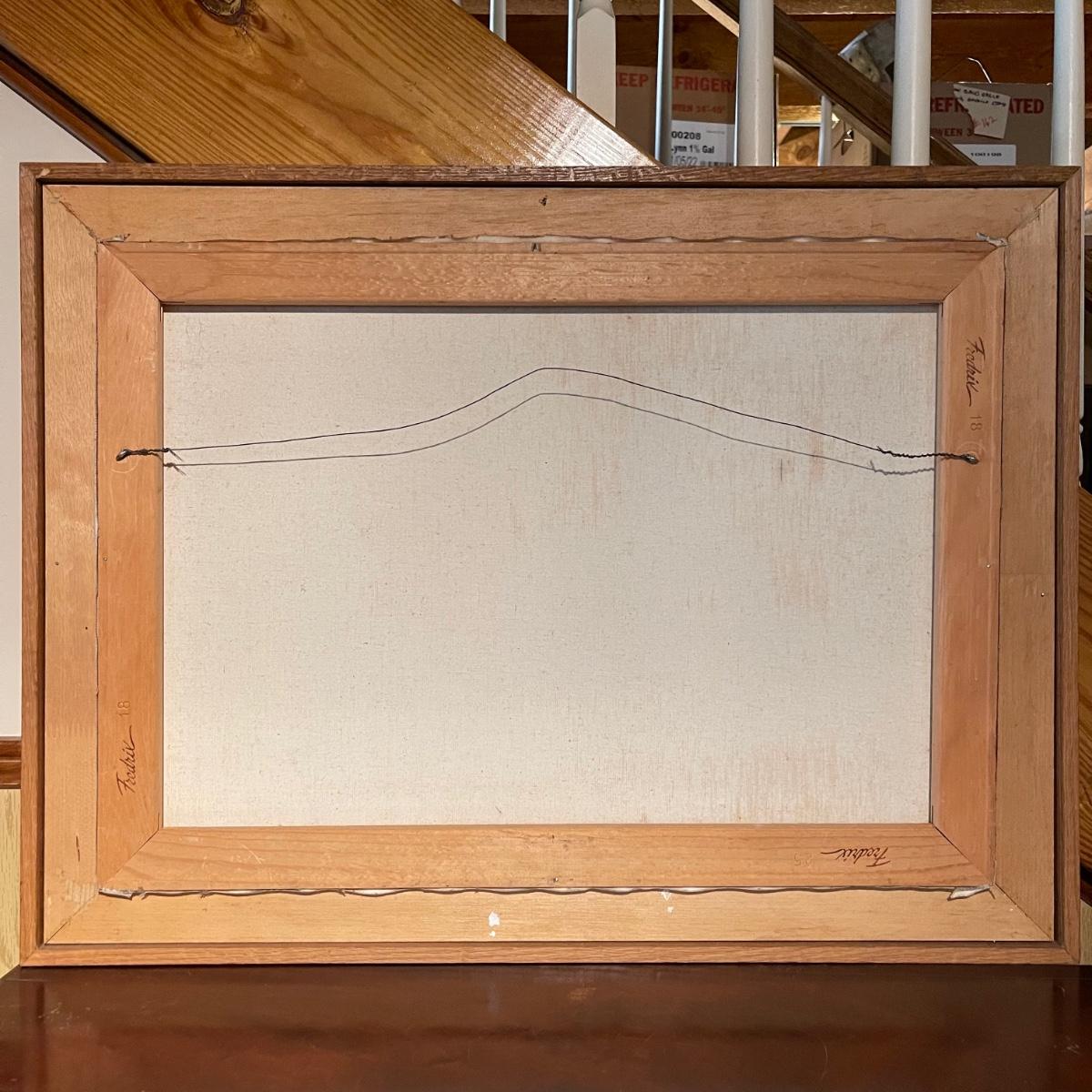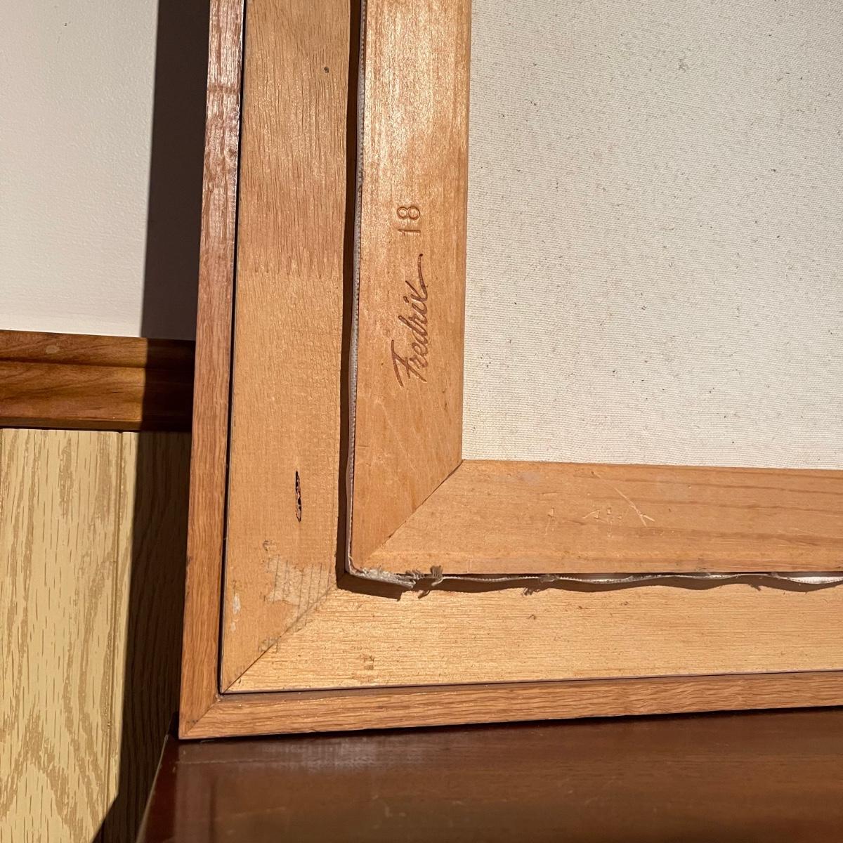 This painting of a church, presumably in springtime, is by local Asheville artist, Donald Blome, who has since passed away. The painting is 22.5” x 29.5” and, with the frame, has a thickness of 2”. The signature in the bottom corner says “Donald Blome “˜95”.