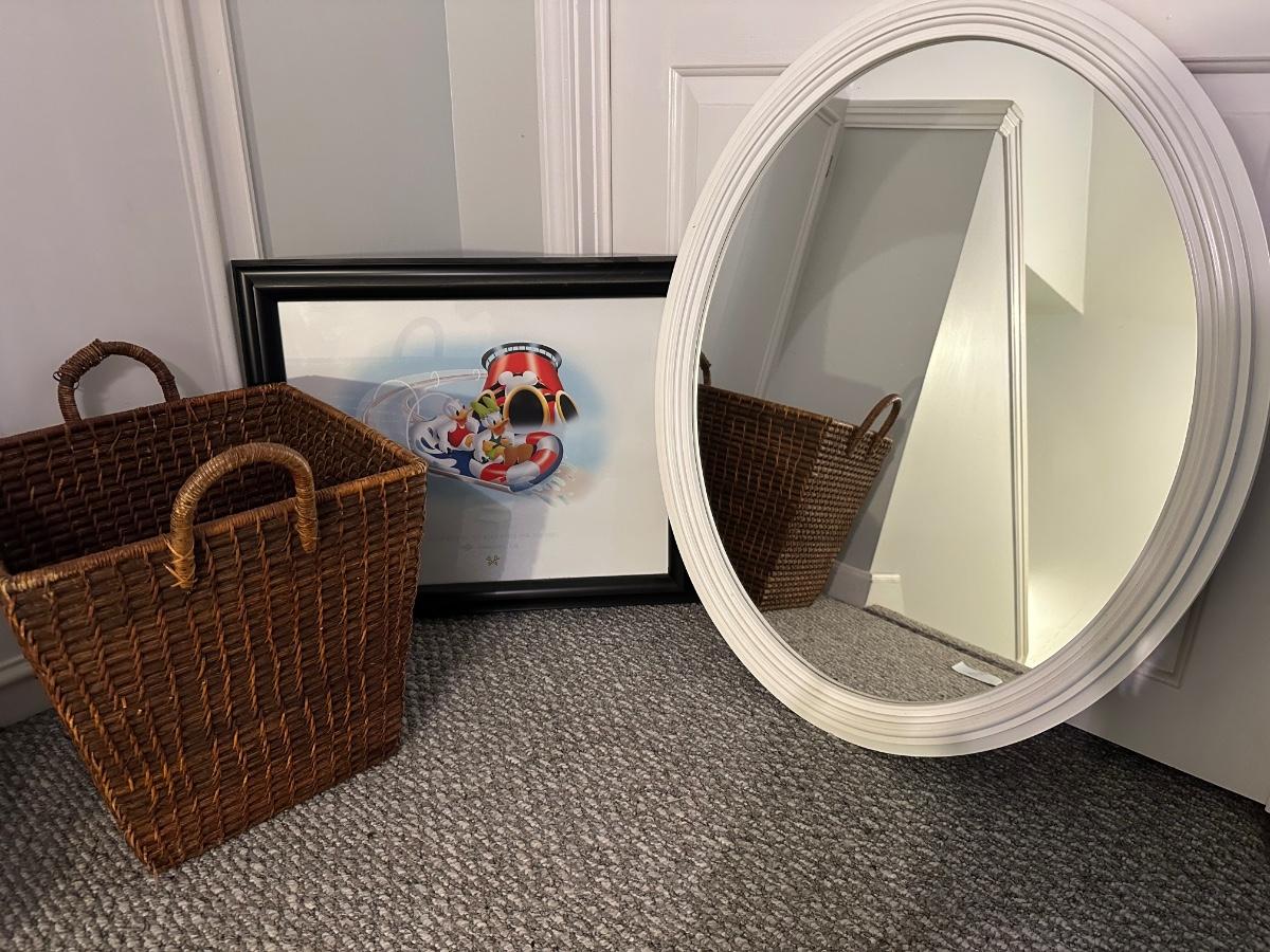 DONALD DUCK FRAMED ART, MIRROR, BASKET