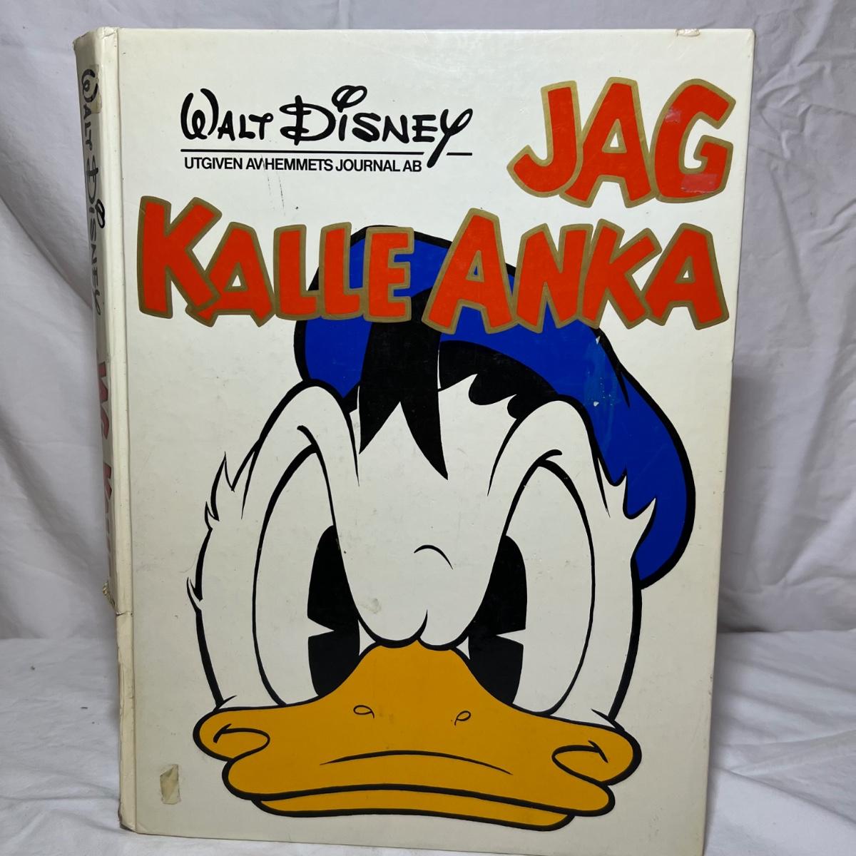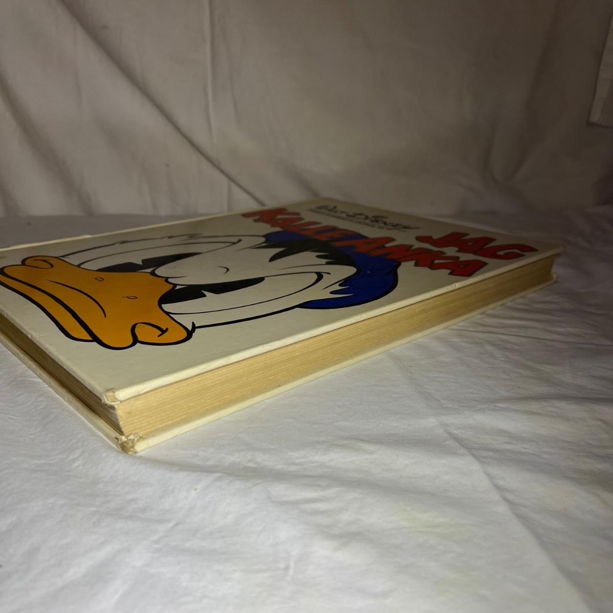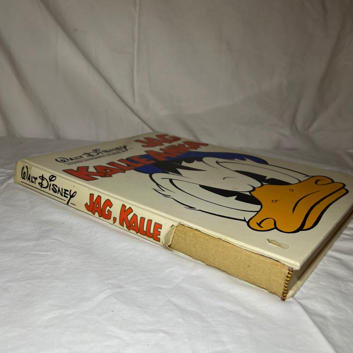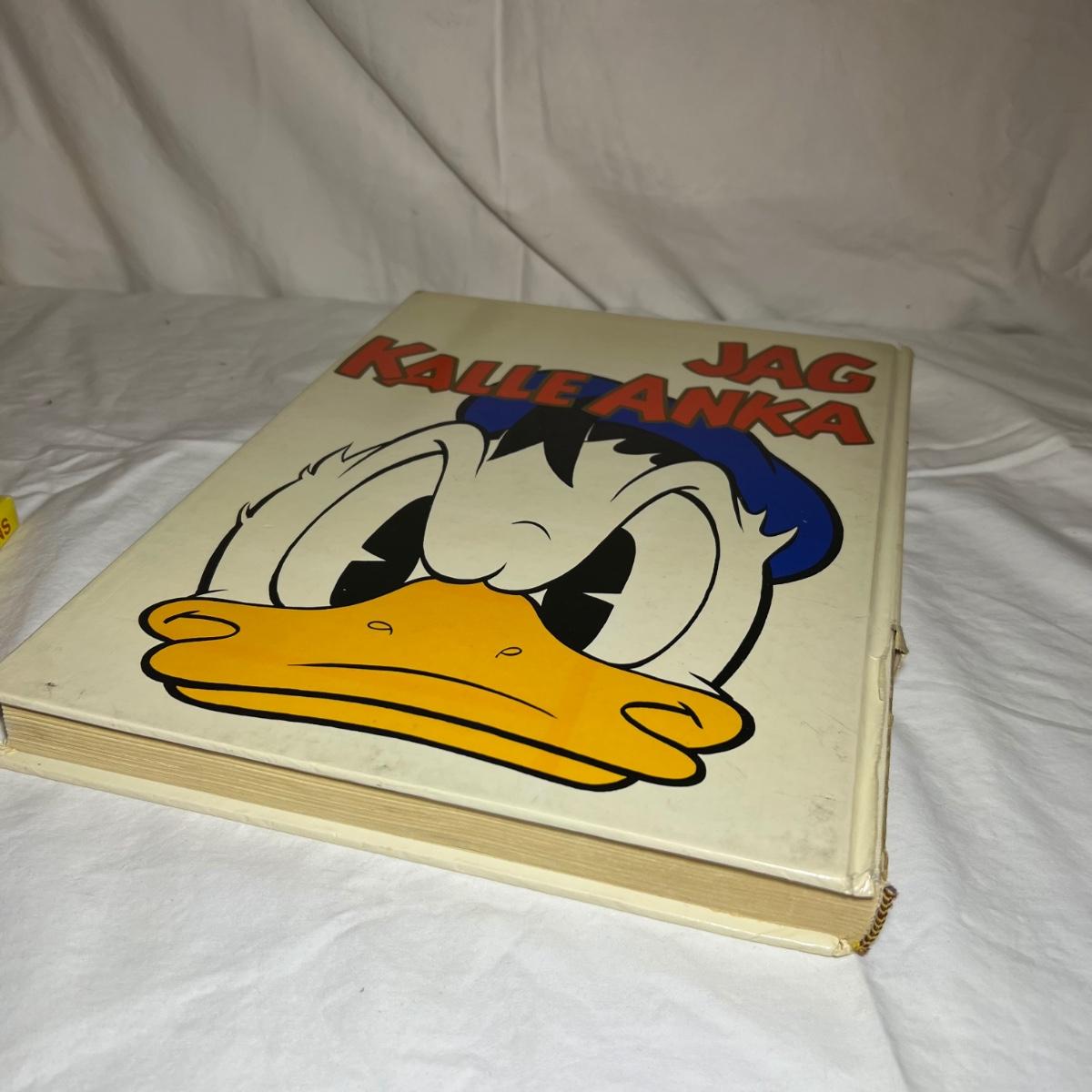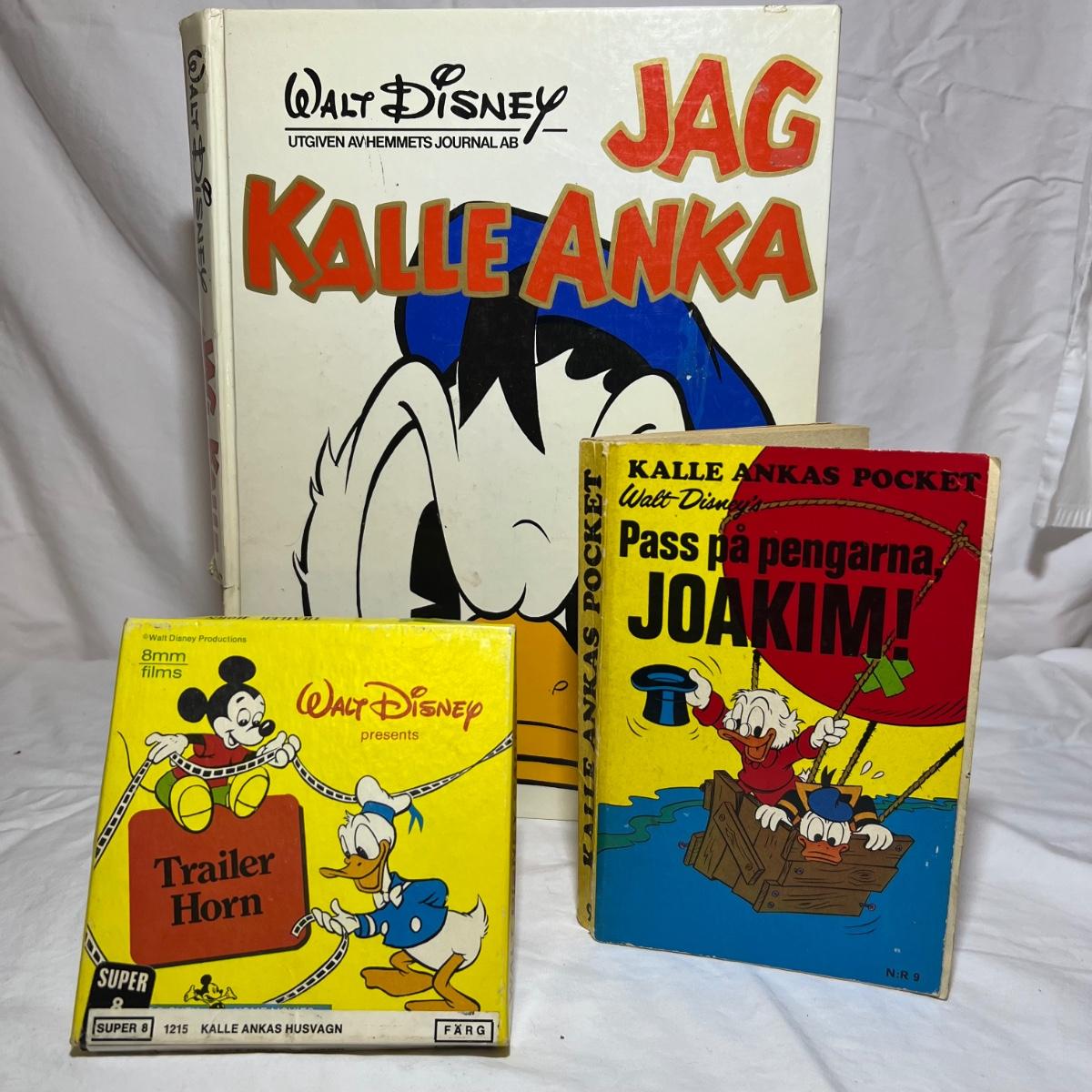 Three Walt Disney ‘Donald Duck’ vintage collectibles. The large hardback book and the paperback appear to be Swedish; see images for condition. The 8mm film has both English and Swedish writing on its case, so we are unsure what language it is in.