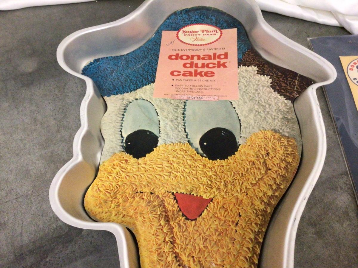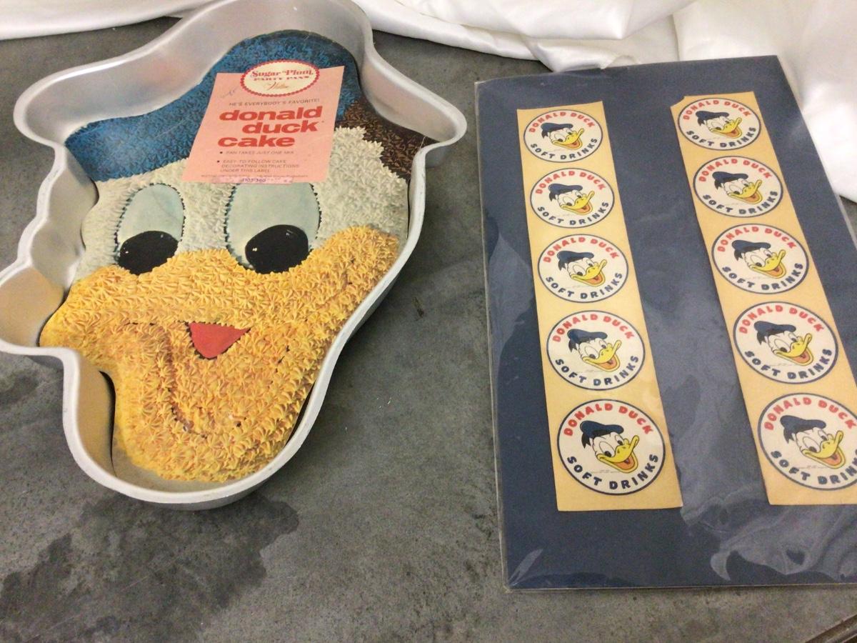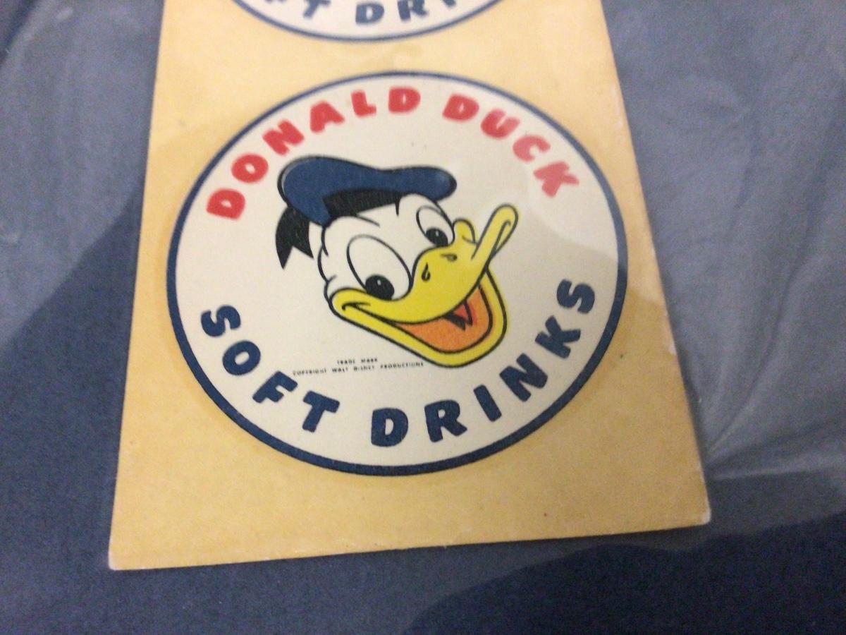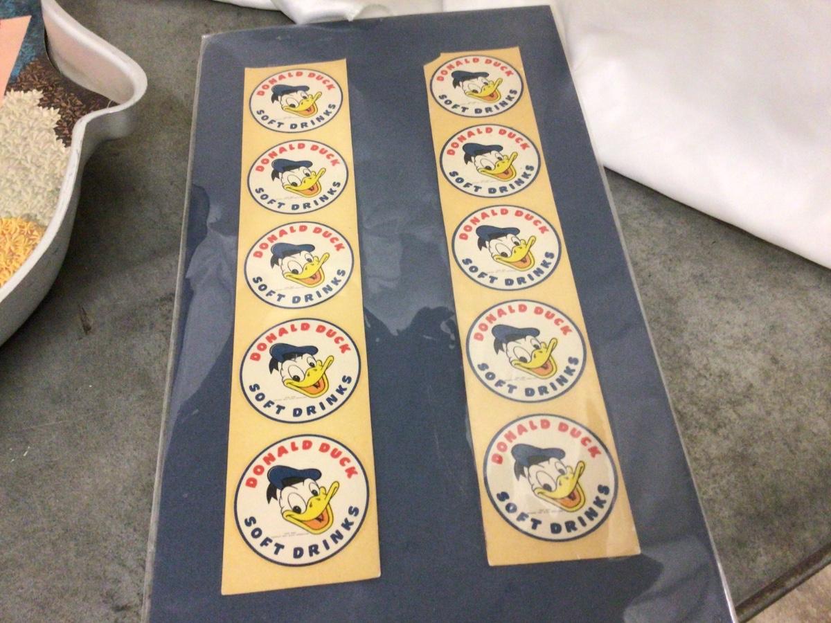 This is a great lot of Donald Duck. You get two strips of 5 very rare Donald Duck Soft Drink stickers and an aluminum cake pan.