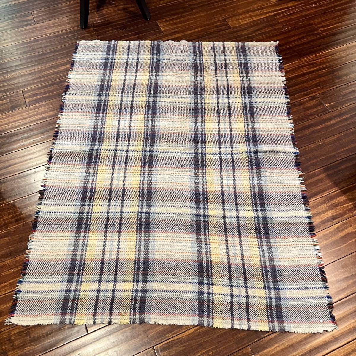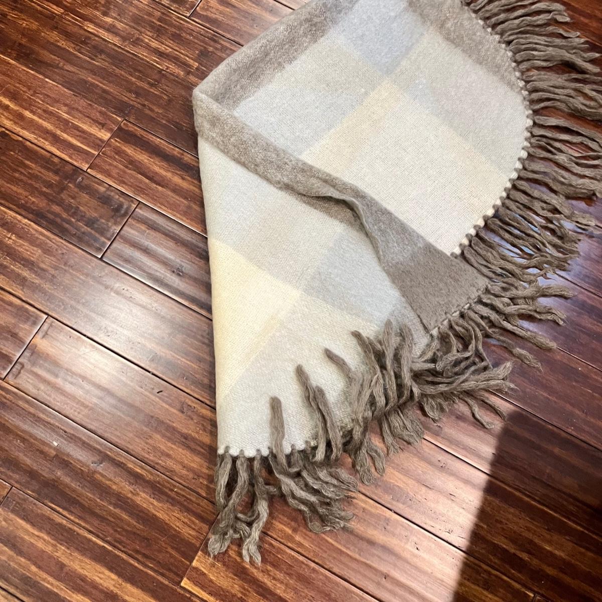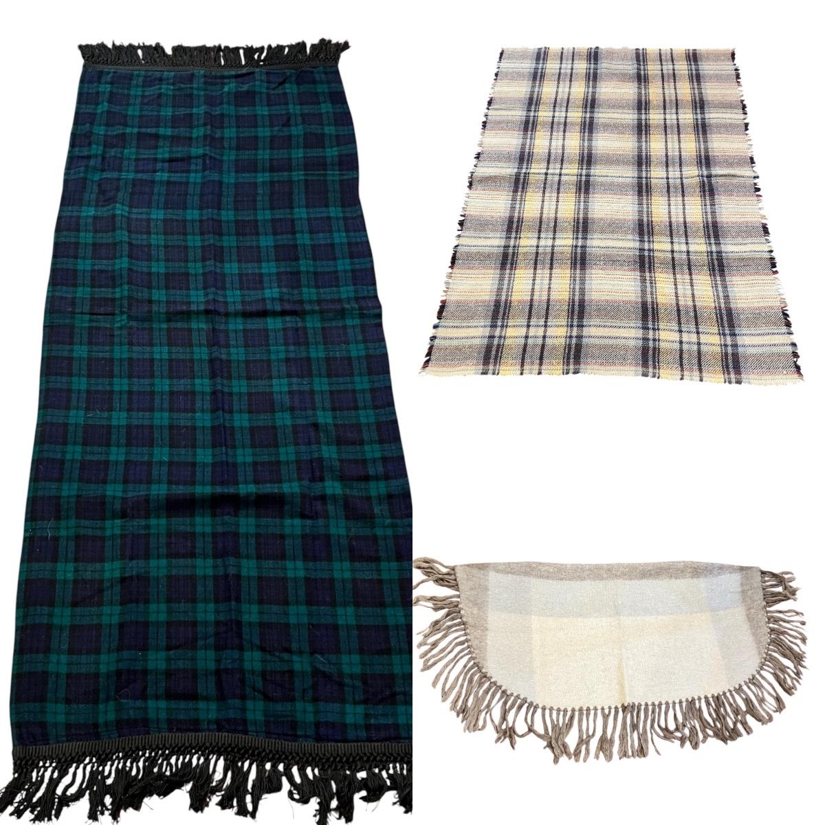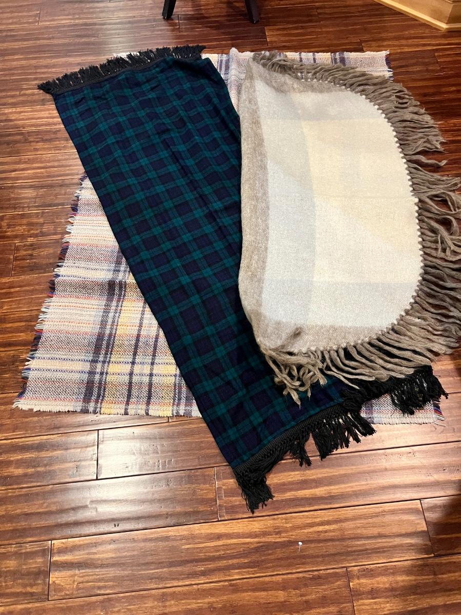 Three wool blankets. One of the three does not have a label, this is the blue tartan blanket; it appears to be wool and it also has a black lining. See photos for labels.