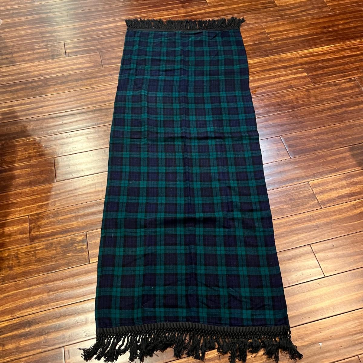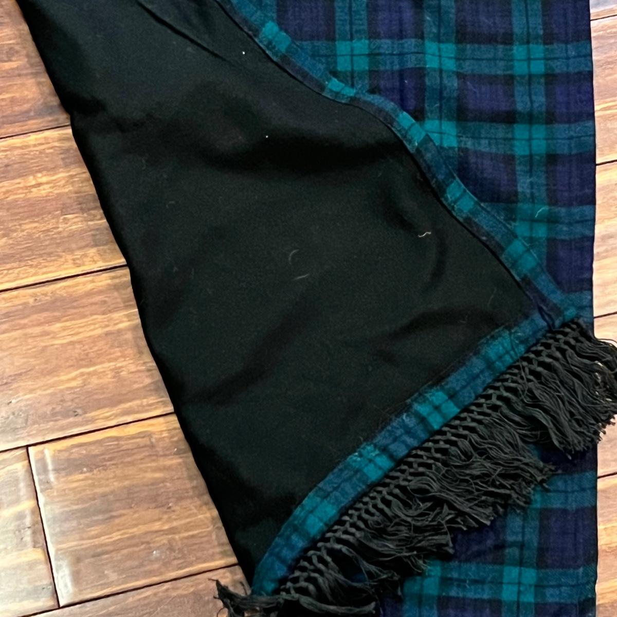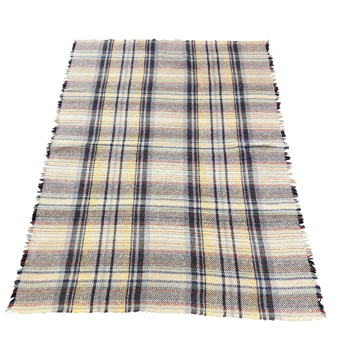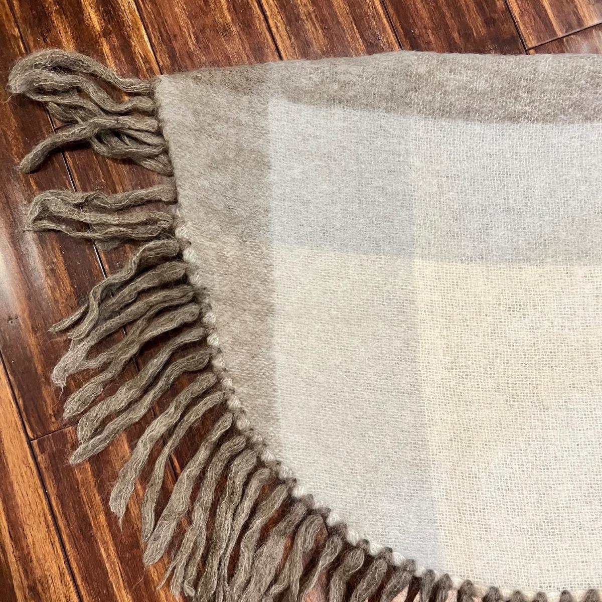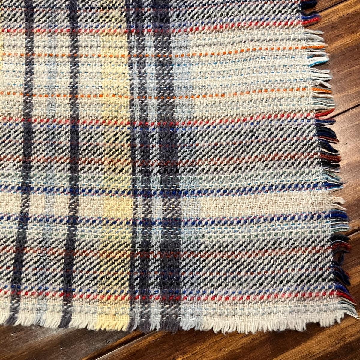 Three wool blankets. One of the three does not have a label, this is the blue tartan blanket; it appears to be wool and it also has a black lining. See photos for labels.