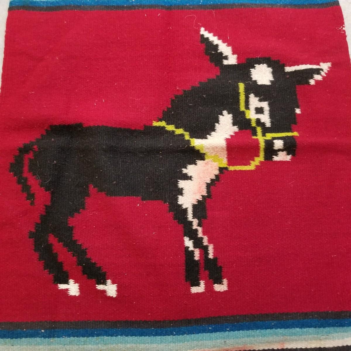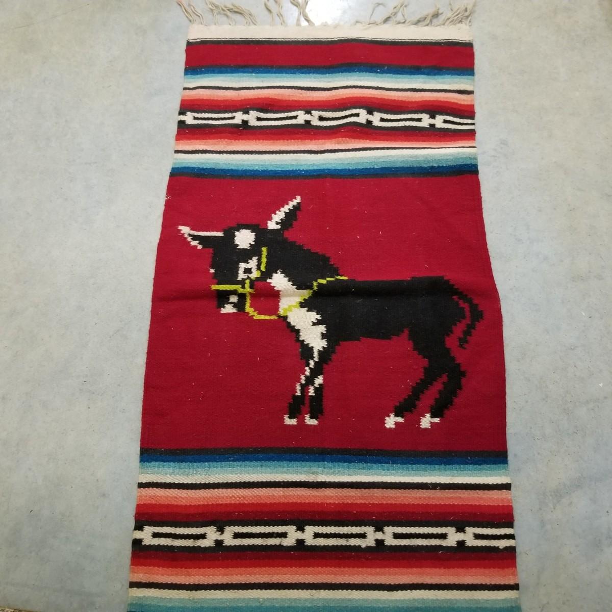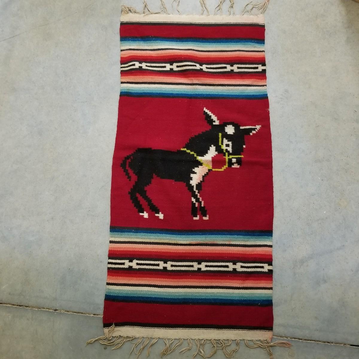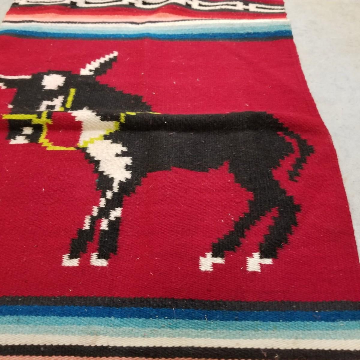 A whimsical donkey on a red background, this woven wool rug is 21"x51" with fringed ends. Some minor discoloration.  See photos for detail.  Shipping available.