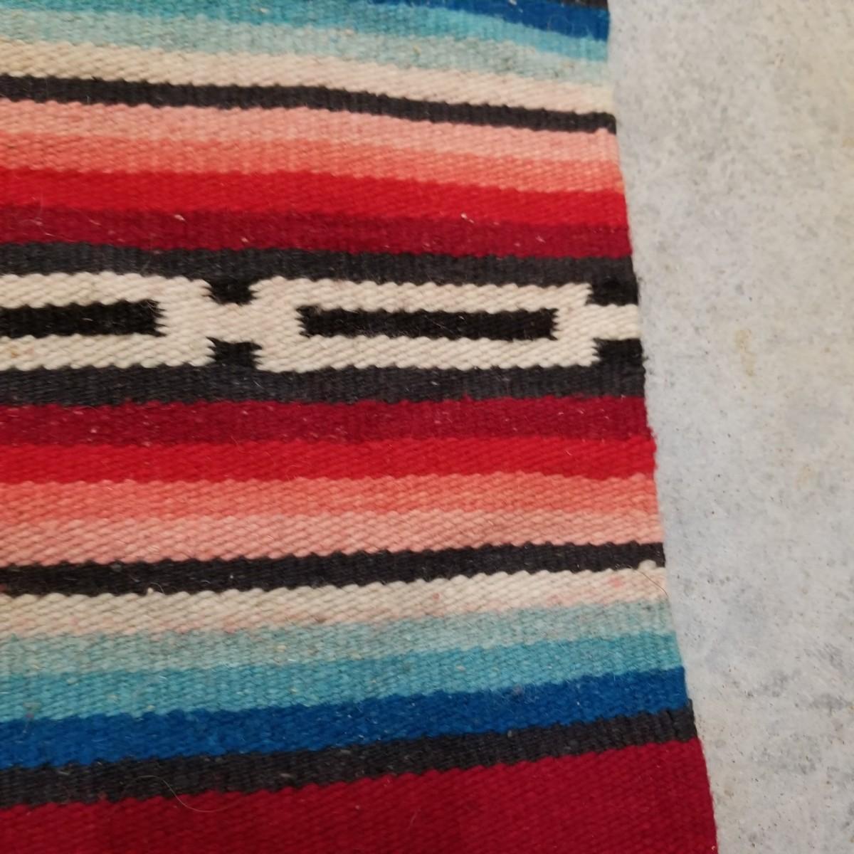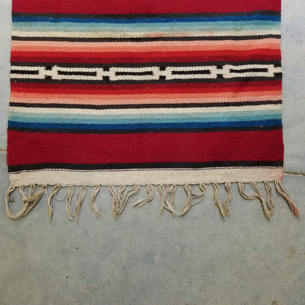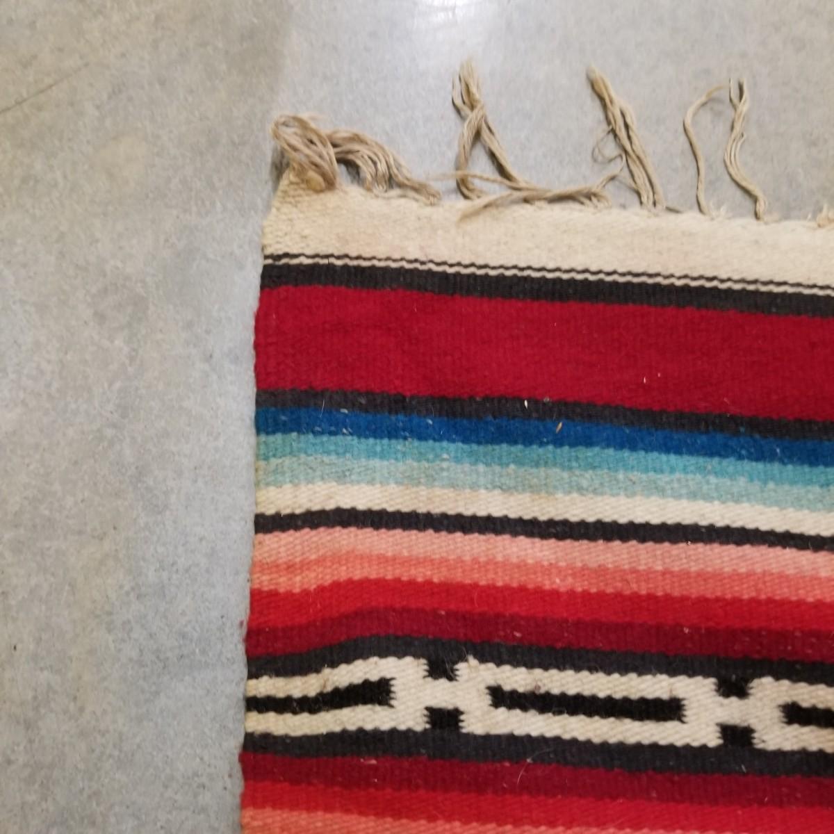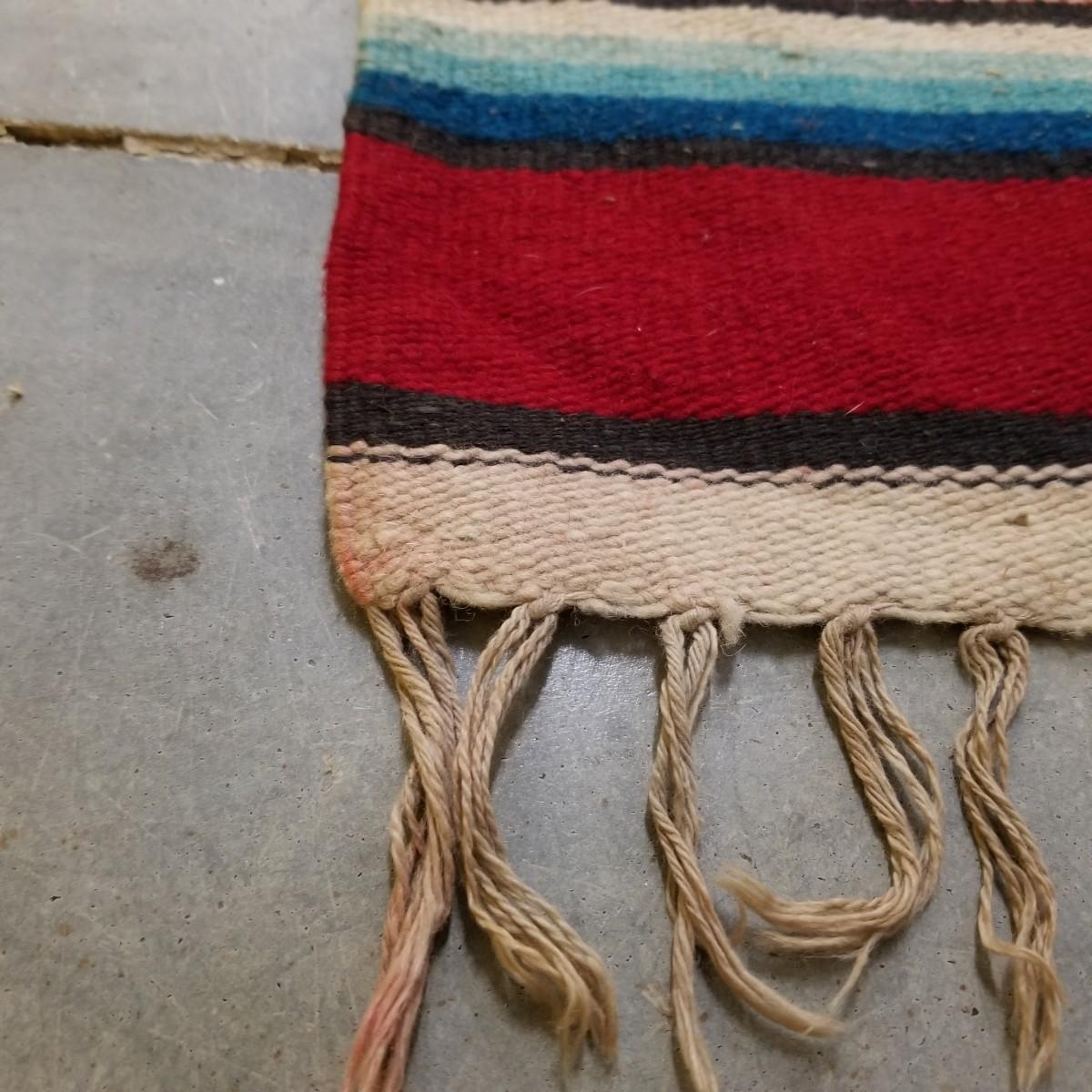 A whimsical donkey on a red background, this woven wool rug is 21"x51" with fringed ends. Some minor discoloration.  See photos for detail.  Shipping available.
