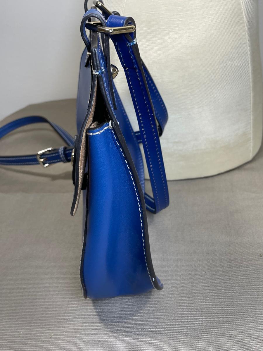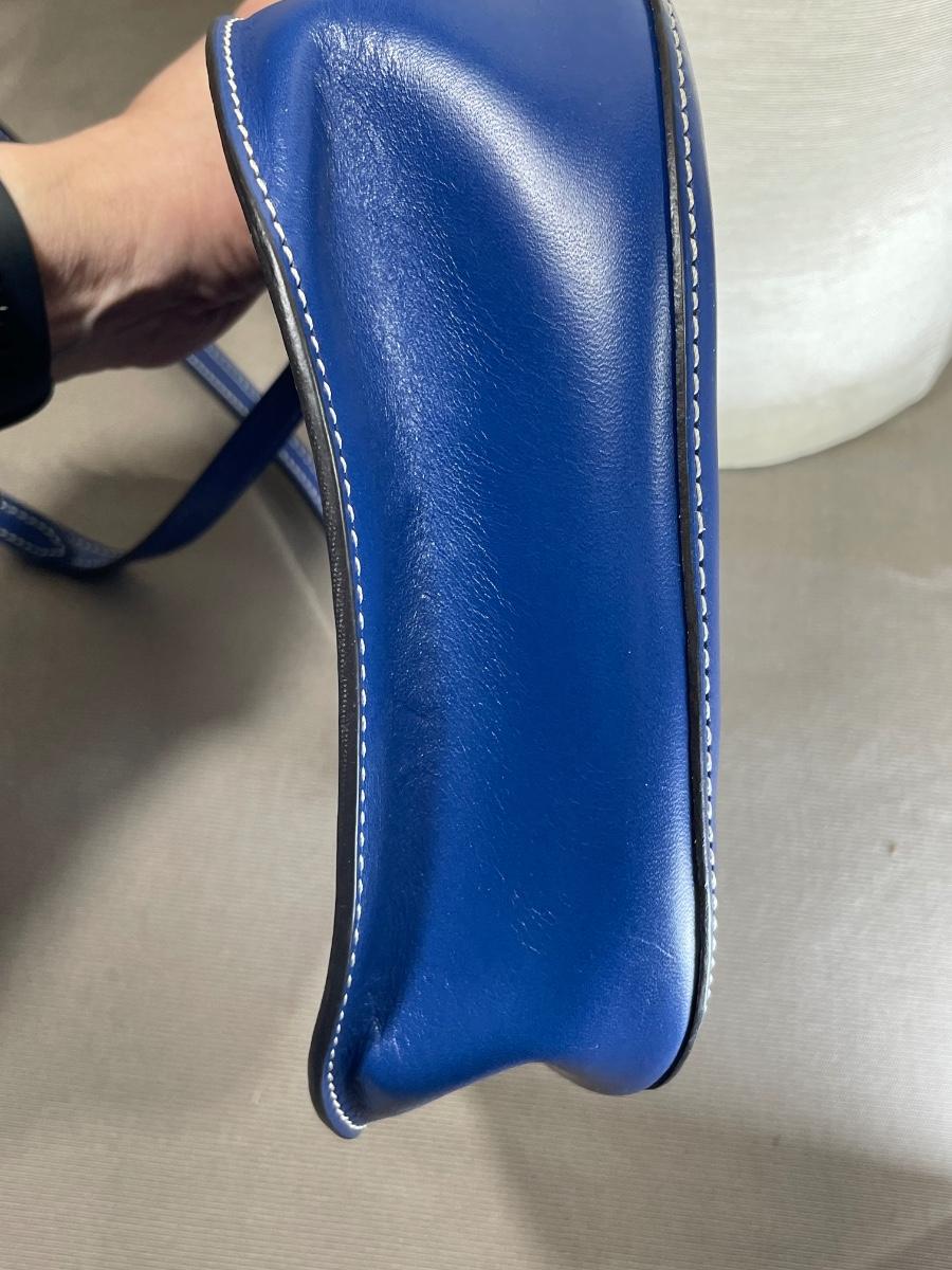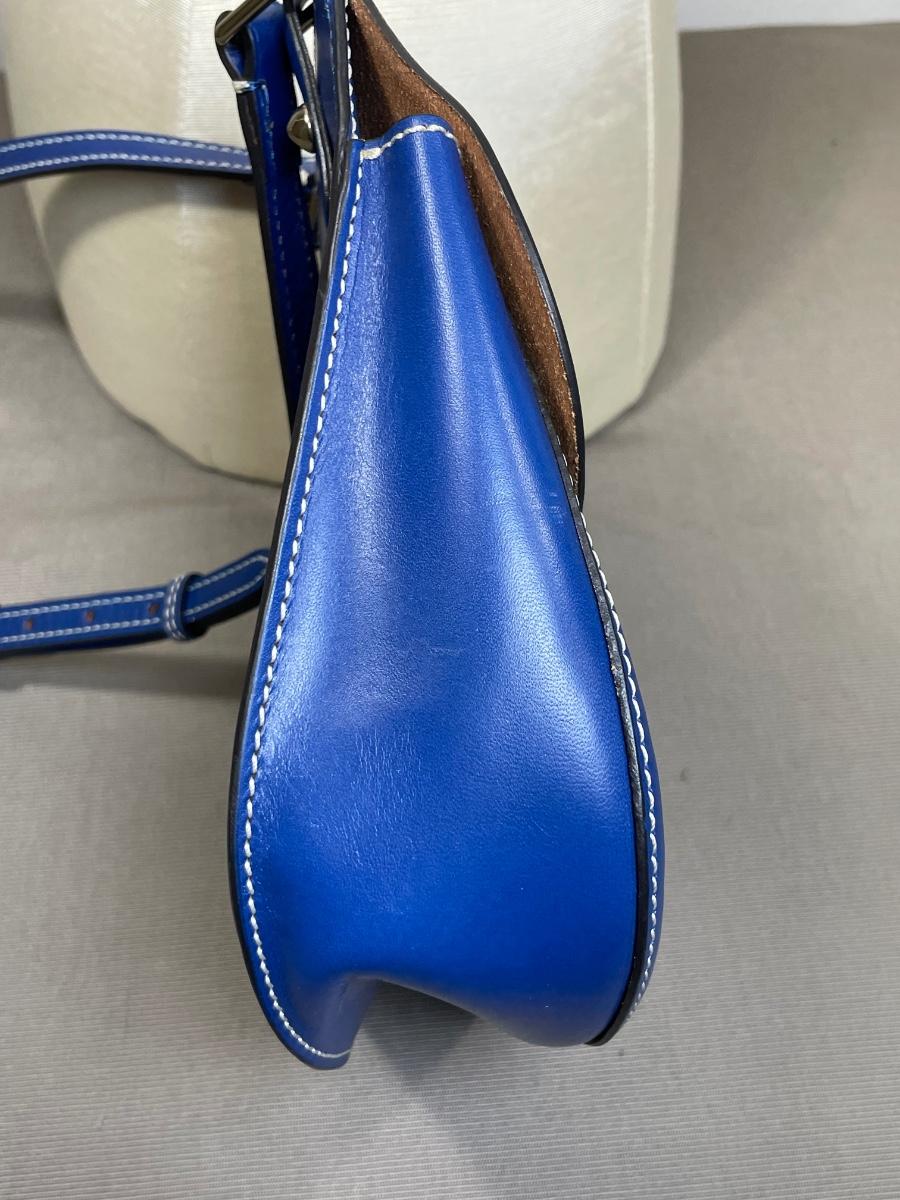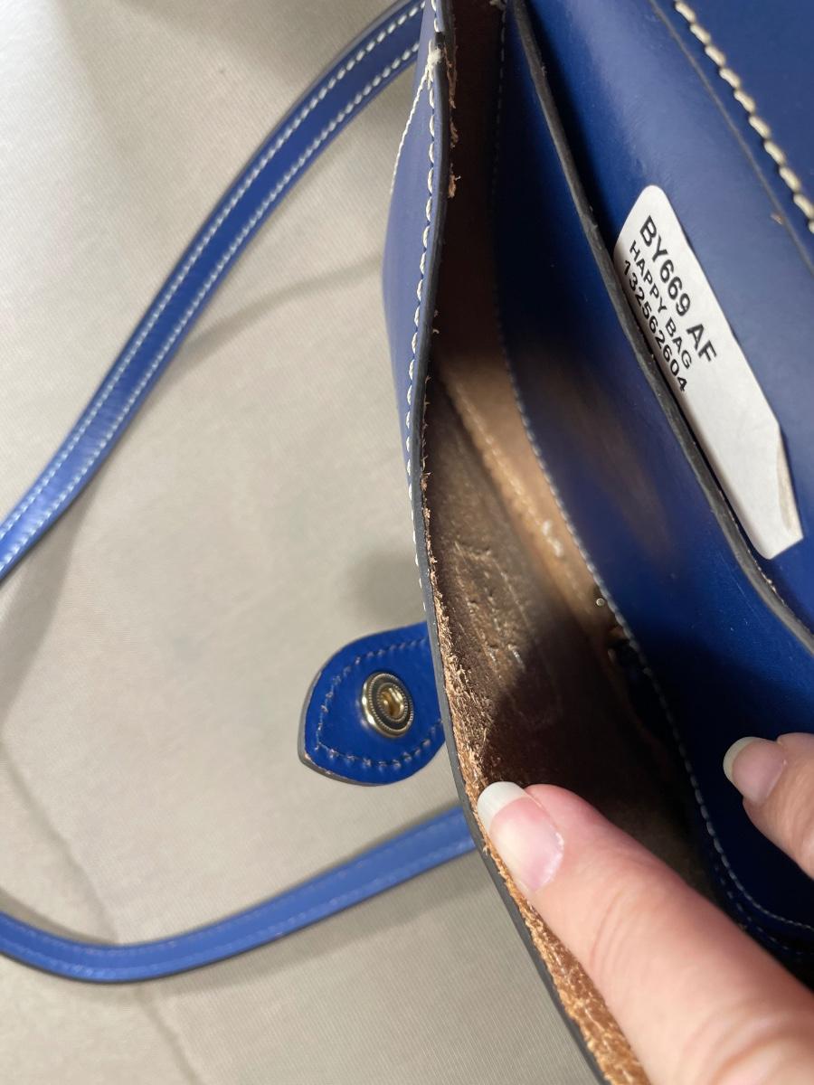 NWOT blue leather “Happy Bag” with long crossbody strap.
