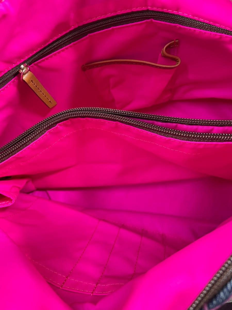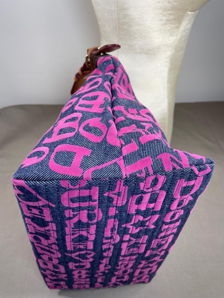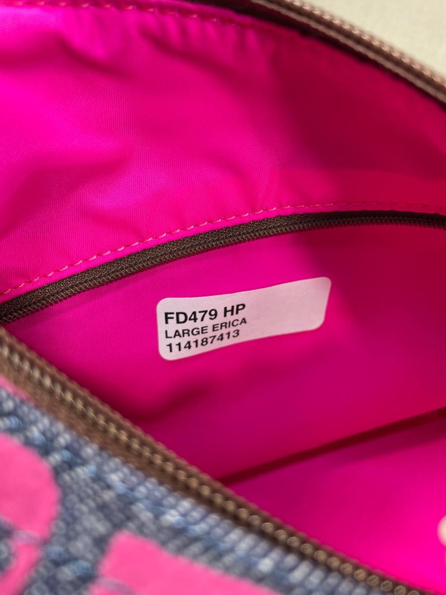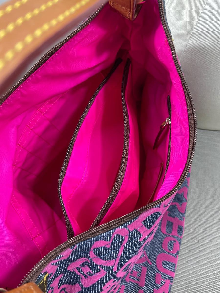 Large Erica denim fabric bag with hot pink logos and interior. Leather straps. NWOT 14” by 10” by 7” Excellent condition.
