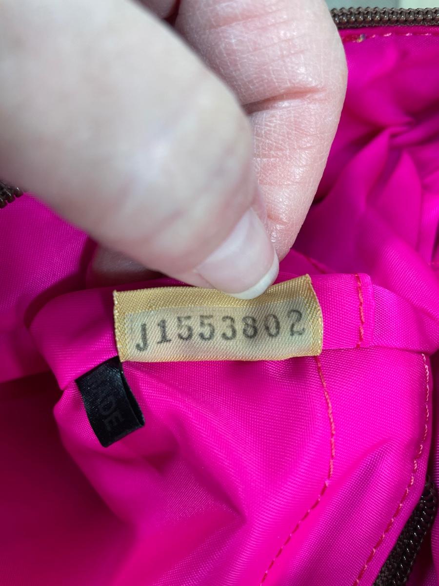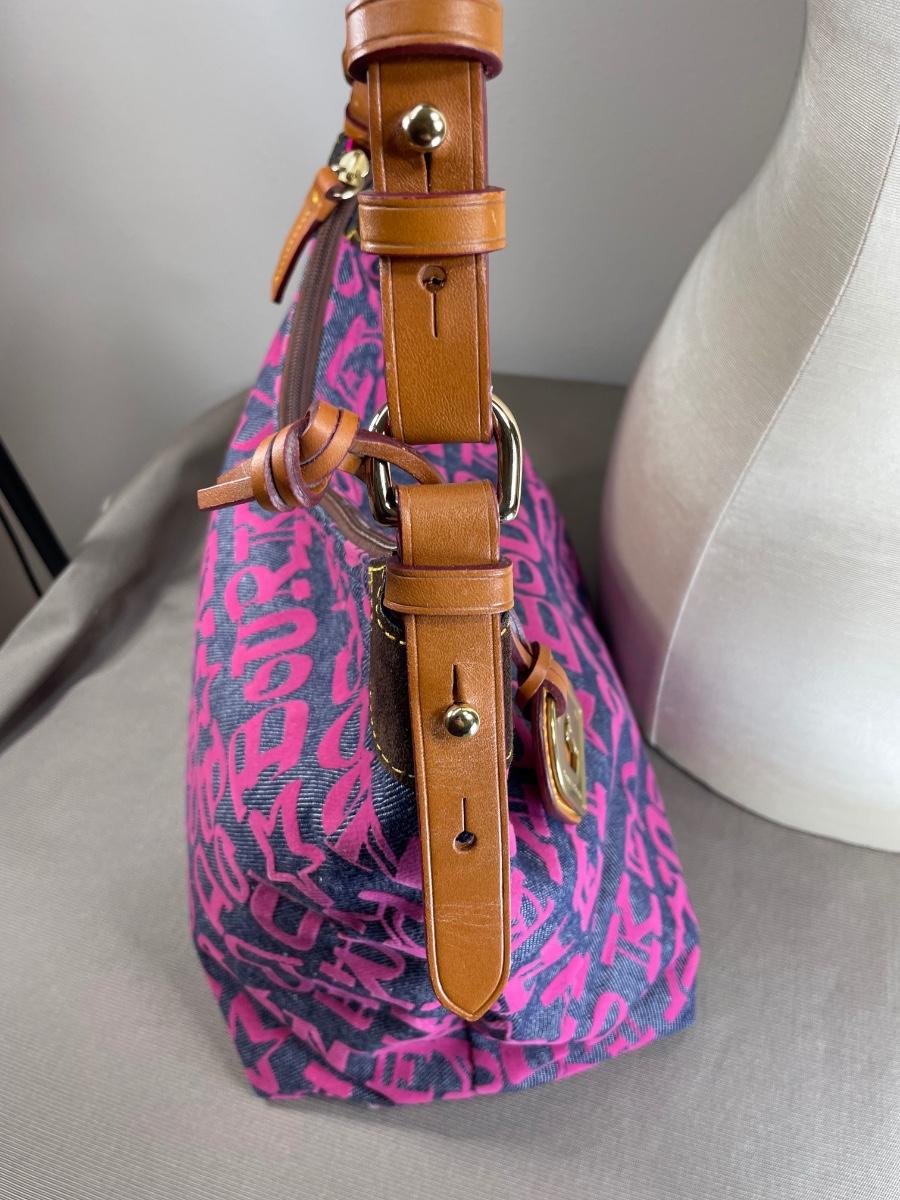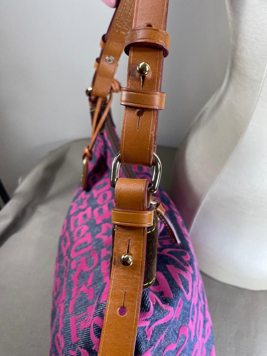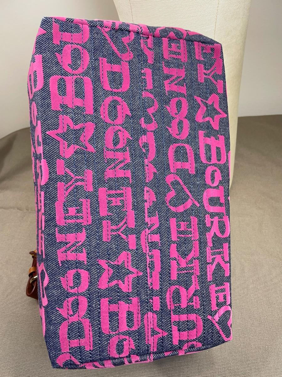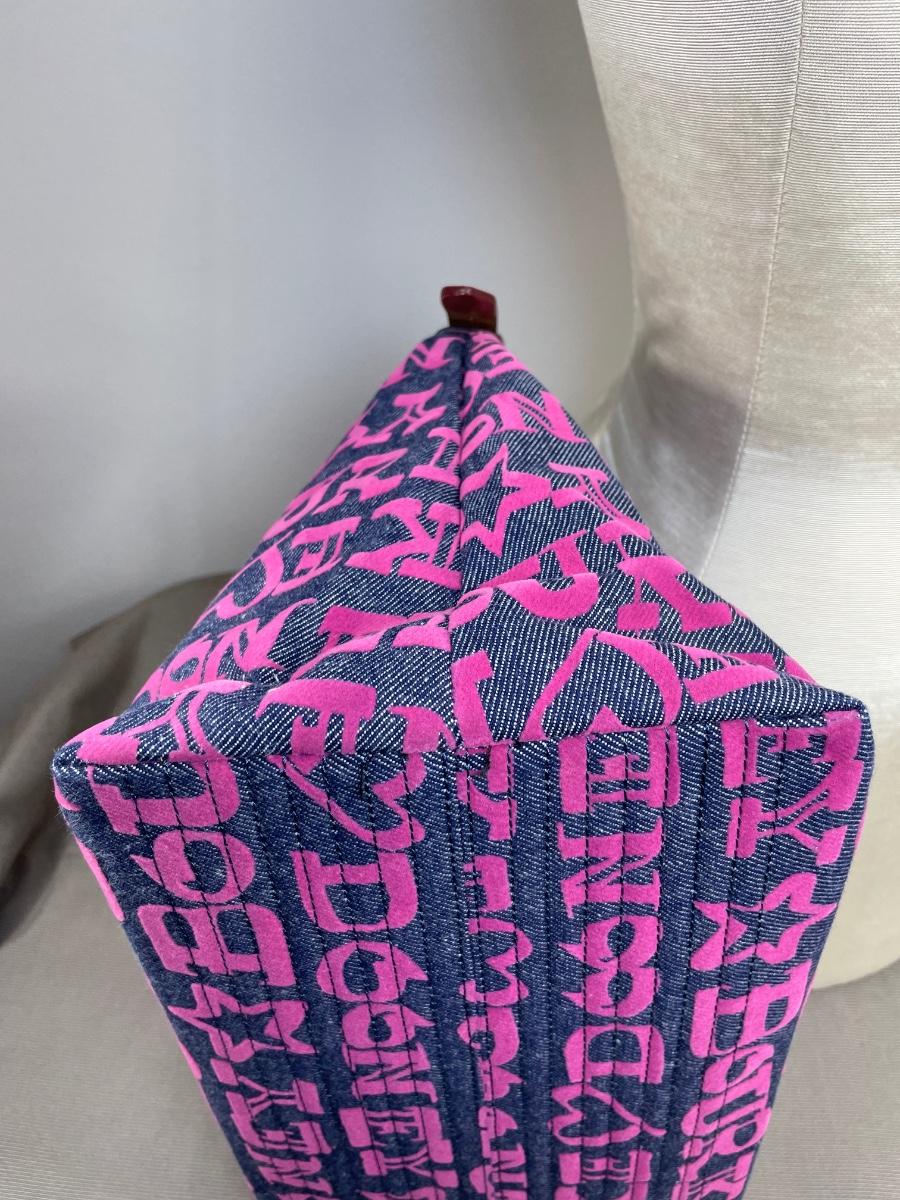 Large Erica denim fabric bag with hot pink logos and interior. Leather straps. NWOT 14” by 10” by 7” Excellent condition.