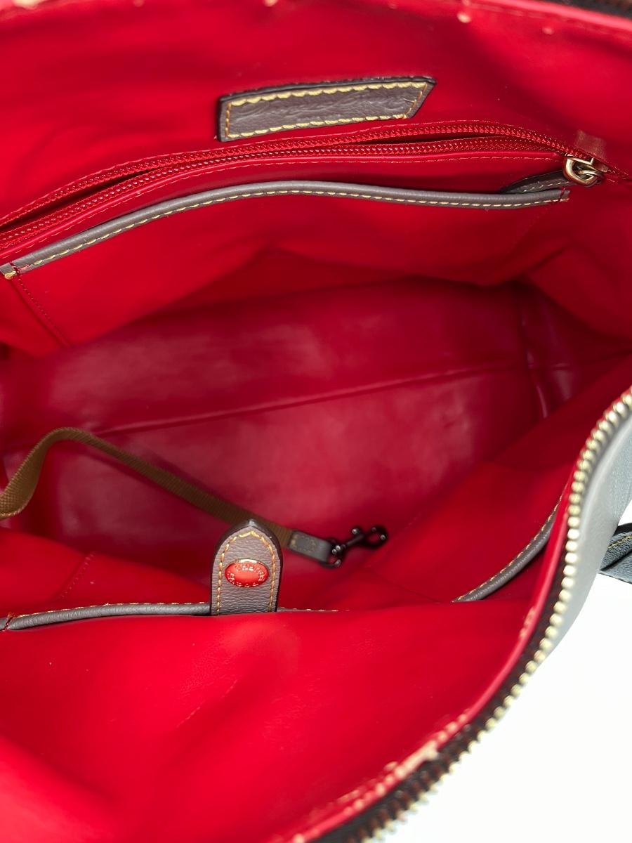 Taupe & Black ~ 12” H x 12” W x 5” ~ Strap 8” - 10” Long ~ Wallet 8” x 4” ~ Also includes key ring ~ Red Leather on interior has some cracking on the top close to the zipper as seen in photos