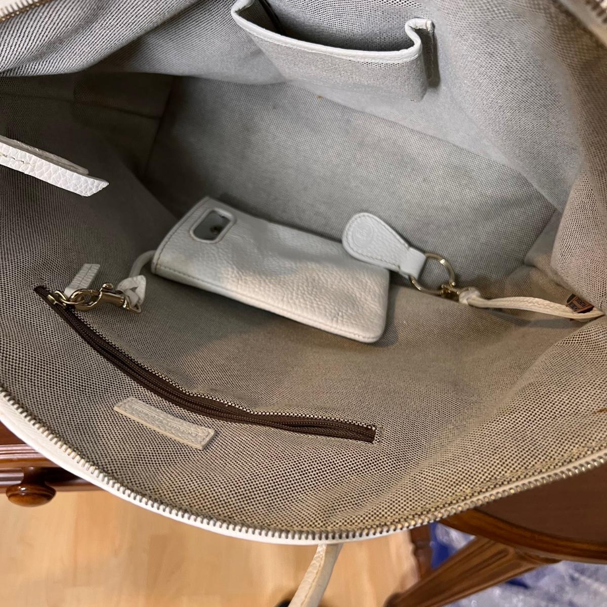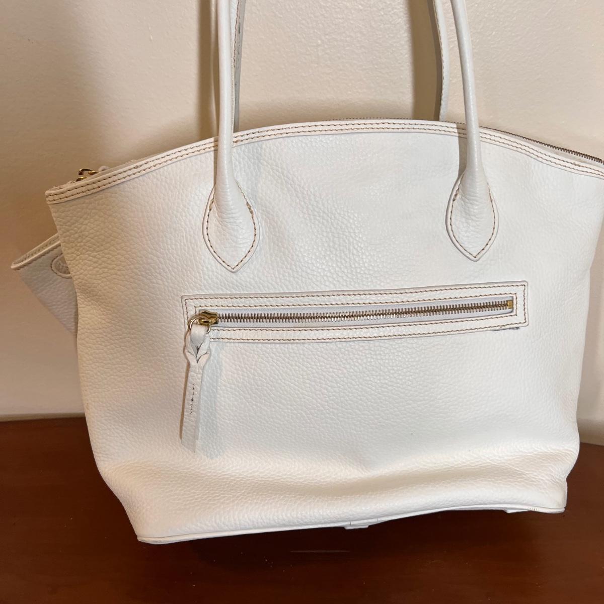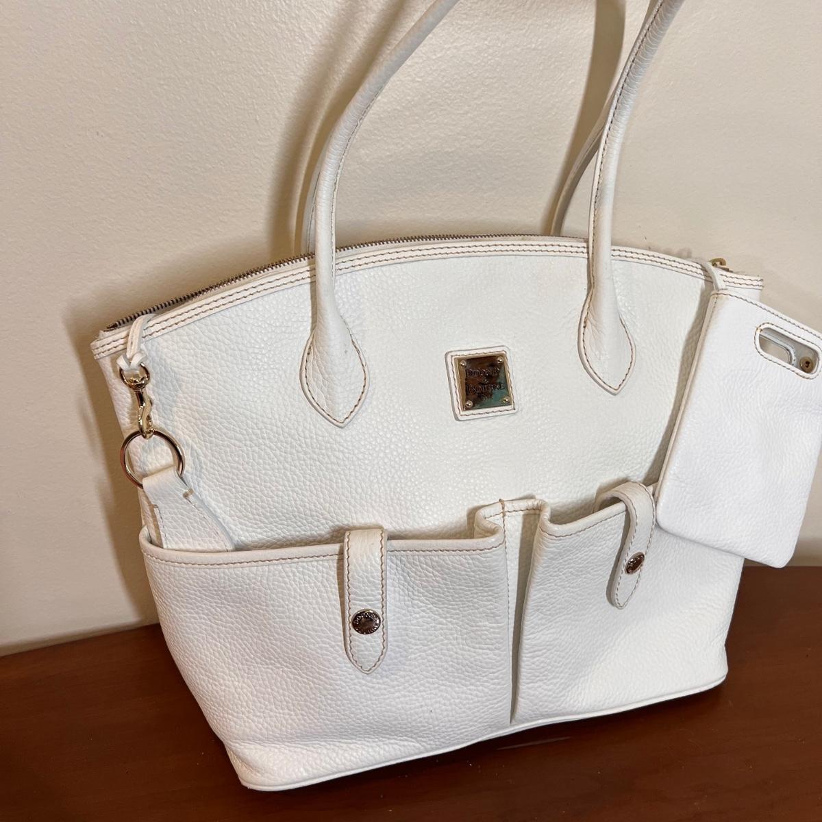 White leather crescent tote with mini pouch and key fob. Tote exterior: double handles, zip-top entry, two front pockets with snap and tab closure, back zip pocket, protective bottom feet. Tote interior: front-wall cell phone pocket, back-wall zipper pocket, dog leash-style strap for key fob