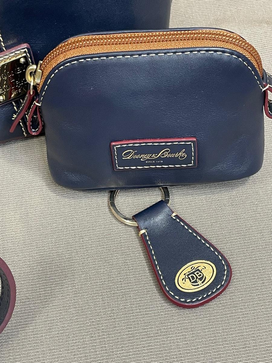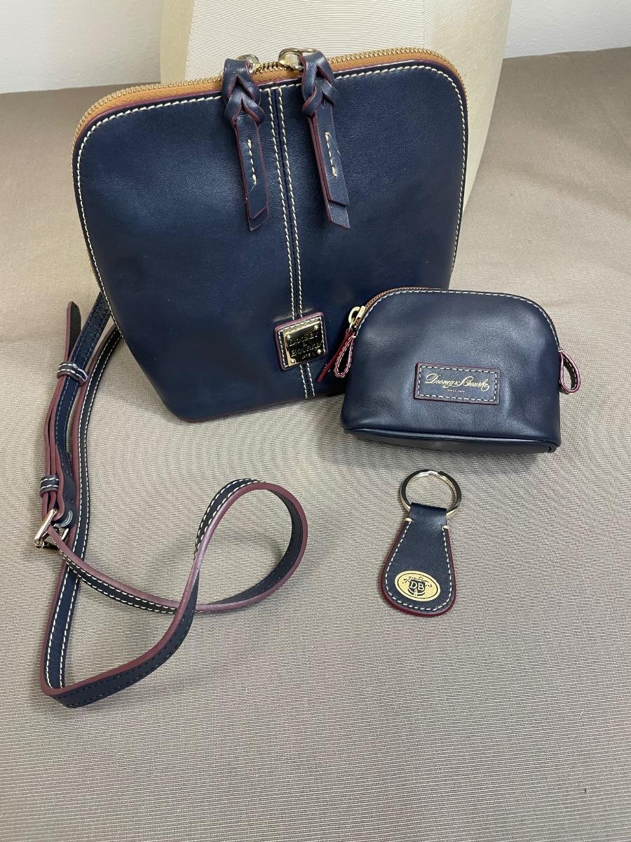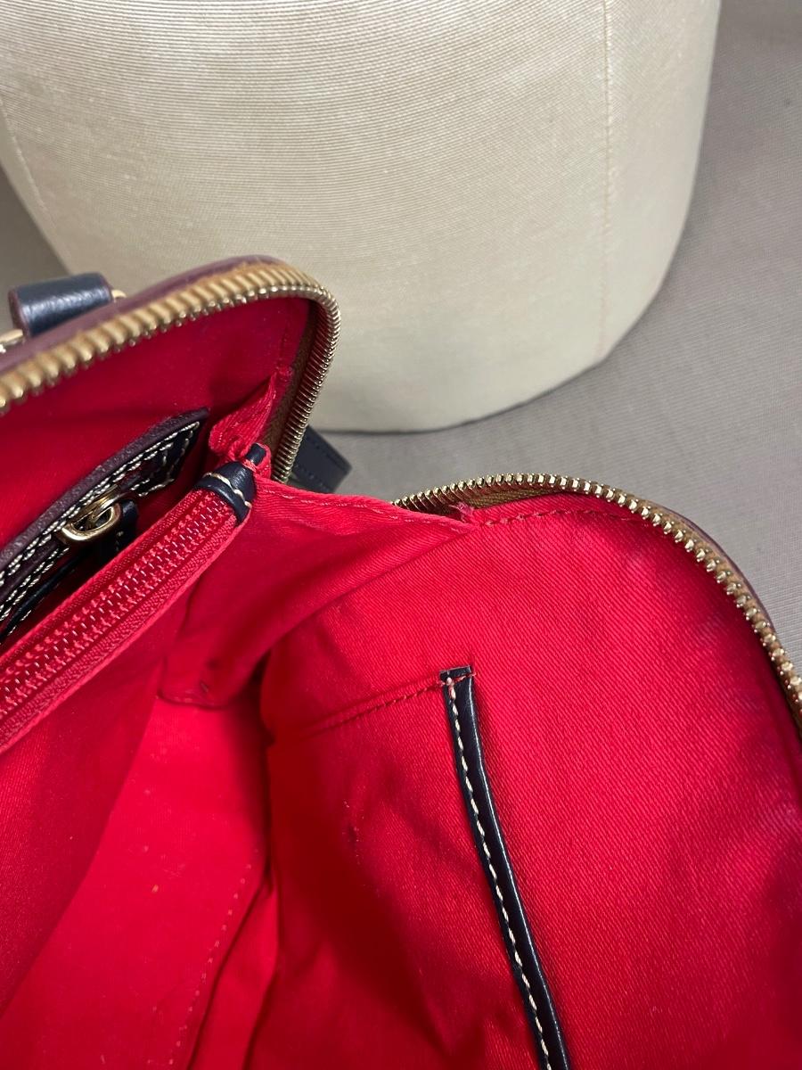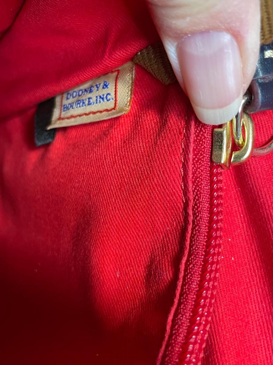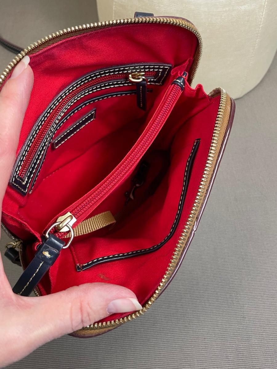 Gently used bag in very nice condition and New coin purse and key fob. I noticed a few spots inside the bag (food)? Otherwise the leather is in excellent condition.