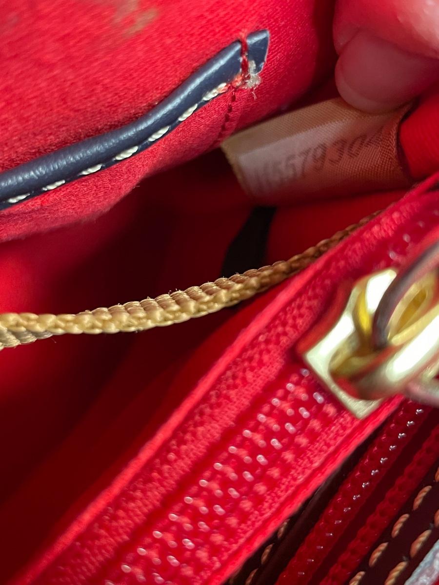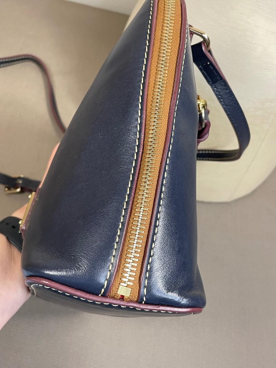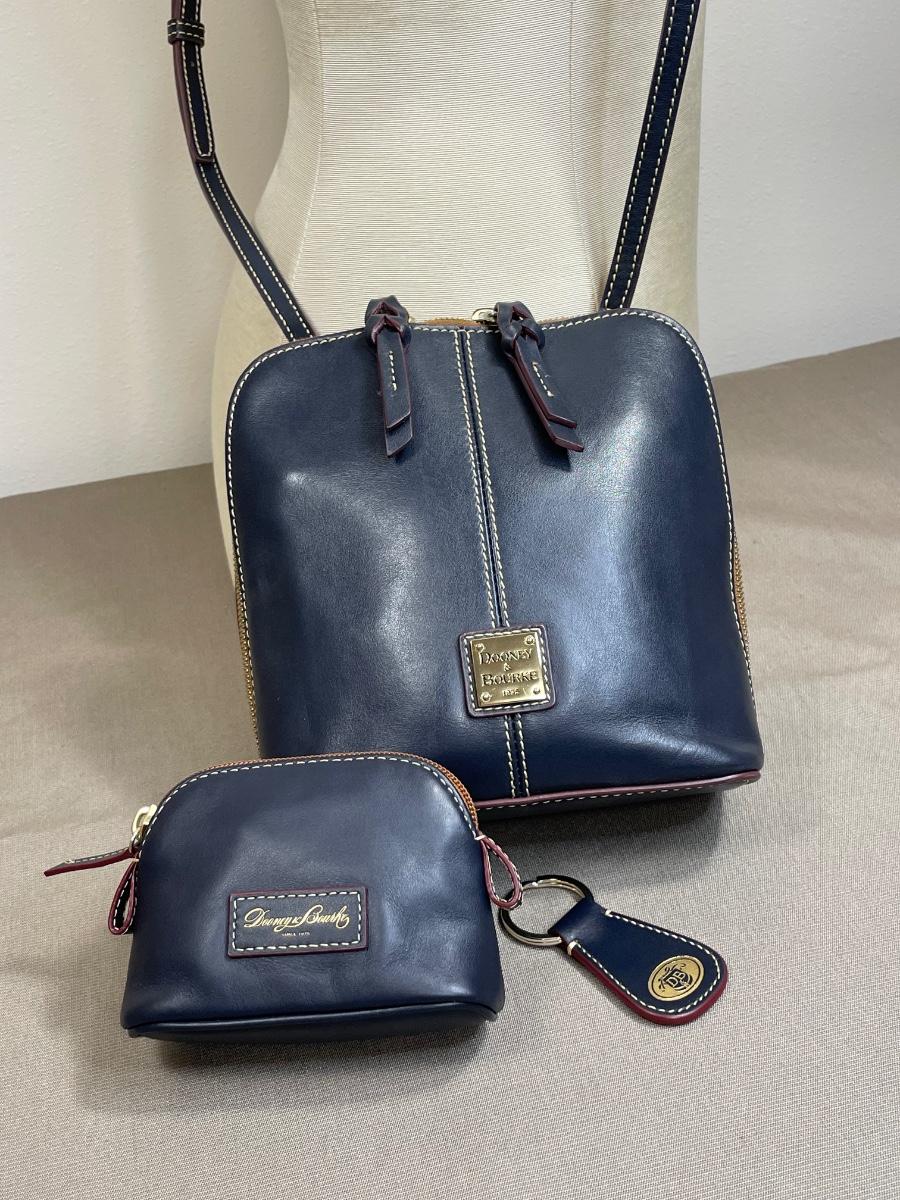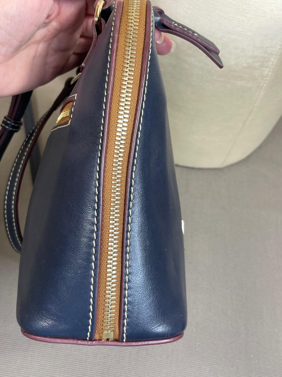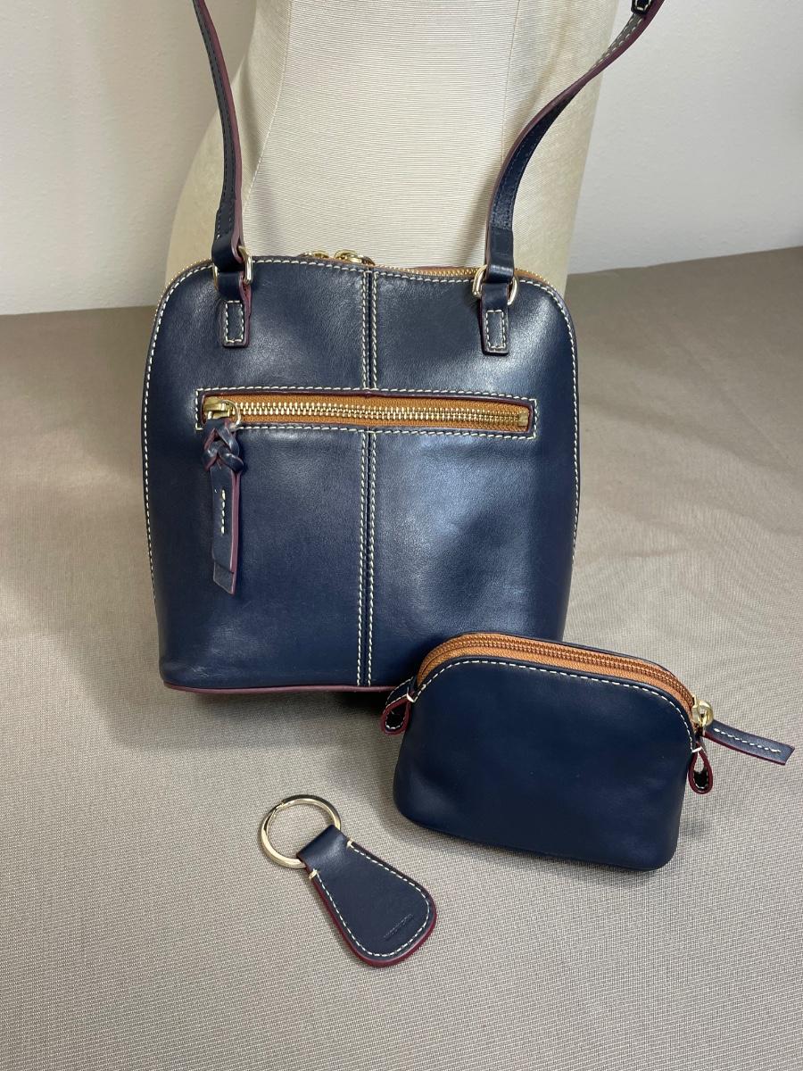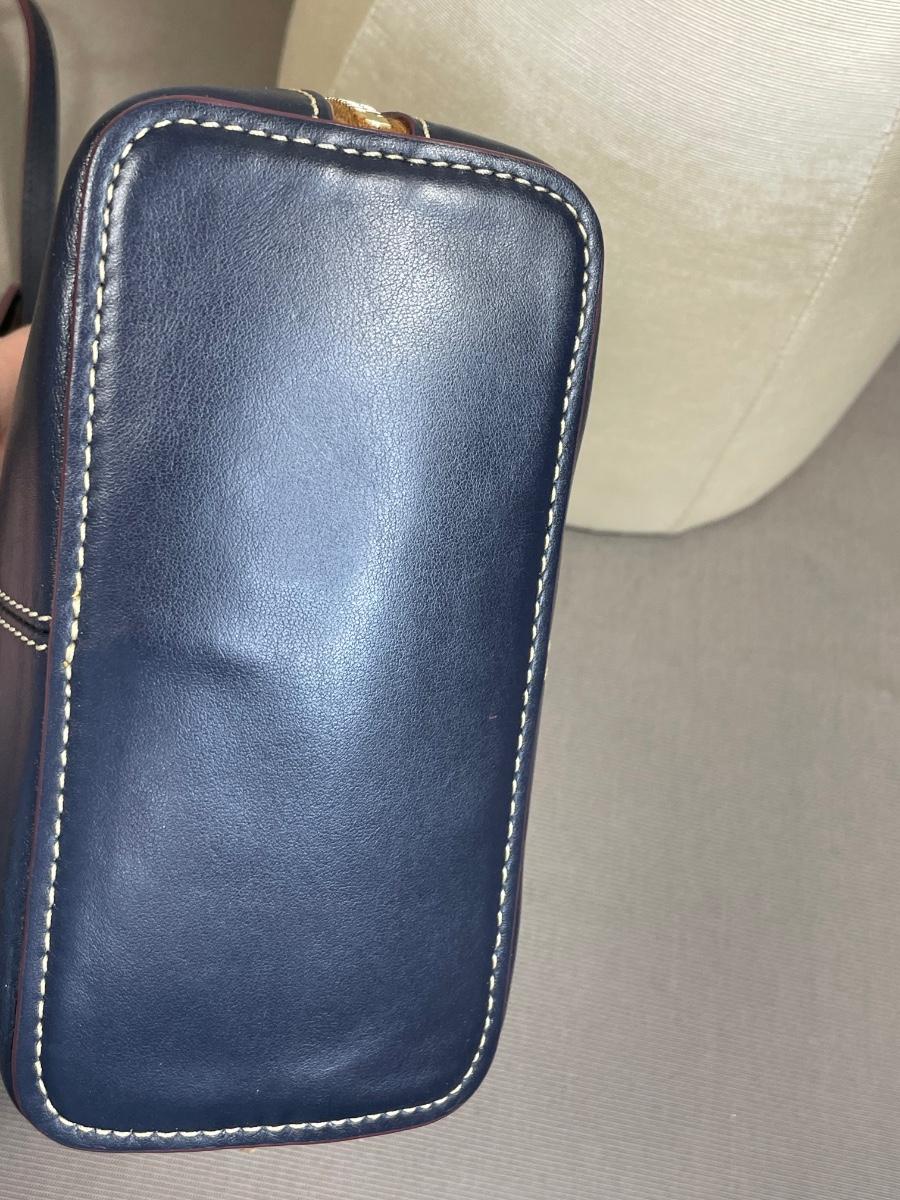 Gently used bag in very nice condition and New coin purse and key fob. I noticed a few spots inside the bag (food)? Otherwise the leather is in excellent condition.