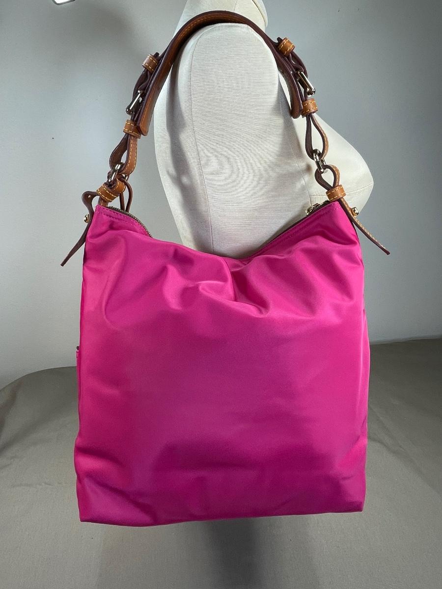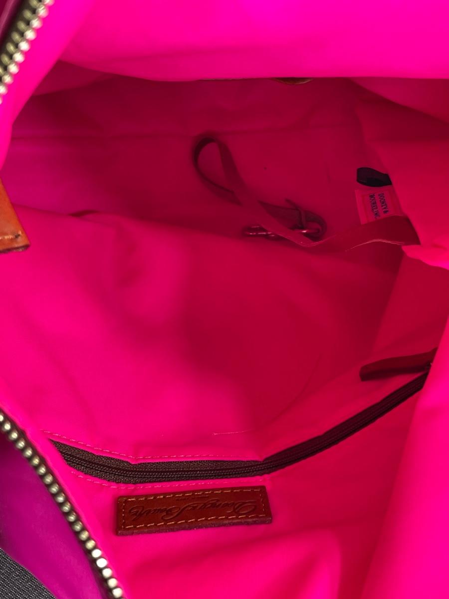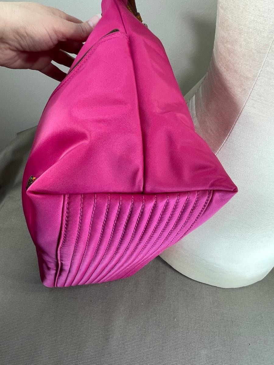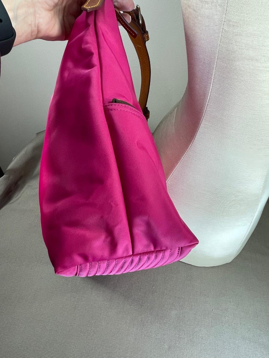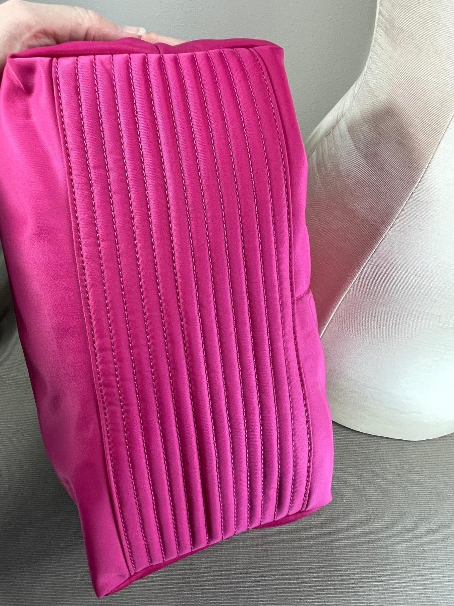 Hot pink inside and out, with leather handle and trim. 14” by 15” by 6”. NWOT excellent condition.