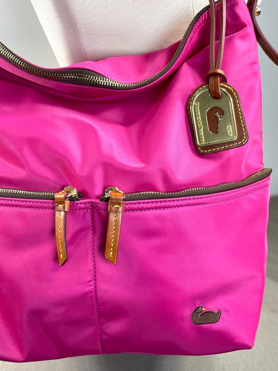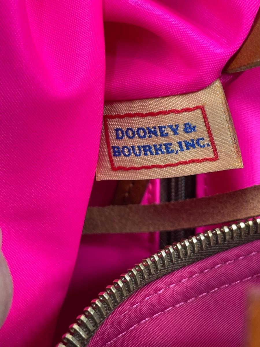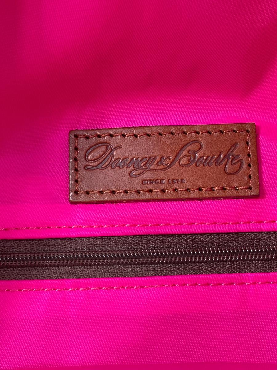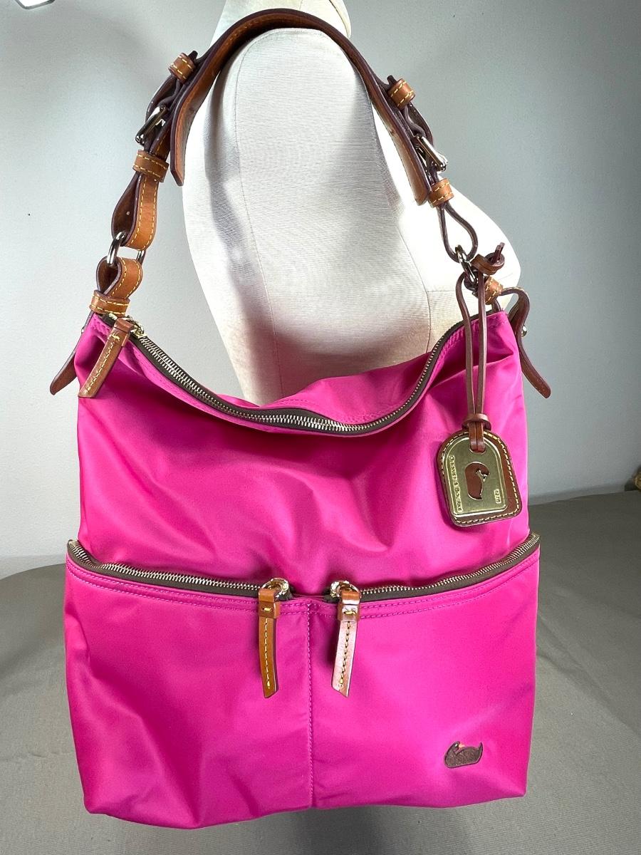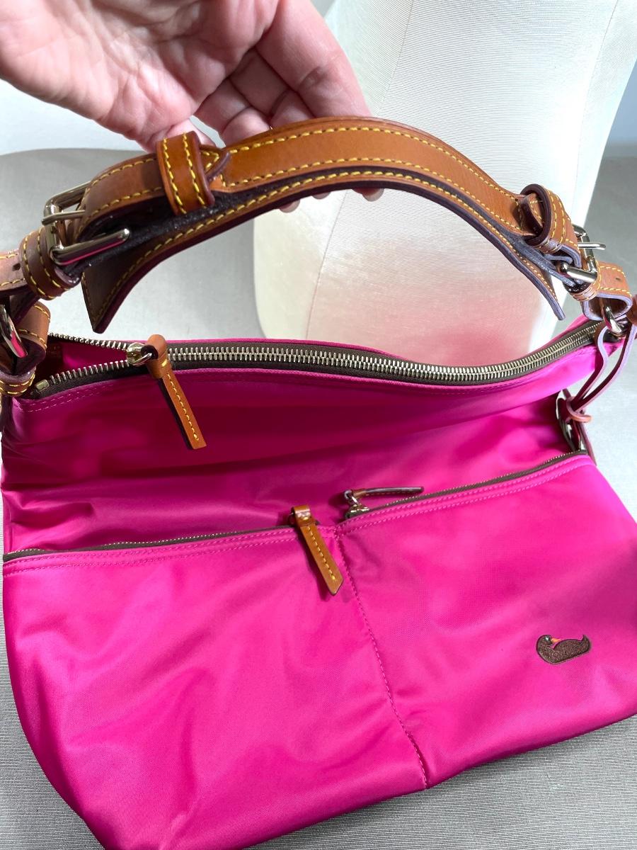 Hot pink inside and out, with leather handle and trim. 14” by 15” by 6”. NWOT excellent condition.