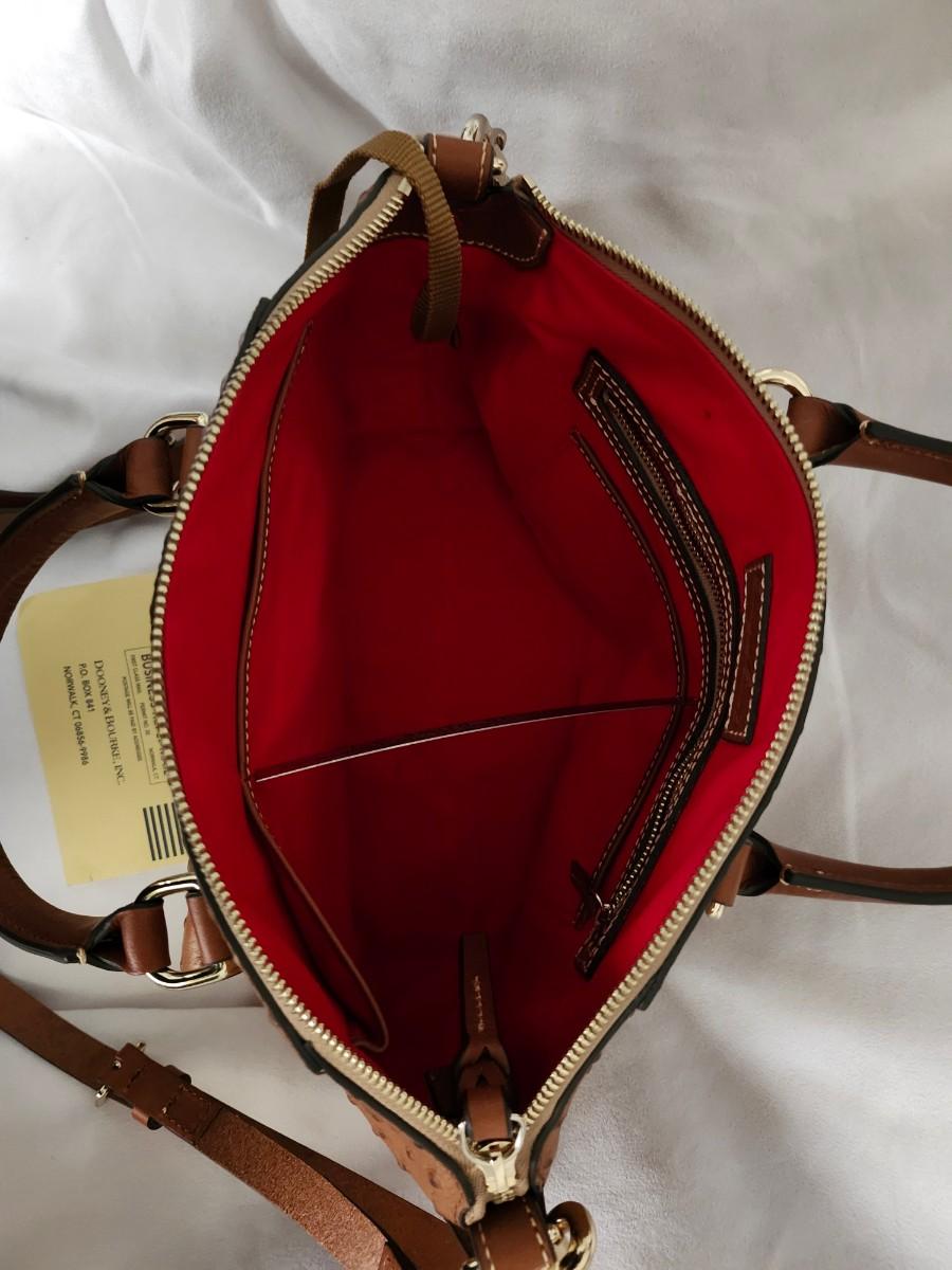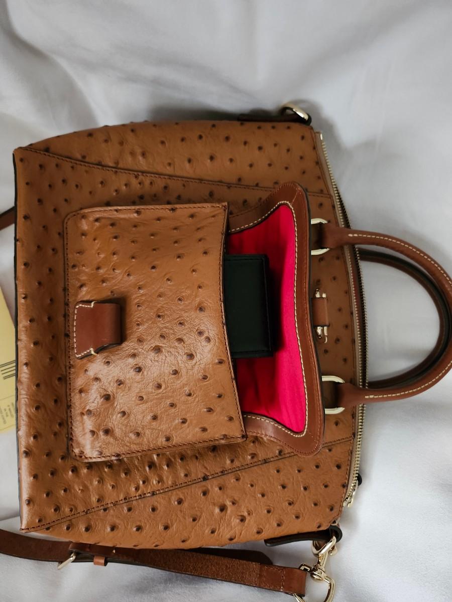 This is a beautiful handbag, pre-owned with 1 previous owner. Zipper closure, strap drop length is 20 inches, the handle has 6.5 inch drop. 1 inside pocket, 3 slip inside pockets. Inside key hook. Ostrich leather that is not waterproof.