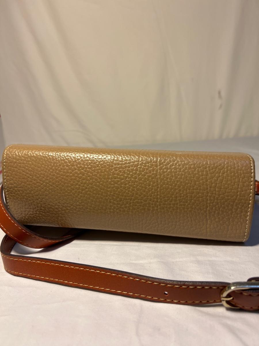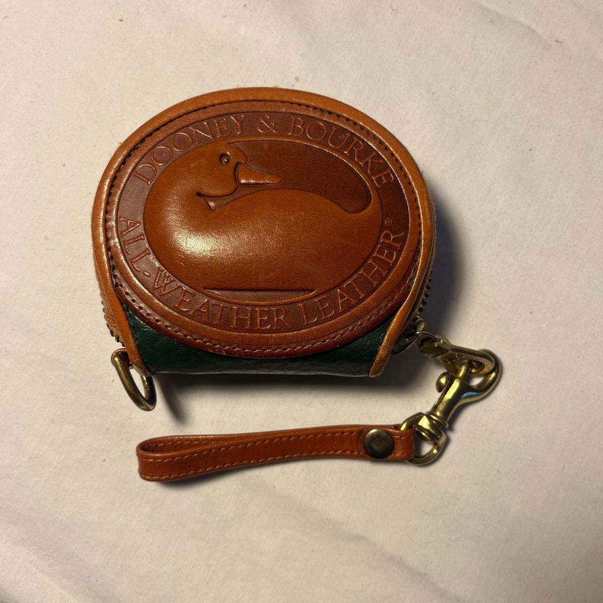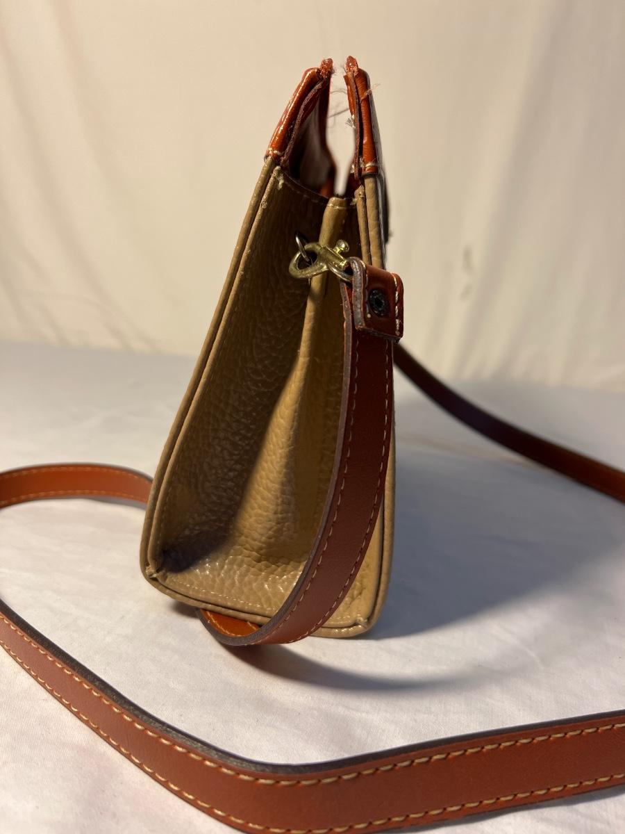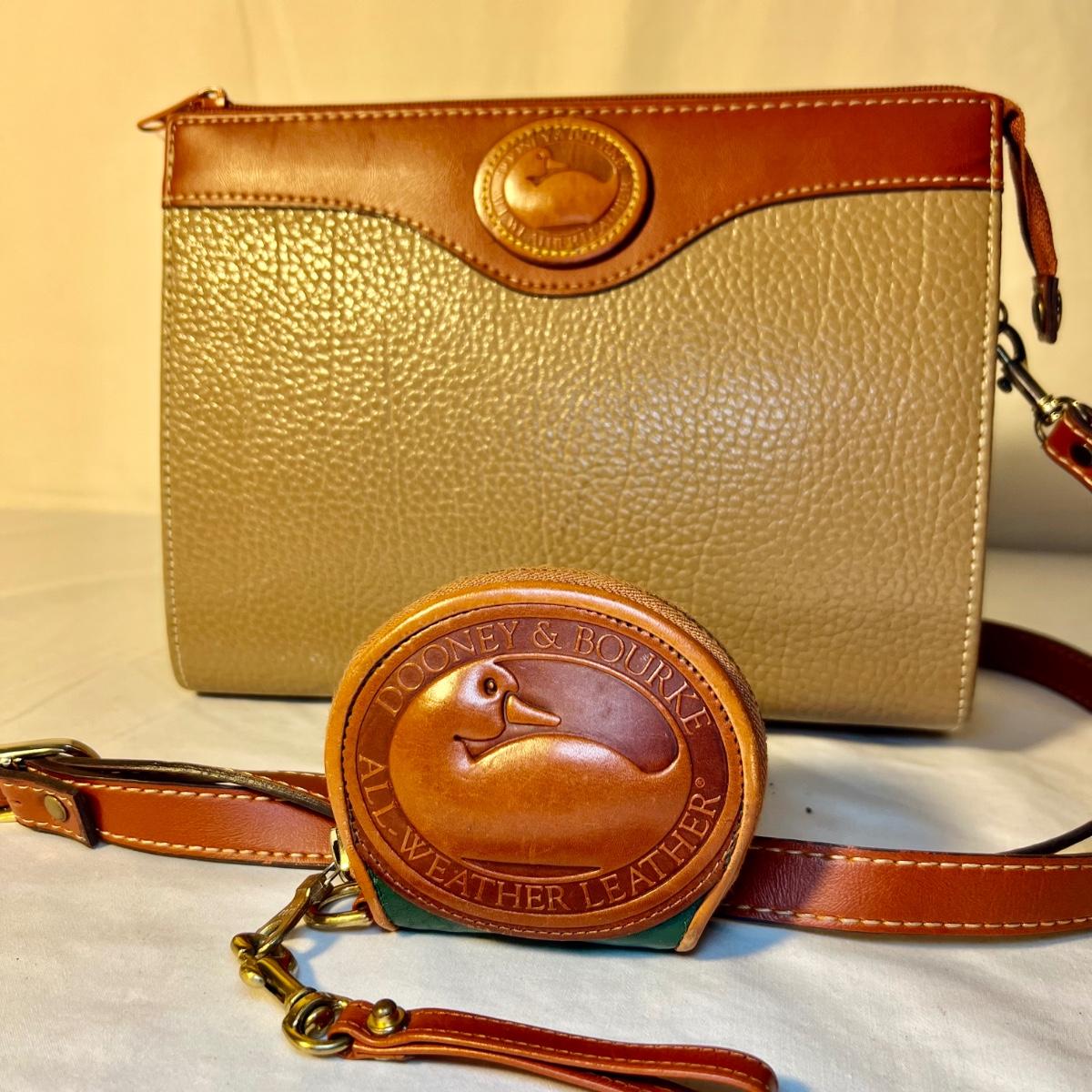 A beautiful two toned leather Dooney & Bourke shoulder bag which is a tan color with a saddle brown colored leather top and logo. Interior is clean but the exterior has a few light marks that are shown in images. It has been paired with a green leather coin purse featuring a large D&B Duck logo; there is a blemish shown in images.