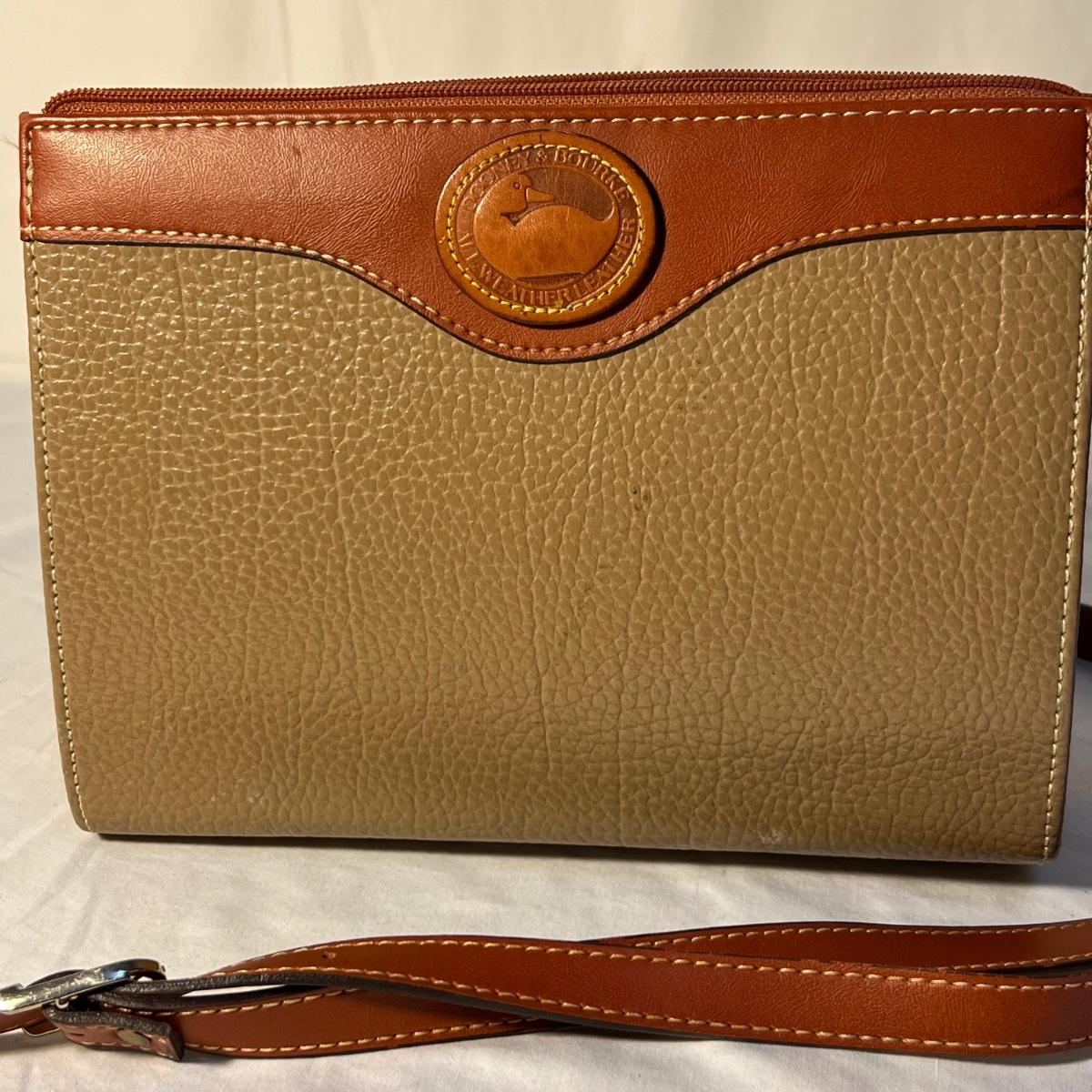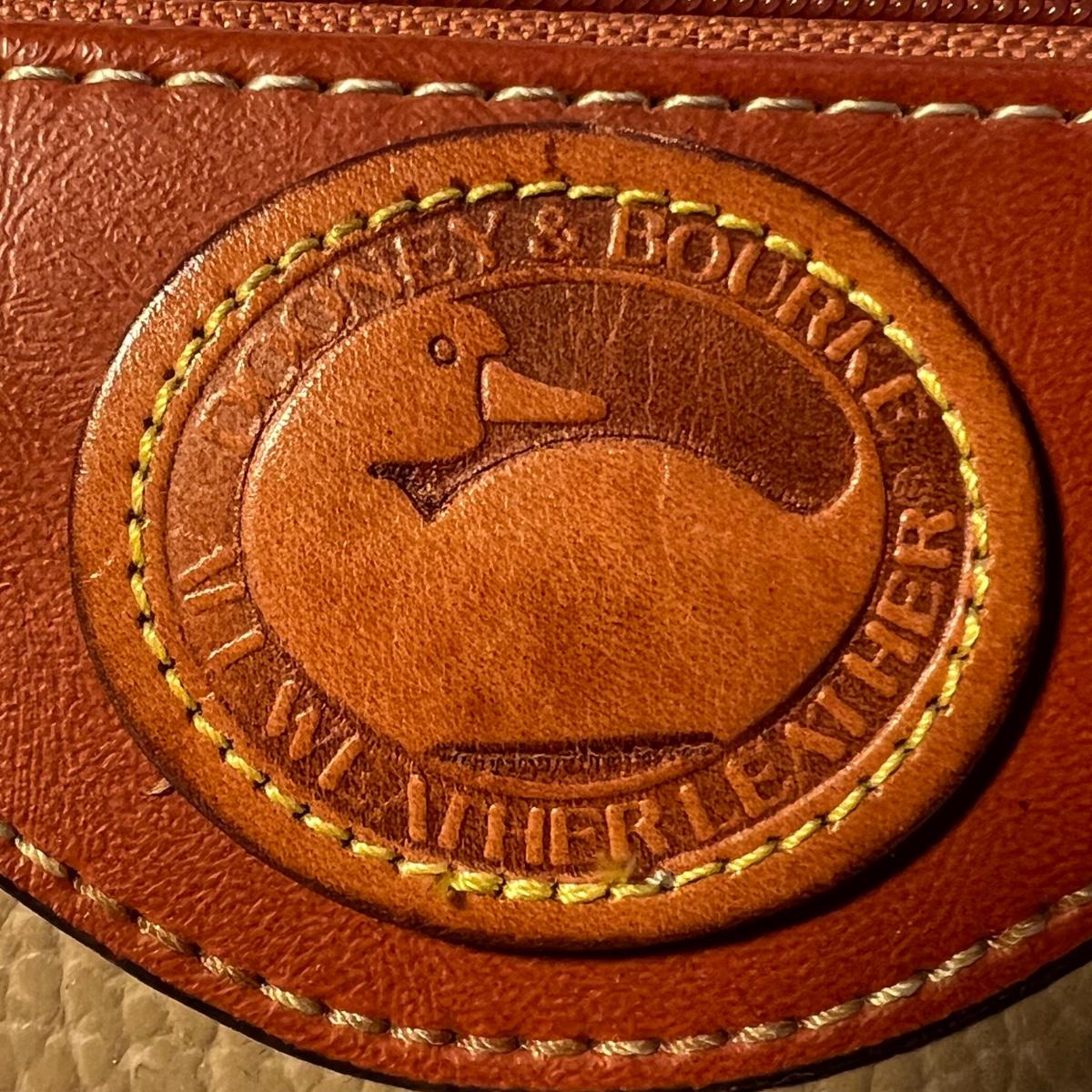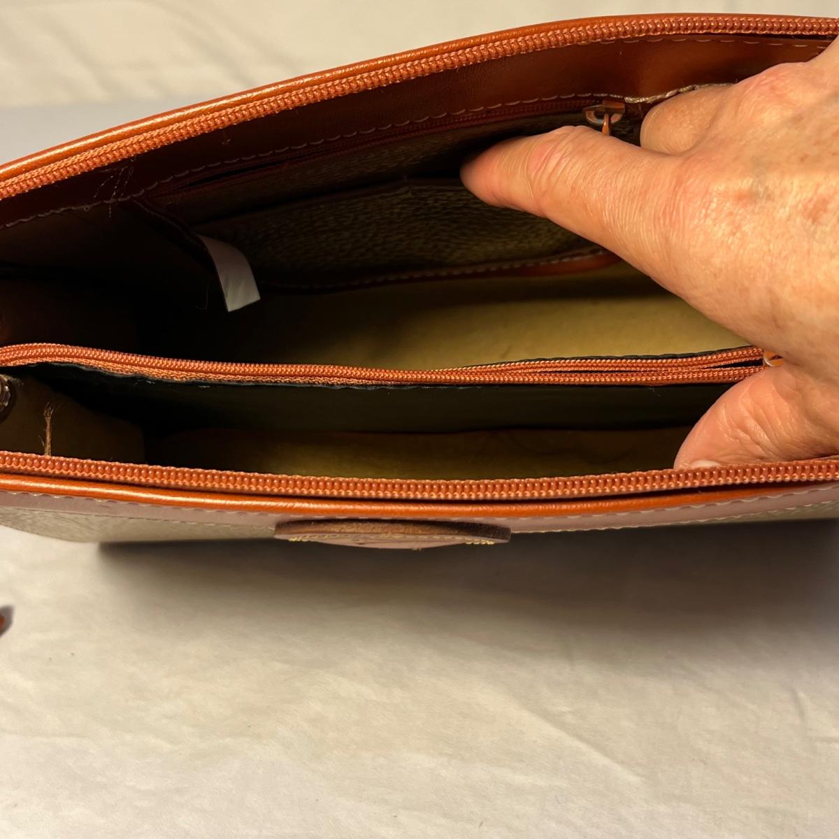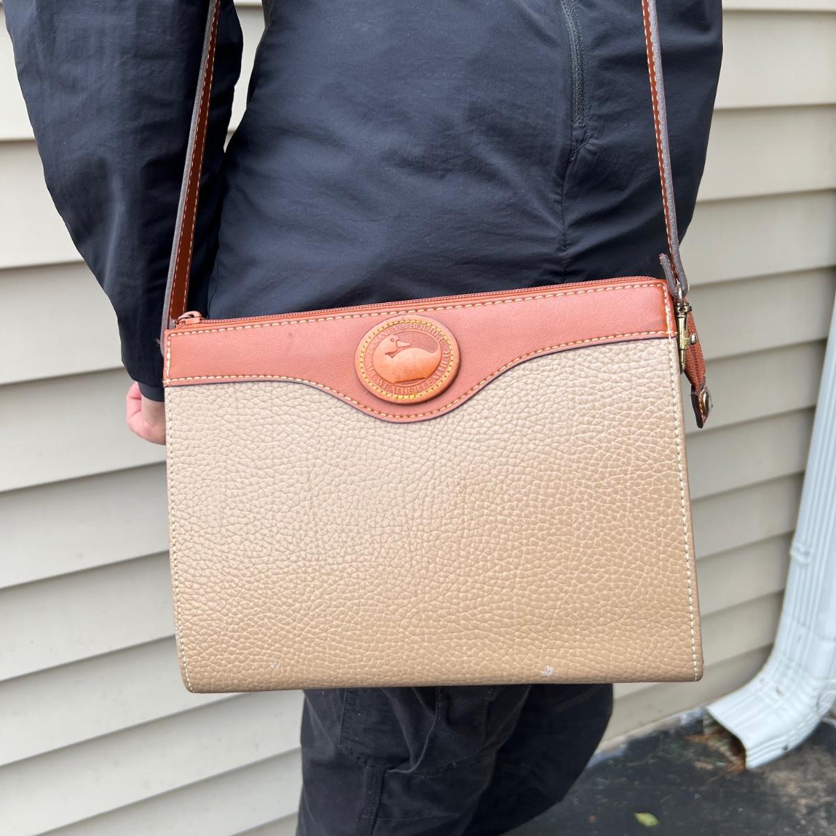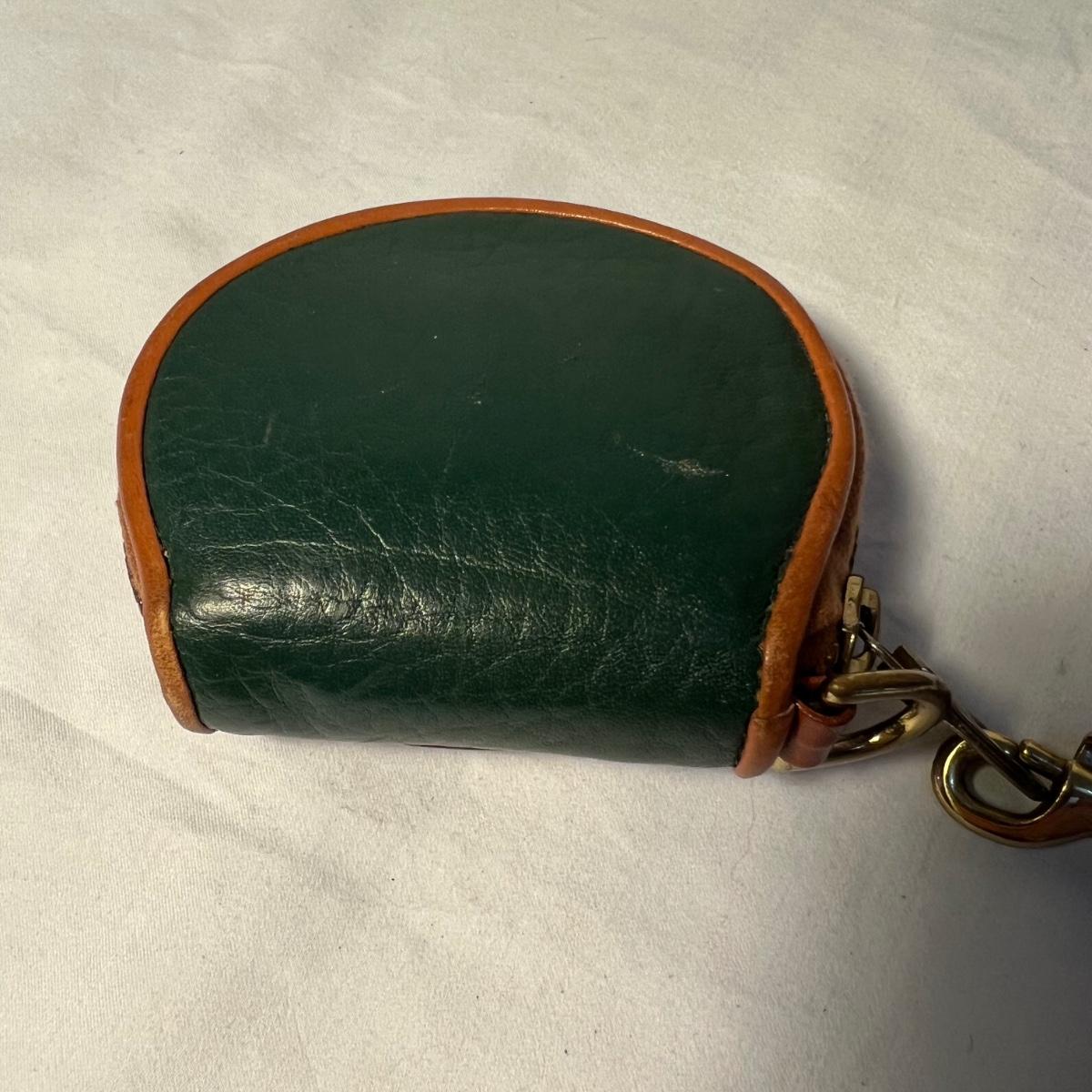 A beautiful two toned leather Dooney & Bourke shoulder bag which is a tan color with a saddle brown colored leather top and logo. Interior is clean but the exterior has a few light marks that are shown in images. It has been paired with a green leather coin purse featuring a large D&B Duck logo; there is a blemish shown in images.