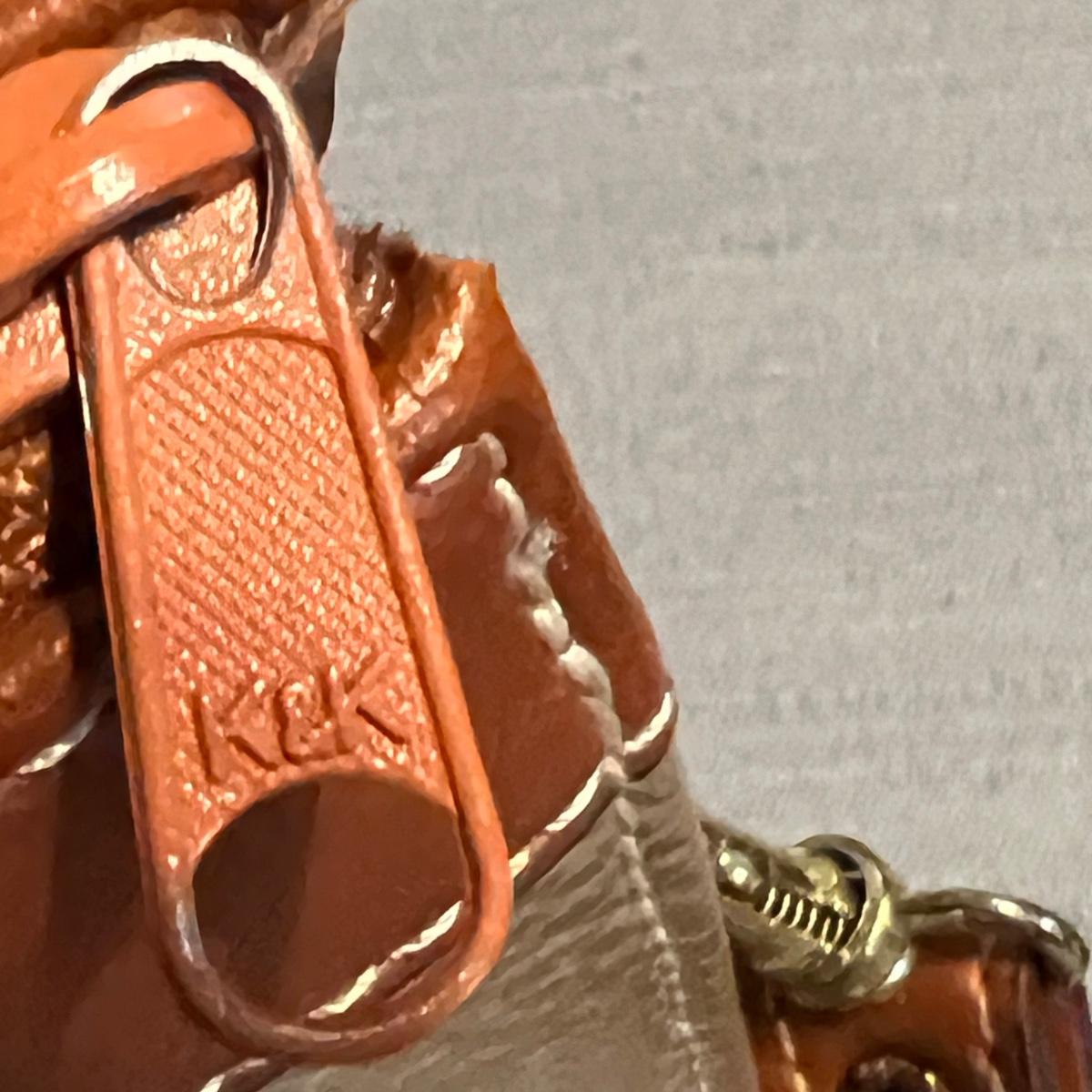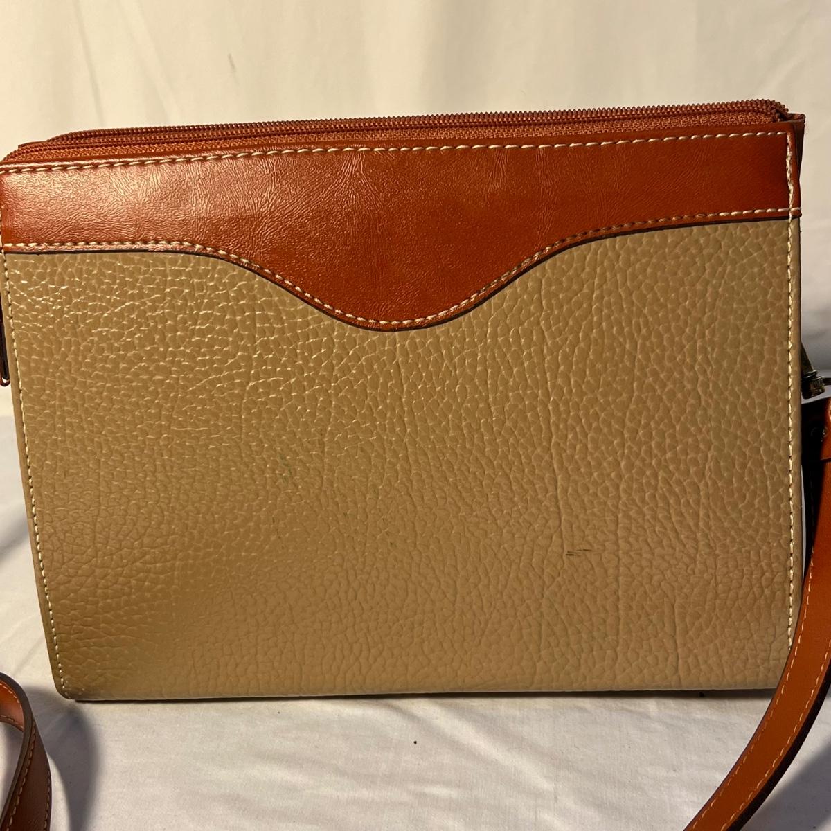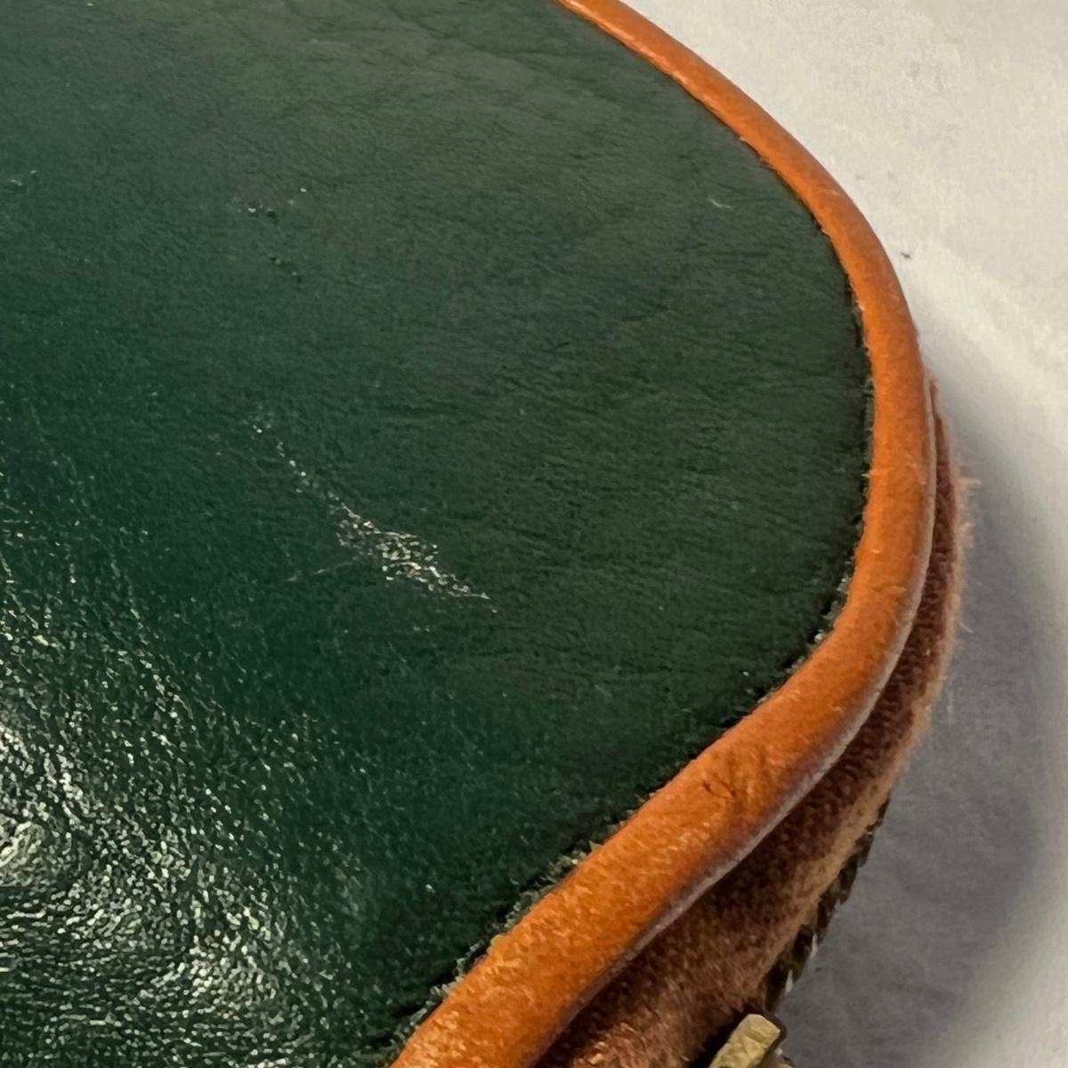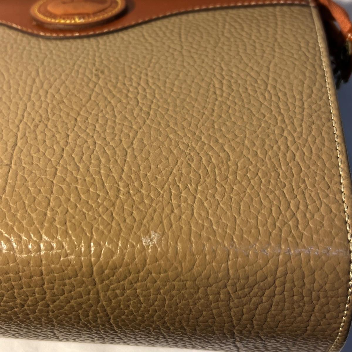 A beautiful two toned leather Dooney & Bourke shoulder bag which is a tan color with a saddle brown colored leather top and logo. Interior is clean but the exterior has a few light marks that are shown in images. It has been paired with a green leather coin purse featuring a large D&B Duck logo; there is a blemish shown in images.