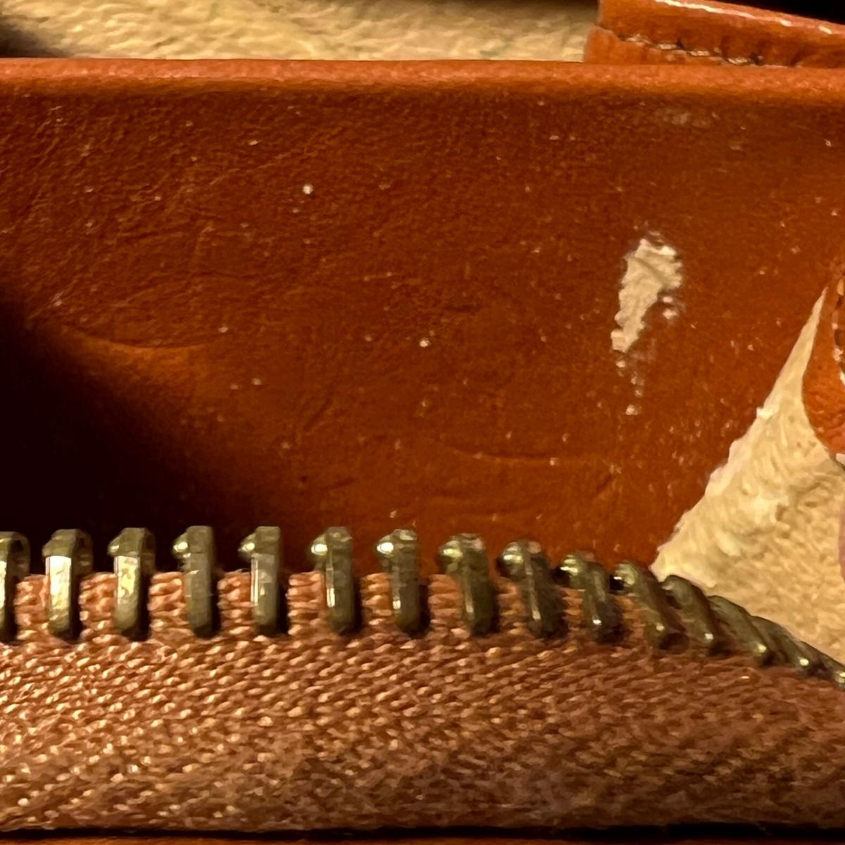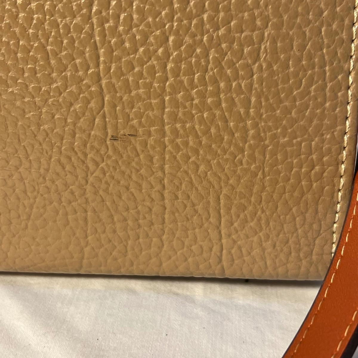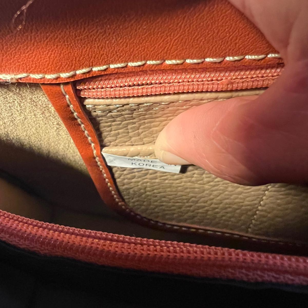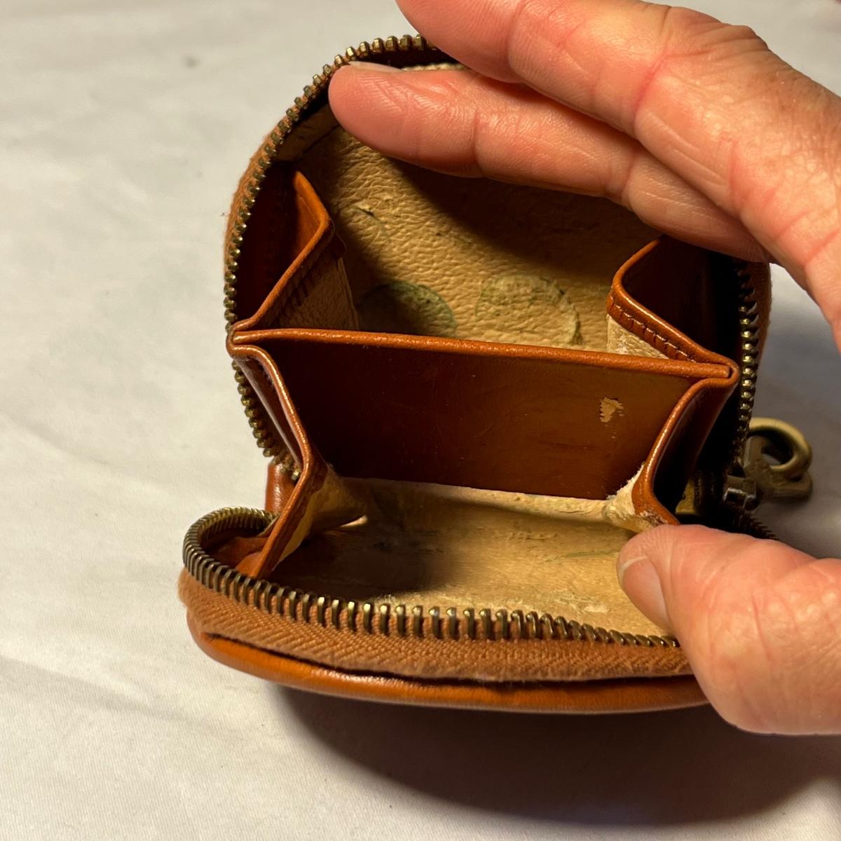 A beautiful two toned leather Dooney & Bourke shoulder bag which is a tan color with a saddle brown colored leather top and logo. Interior is clean but the exterior has a few light marks that are shown in images. It has been paired with a green leather coin purse featuring a large D&B Duck logo; there is a blemish shown in images.