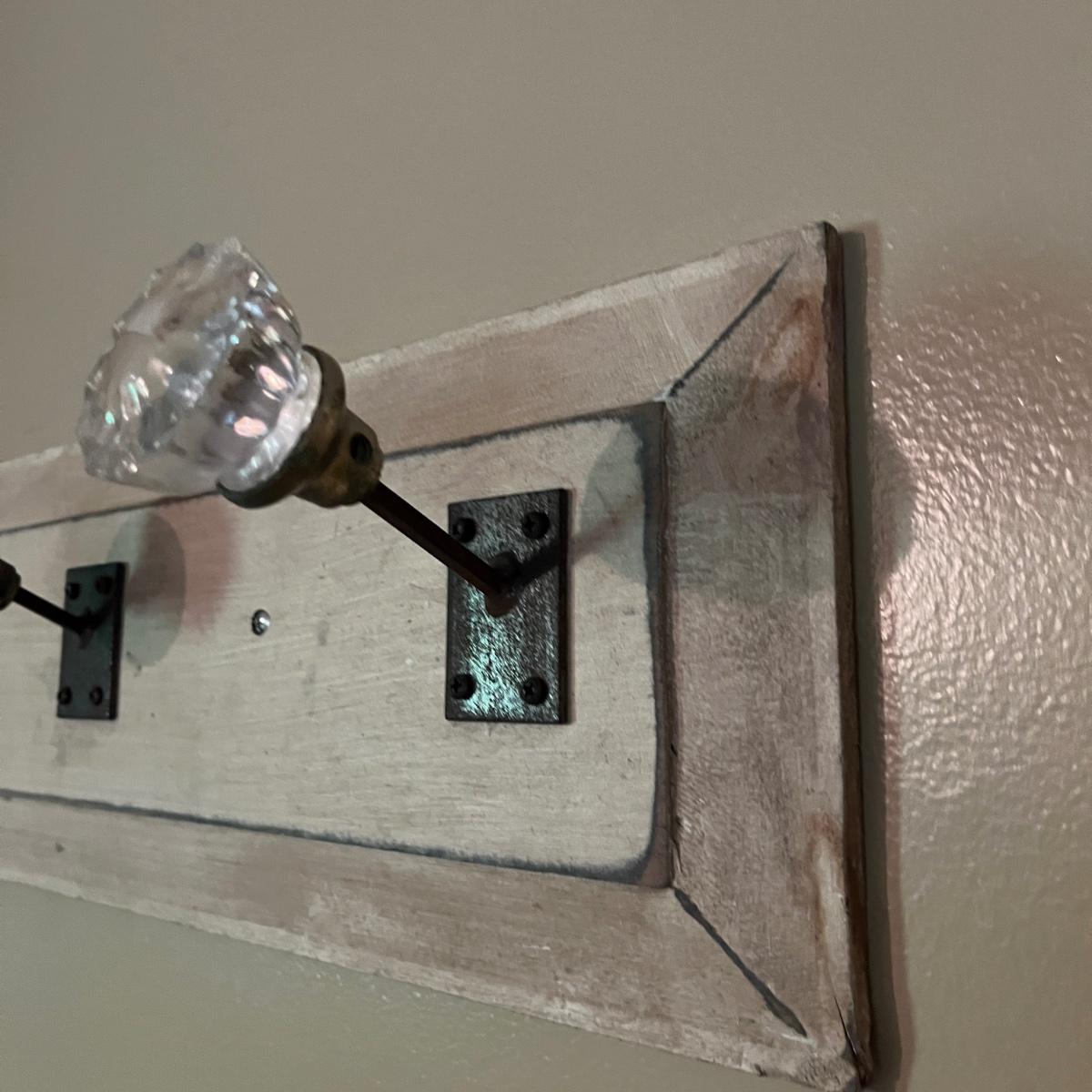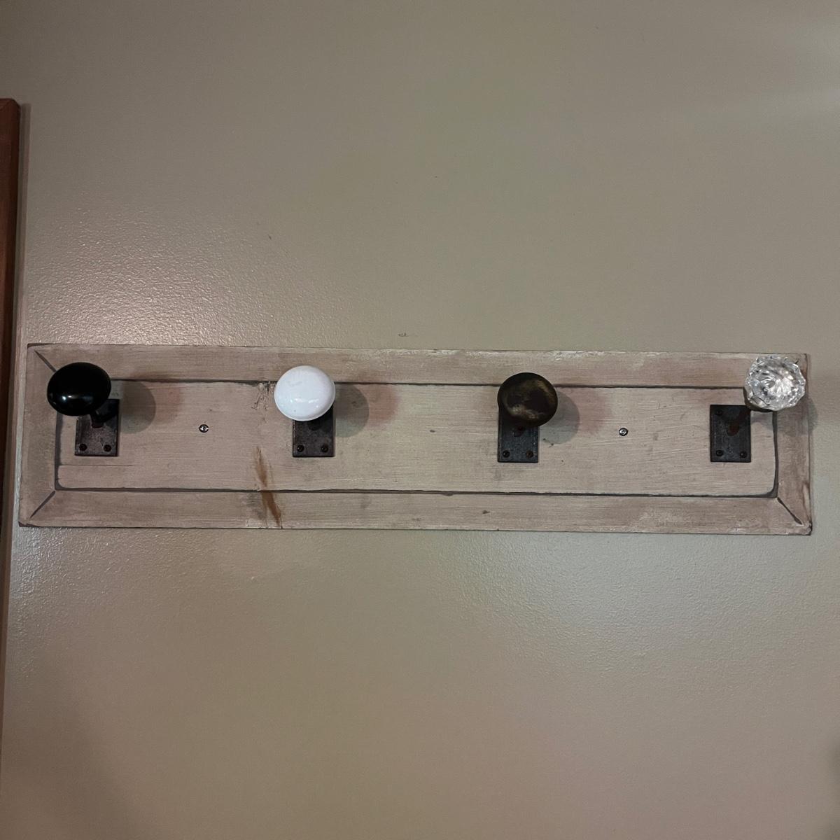 Lot includes a wall mount doorknob wall mount coat rack with a wood base. Piece measures 31” x 4.5” x 7.5”H. There are three metal doorknobs and one glass doorknob. Rack was mounted with screws.