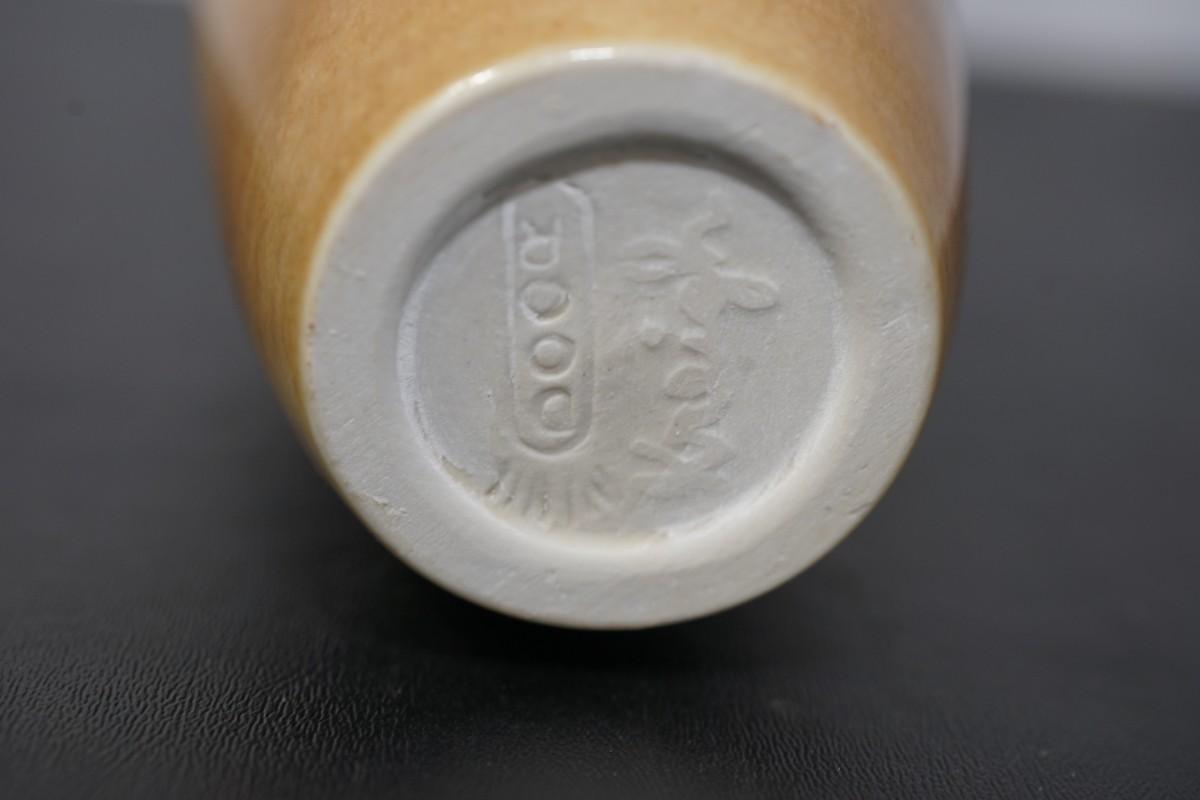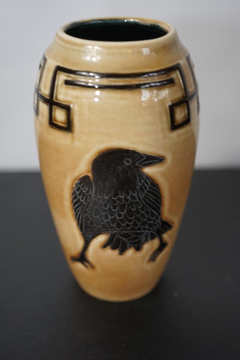 DOOR POTTERY VASE INCISED CARVED CROW - GLAZED