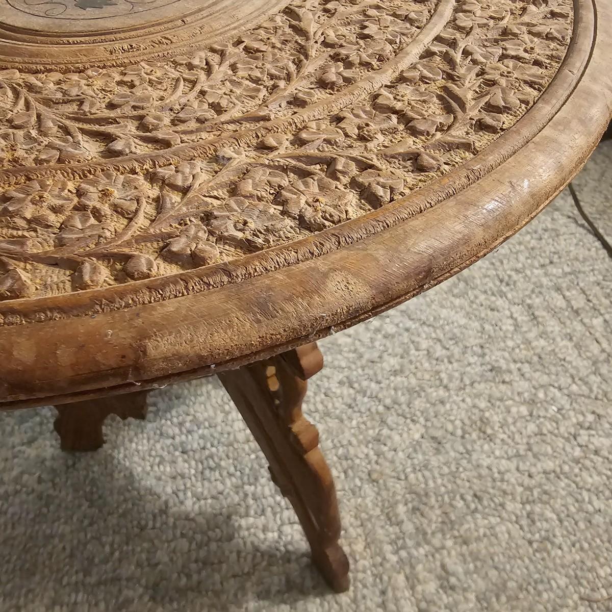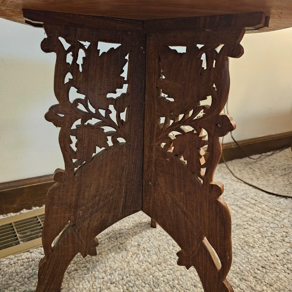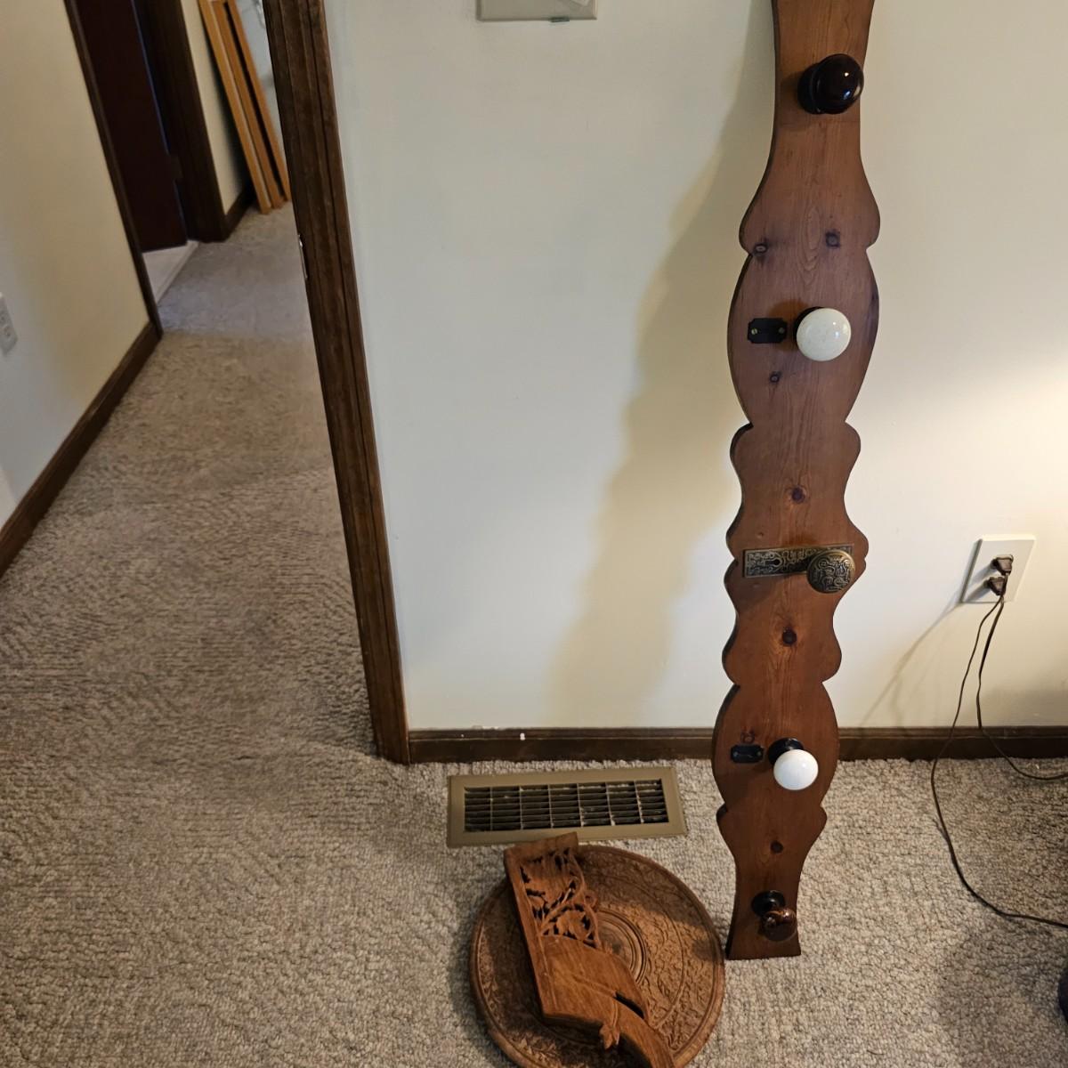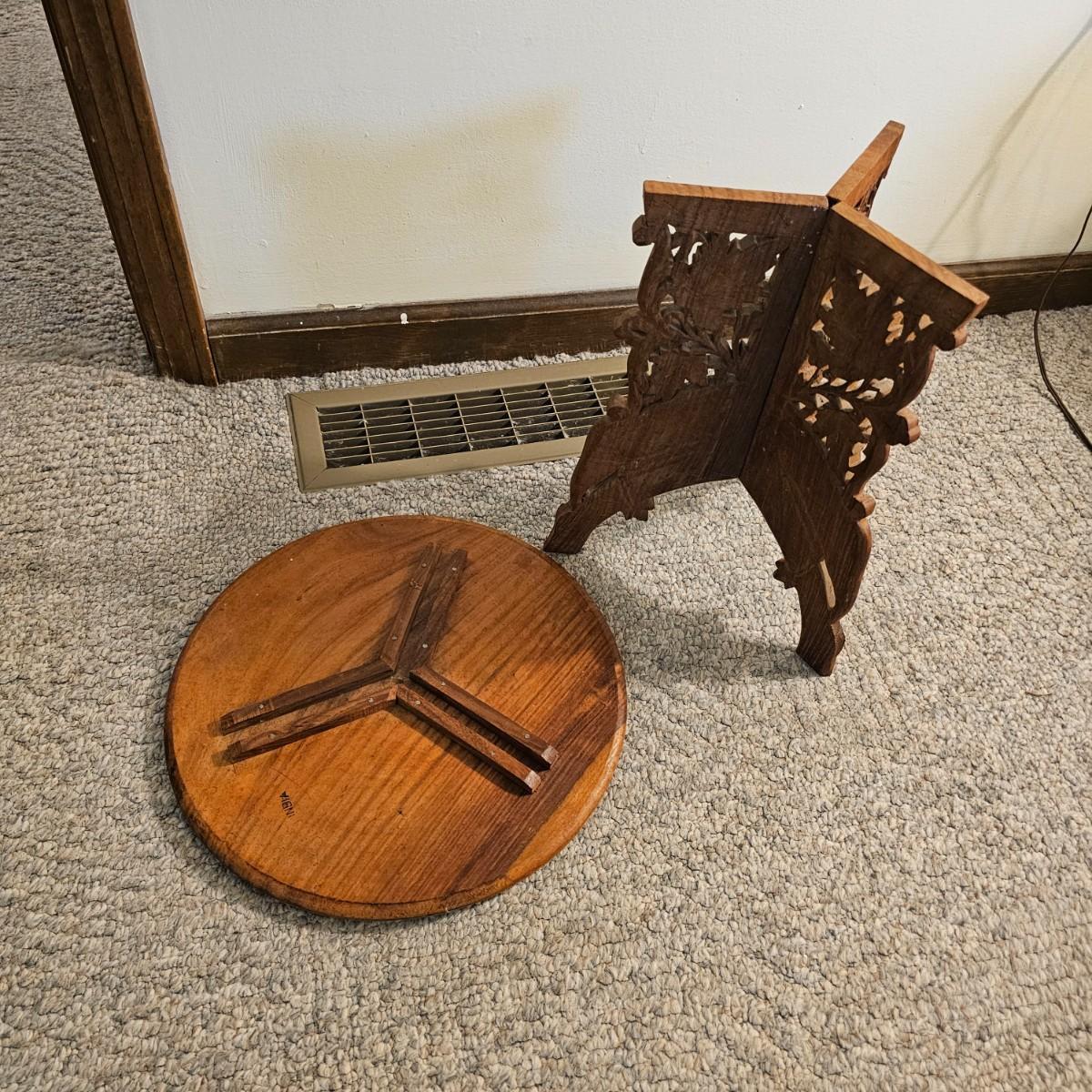 A rustic upcycled rack of doorknobs with a stylish sculpted backpack. Perfect for decoration or hanging coats, hats, etc. Piece measures 50" x 3" x 7"H. Round carved table has three legs that fold flat for storage, measures 14.4"D x 15.5"H. Intricate carving on all surfaces. See photos for details. Local pickup only.