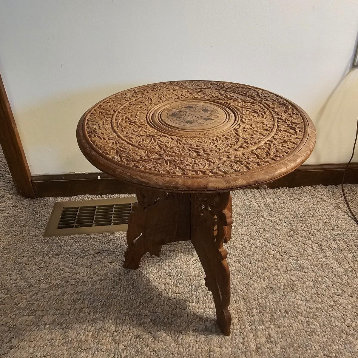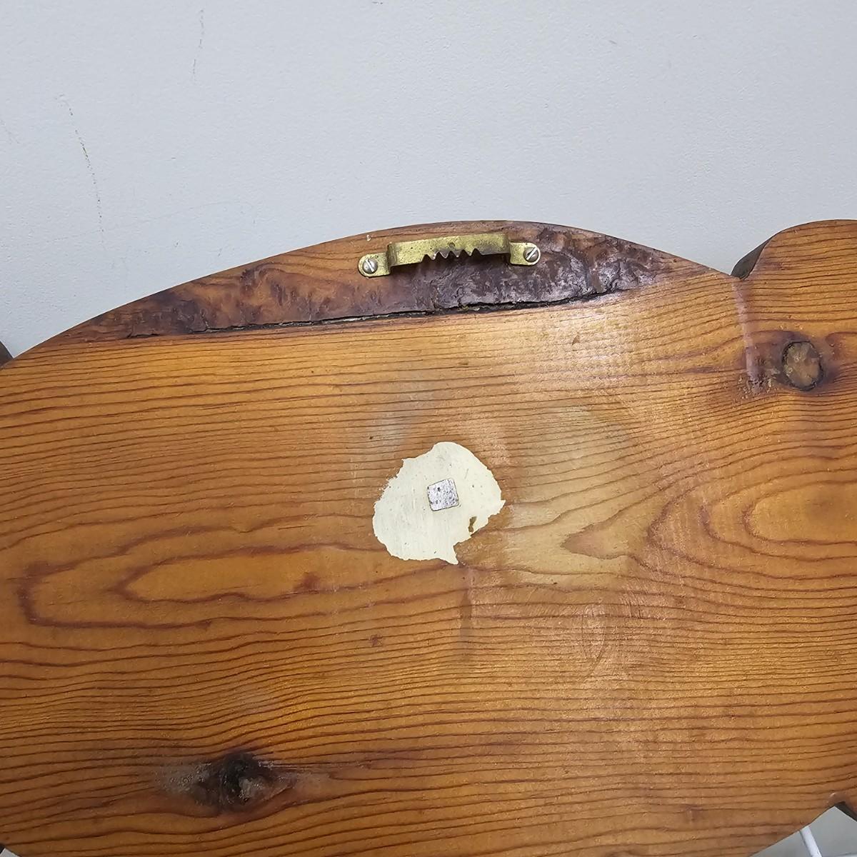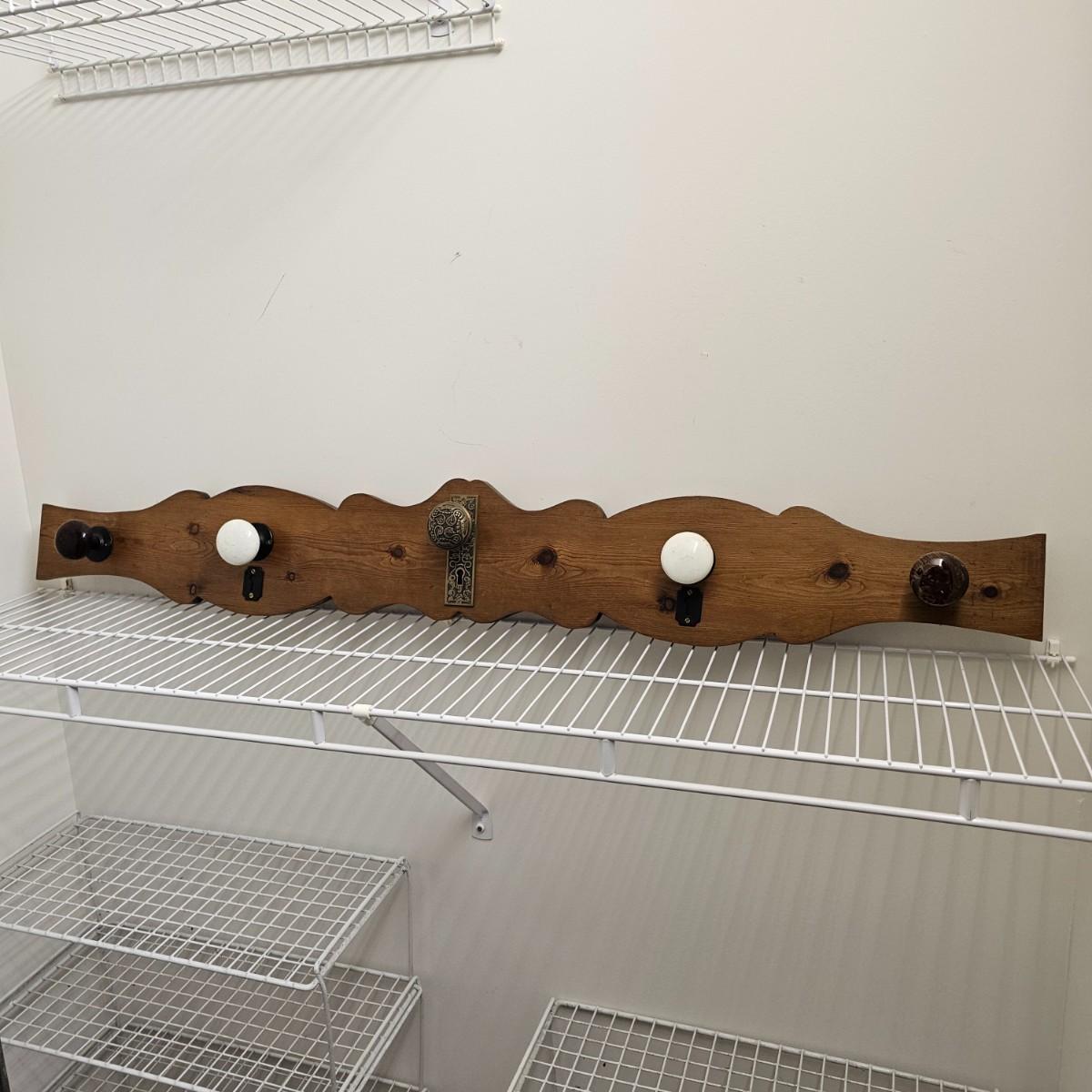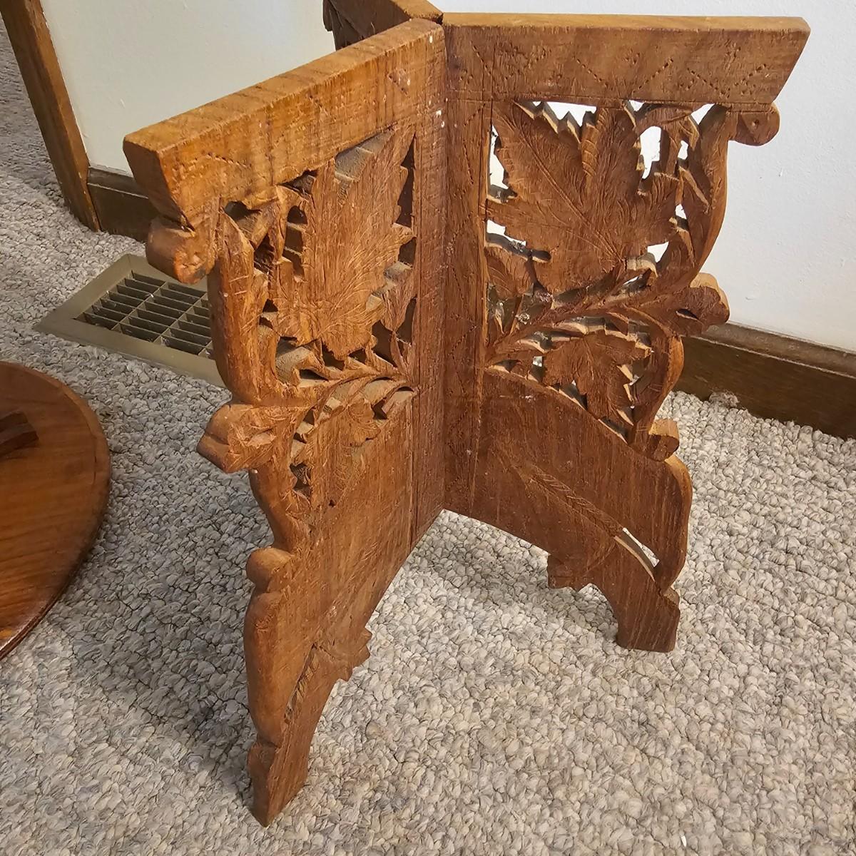 A rustic upcycled rack of doorknobs with a stylish sculpted backpack. Perfect for decoration or hanging coats, hats, etc. Piece measures 50" x 3" x 7"H. Round carved table has three legs that fold flat for storage, measures 14.4"D x 15.5"H. Intricate carving on all surfaces. See photos for details. Local pickup only.
