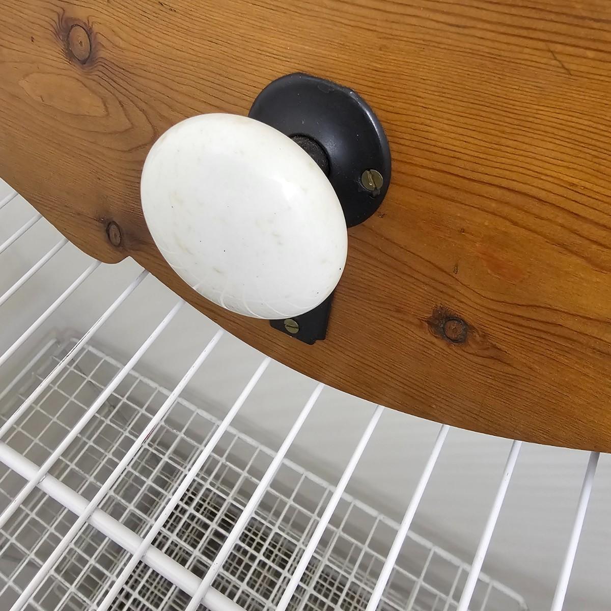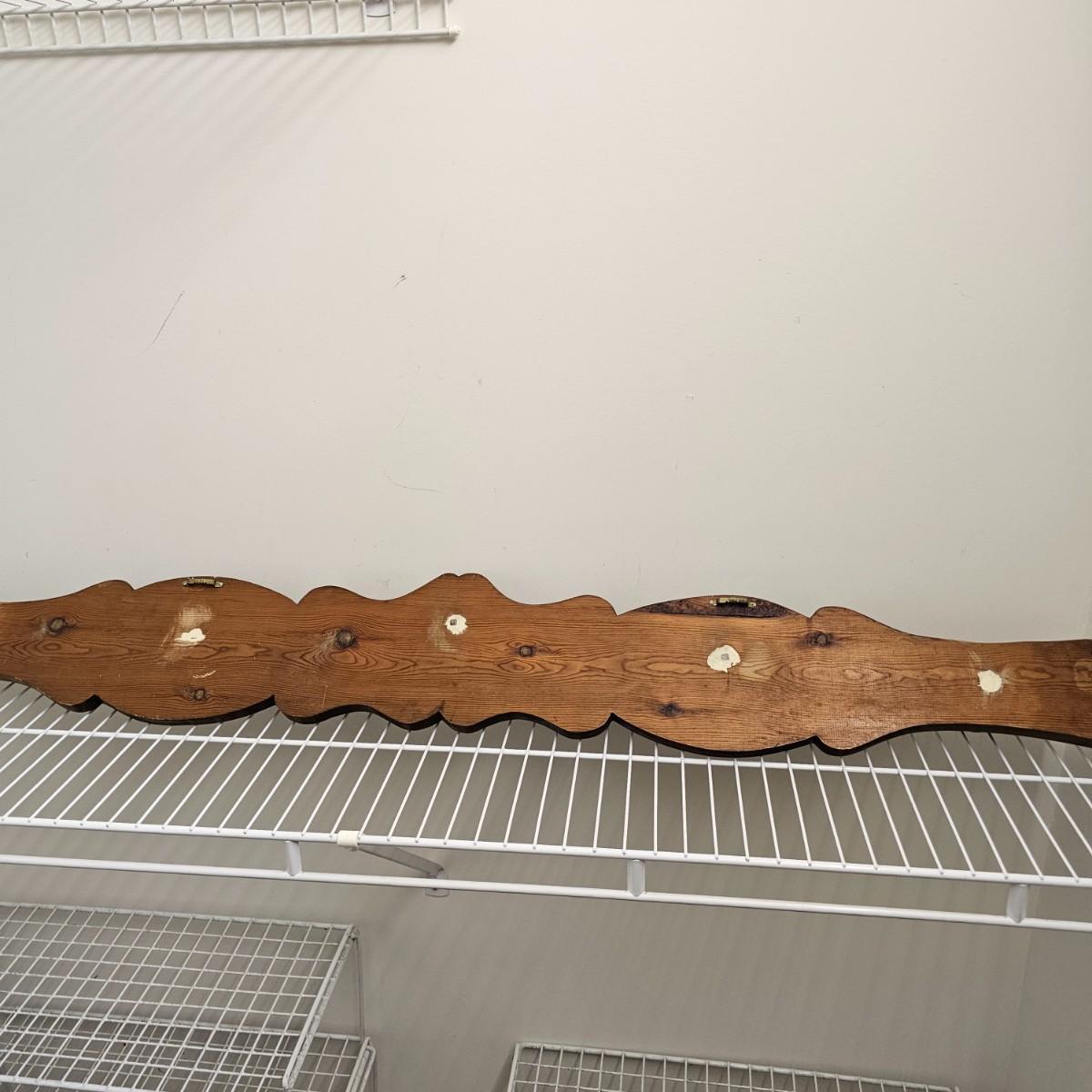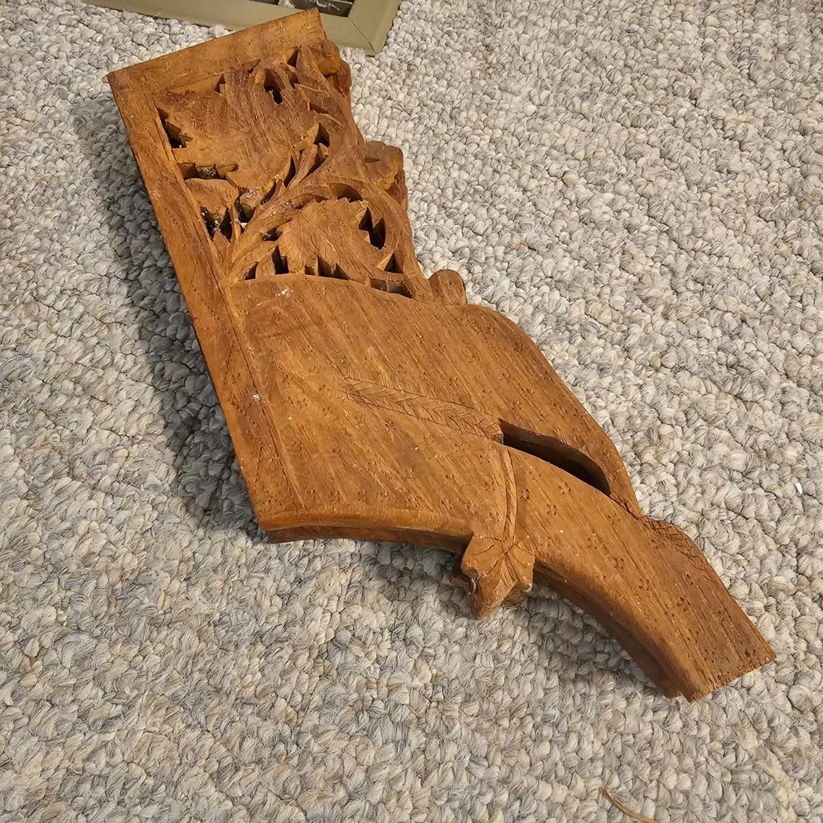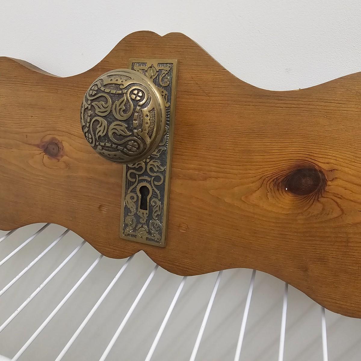 A rustic upcycled rack of doorknobs with a stylish sculpted backpack. Perfect for decoration or hanging coats, hats, etc. Piece measures 50" x 3" x 7"H. Round carved table has three legs that fold flat for storage, measures 14.4"D x 15.5"H. Intricate carving on all surfaces. See photos for details. Local pickup only.