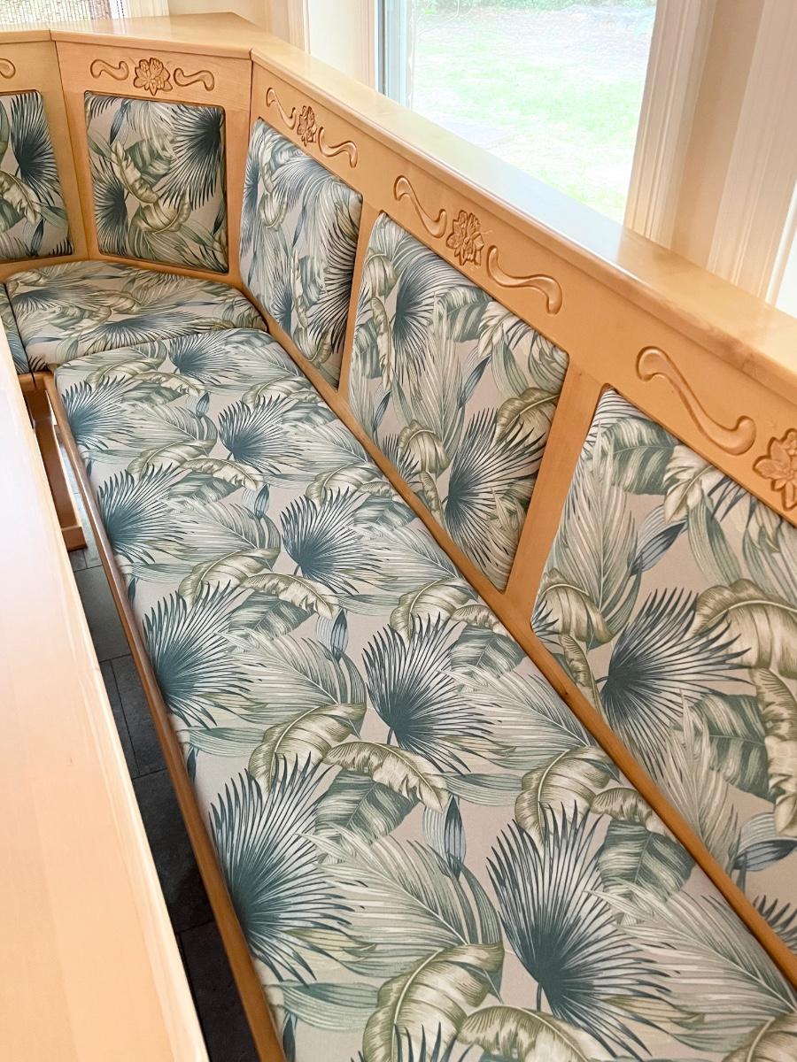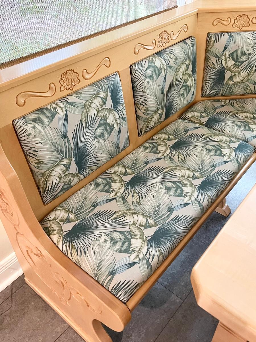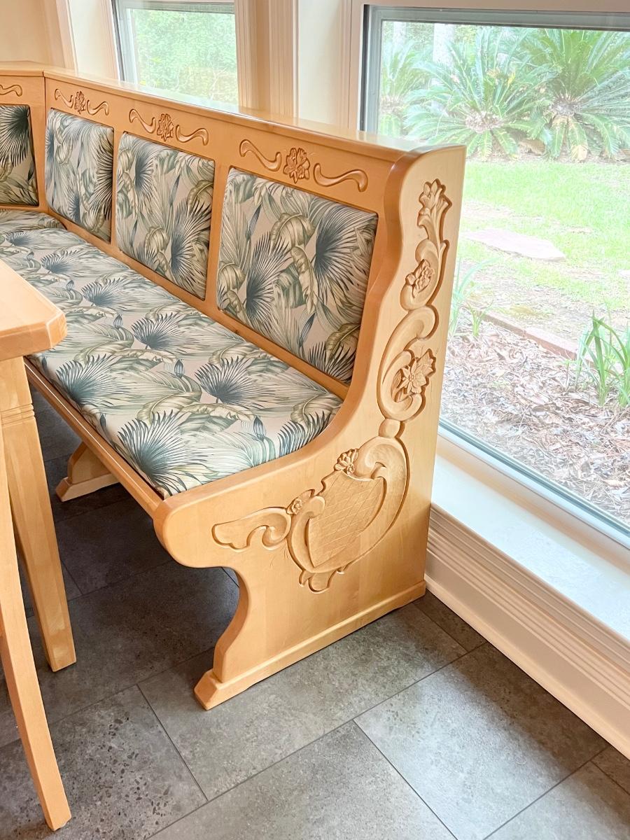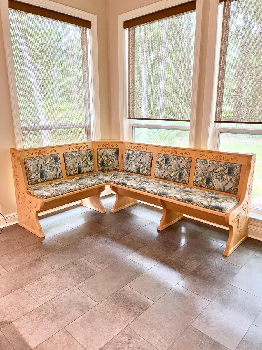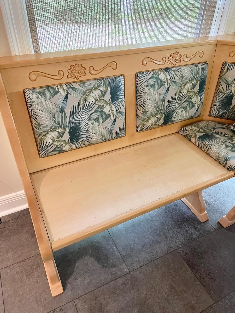Heavy! Excellent condition ~ Set includes table, bench & 3 chairs ~ Bench can be dismantled into 3 pieces ~ No brand ~ Table = 30” H x 55” W x 36” D ~ Bench = 38” H, one side = 62” W, other side = 90” W, Floor to seat = 19.5” H ~ Chairs = 36” H x 19” W x 19” D ~ FYI Owner has a cat, there are no stains or scratches on the fabric