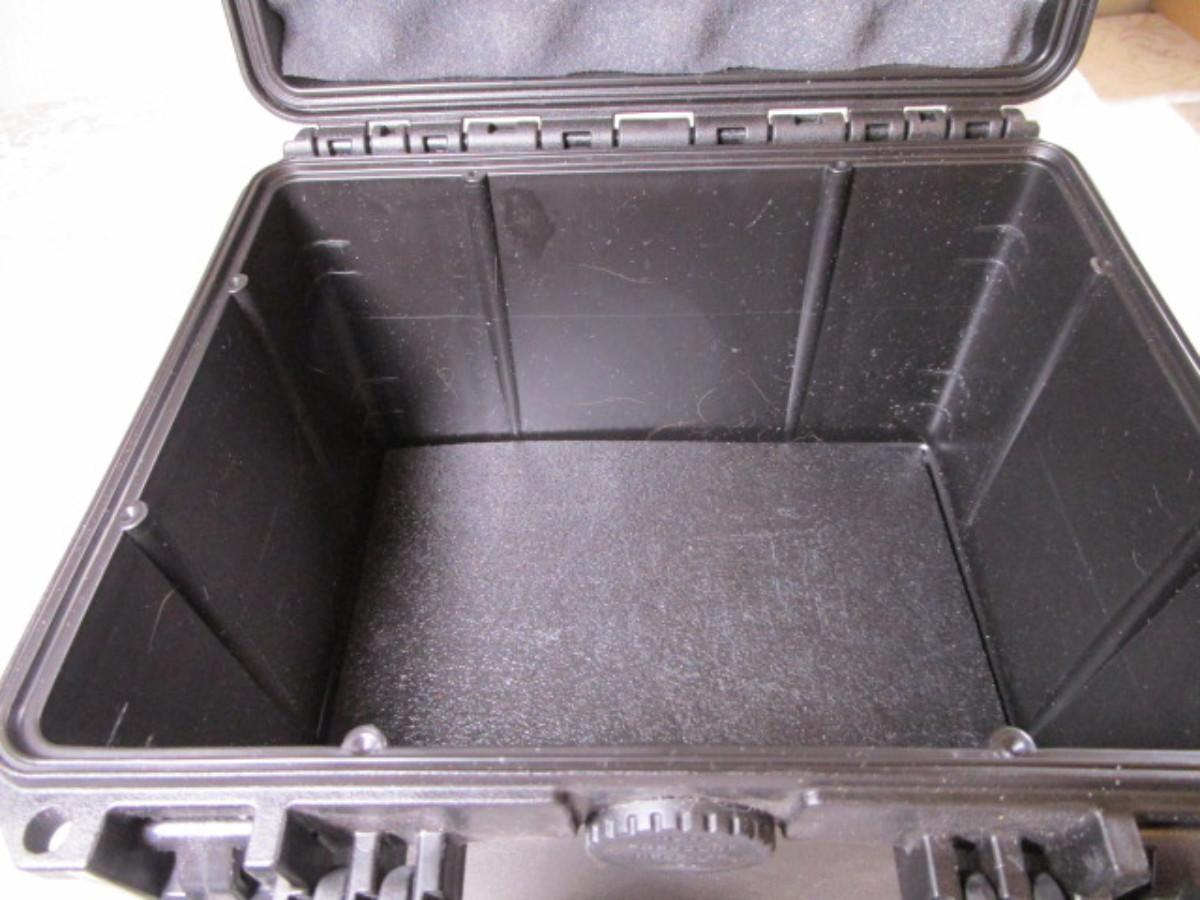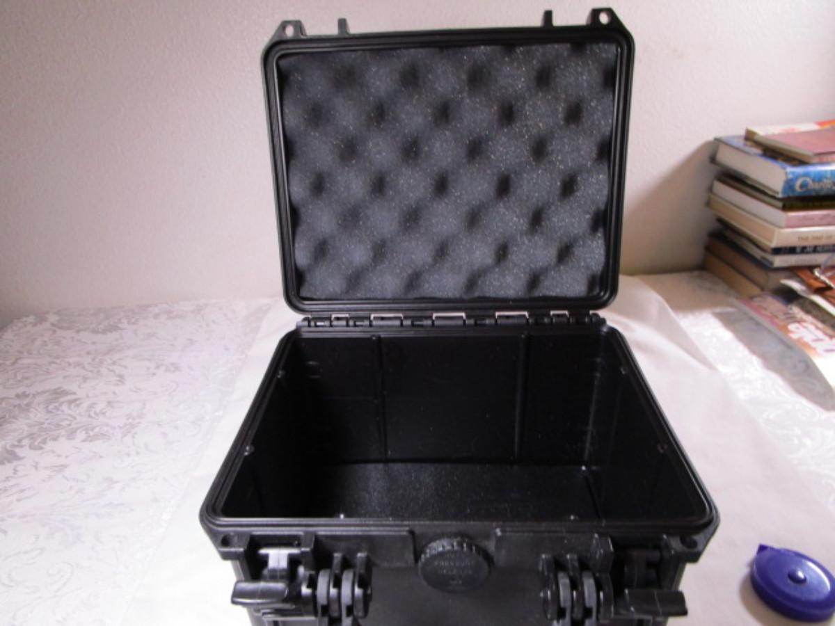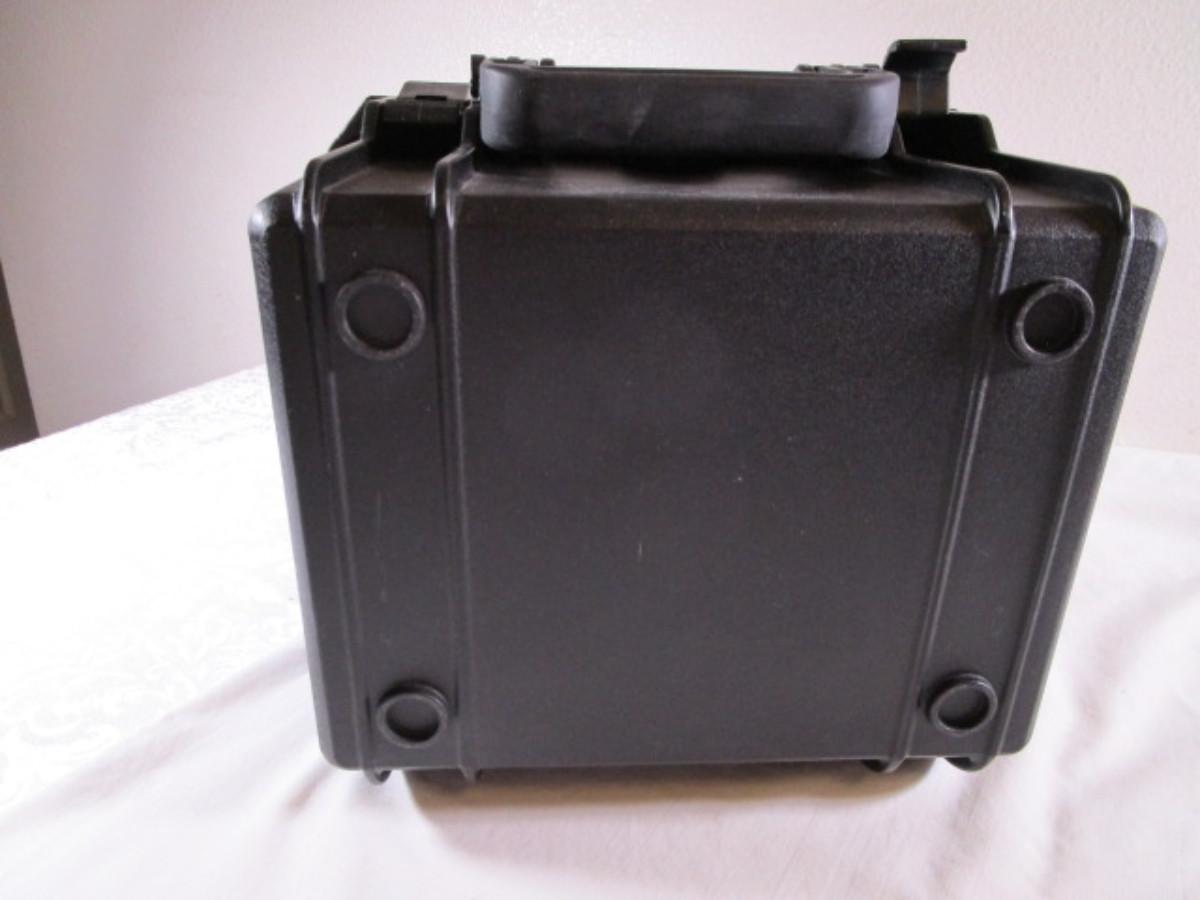 10" across, 6-1/2" deep, x 7" tall, missing foam inserts, hard shell