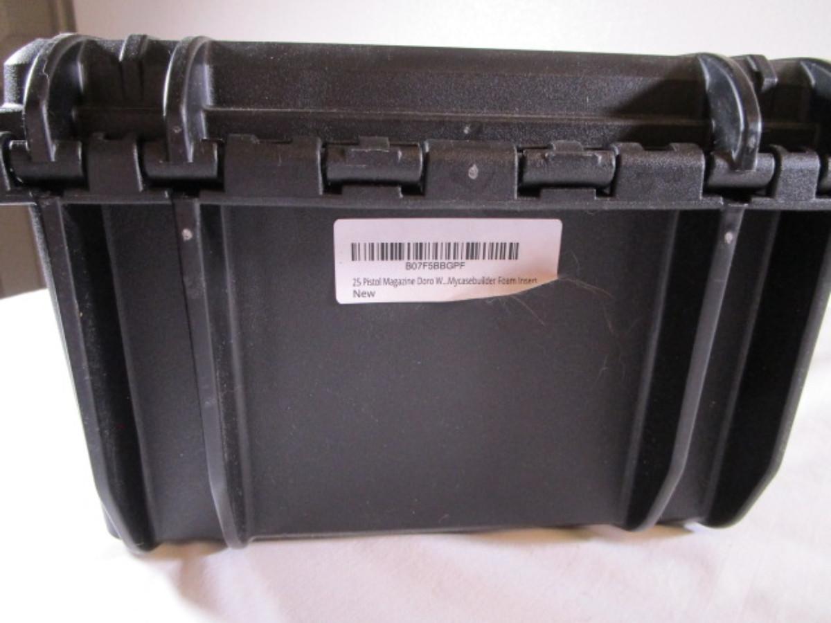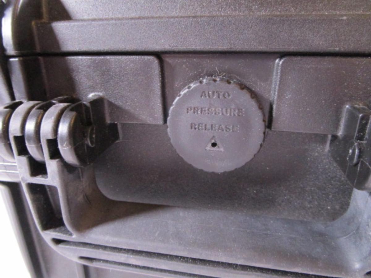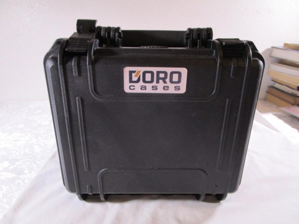 10" across, 6-1/2" deep, x 7" tall, missing foam inserts, hard shell