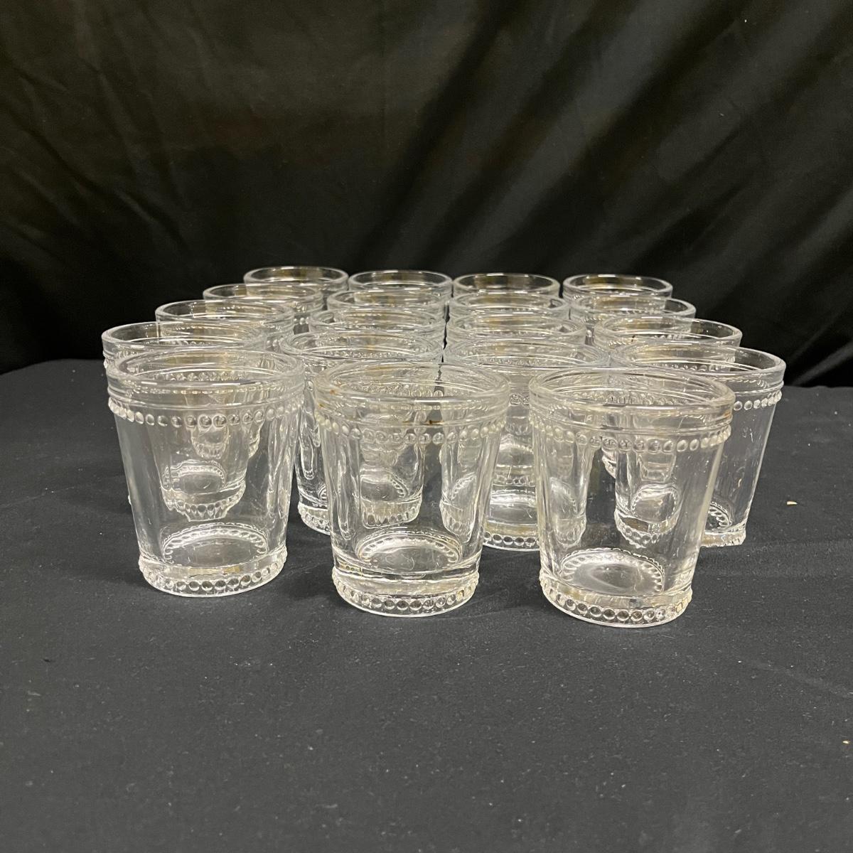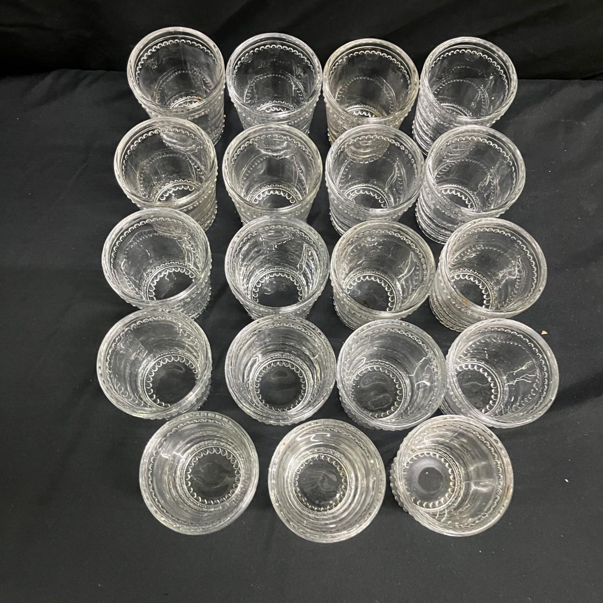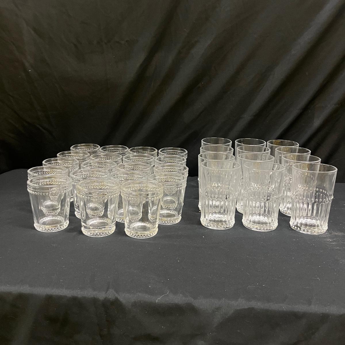 Lot includes 19 drinking glasses that each measure 3”D x 3.75”H and 12 tumblers that each measure 3”D x 5”H. The glasses appear to be vintage pressed clear glass with a hobnail style dot trim.