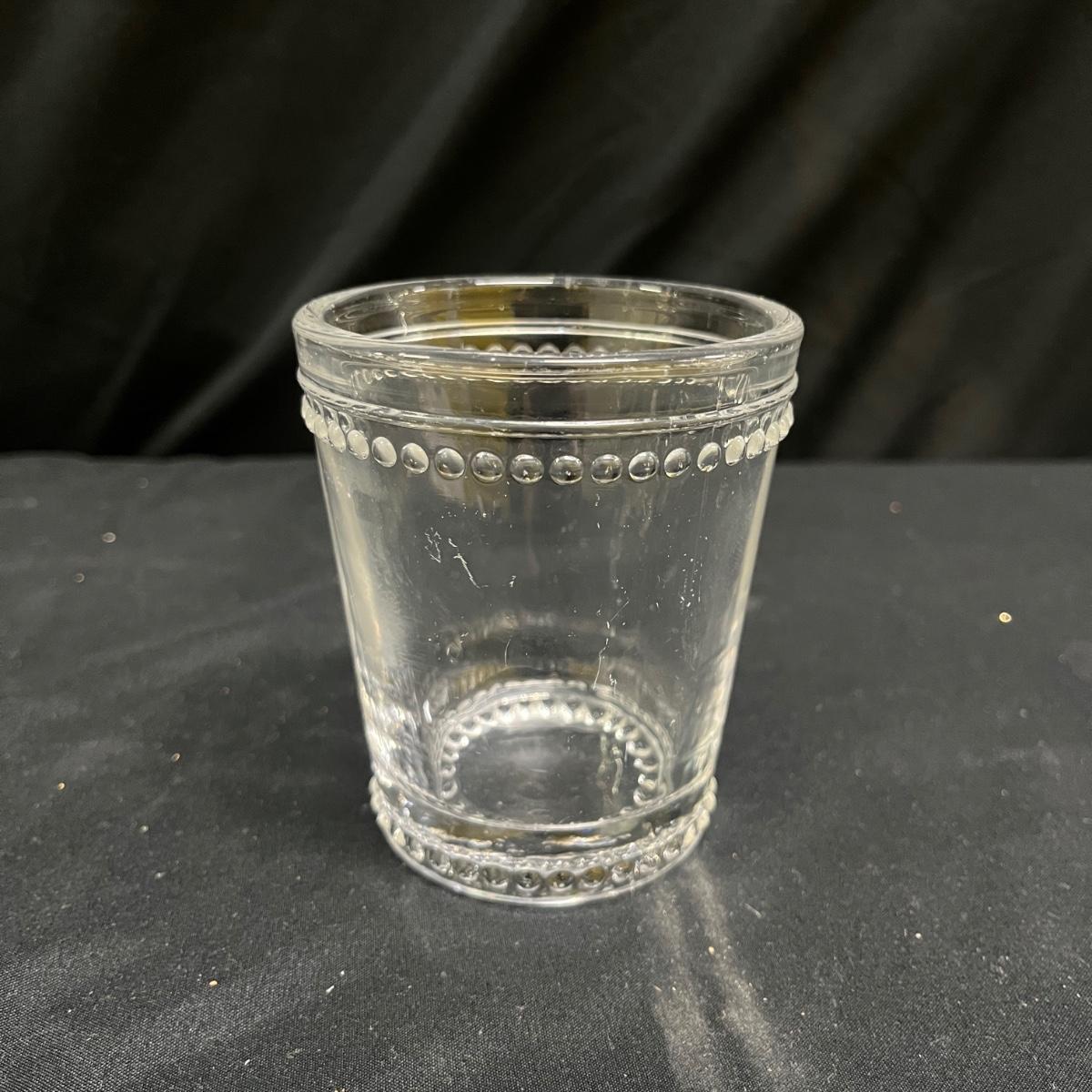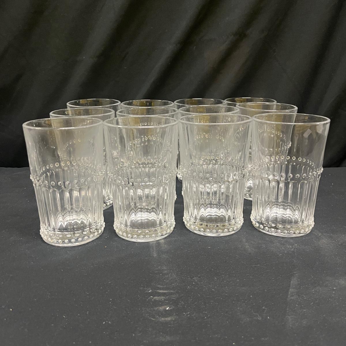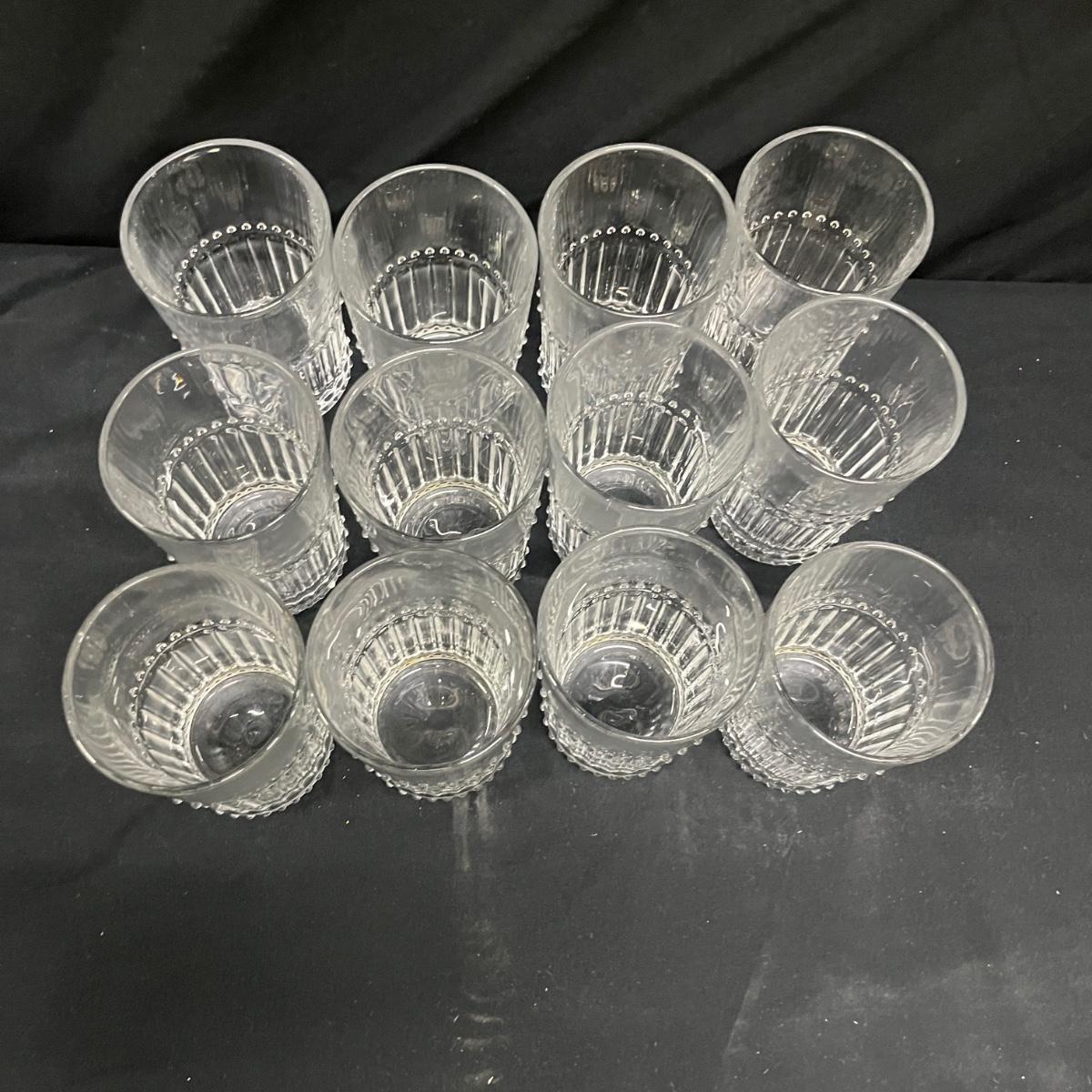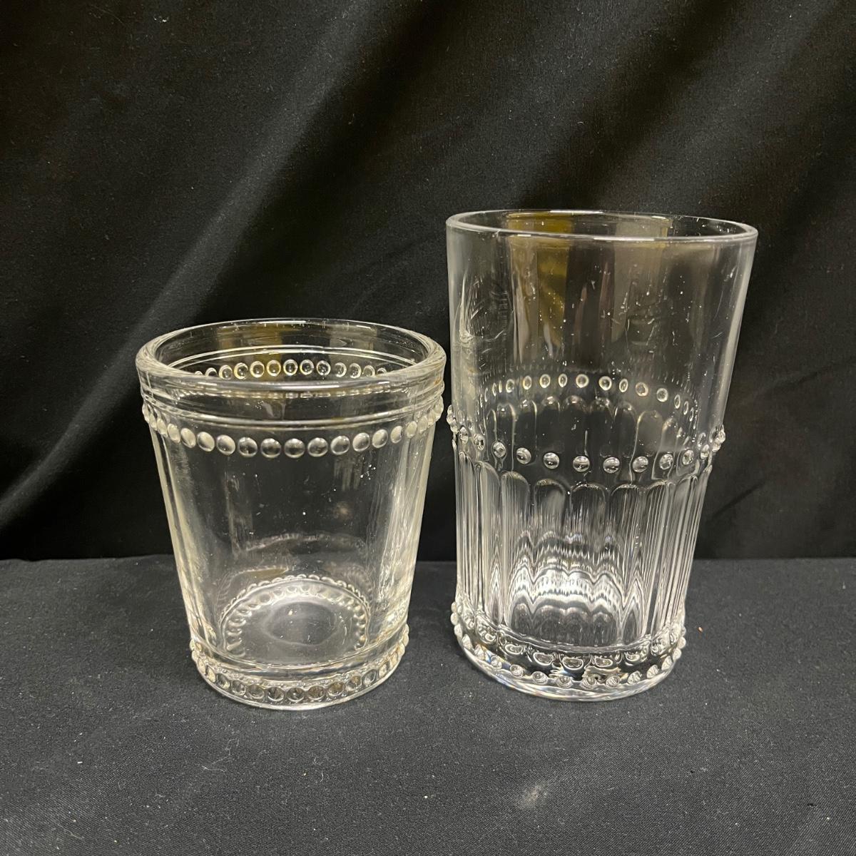 Lot includes 19 drinking glasses that each measure 3”D x 3.75”H and 12 tumblers that each measure 3”D x 5”H. The glasses appear to be vintage pressed clear glass with a hobnail style dot trim.