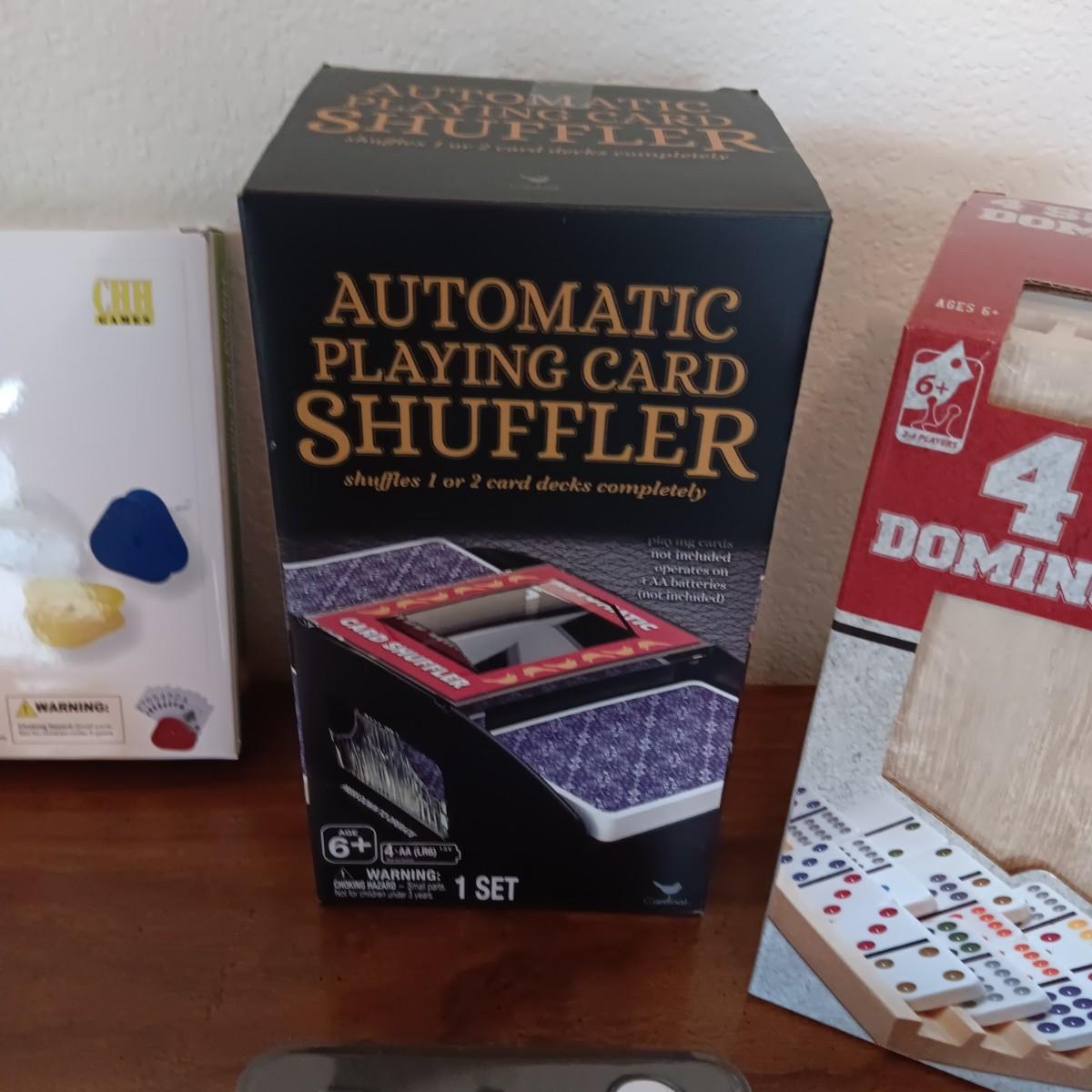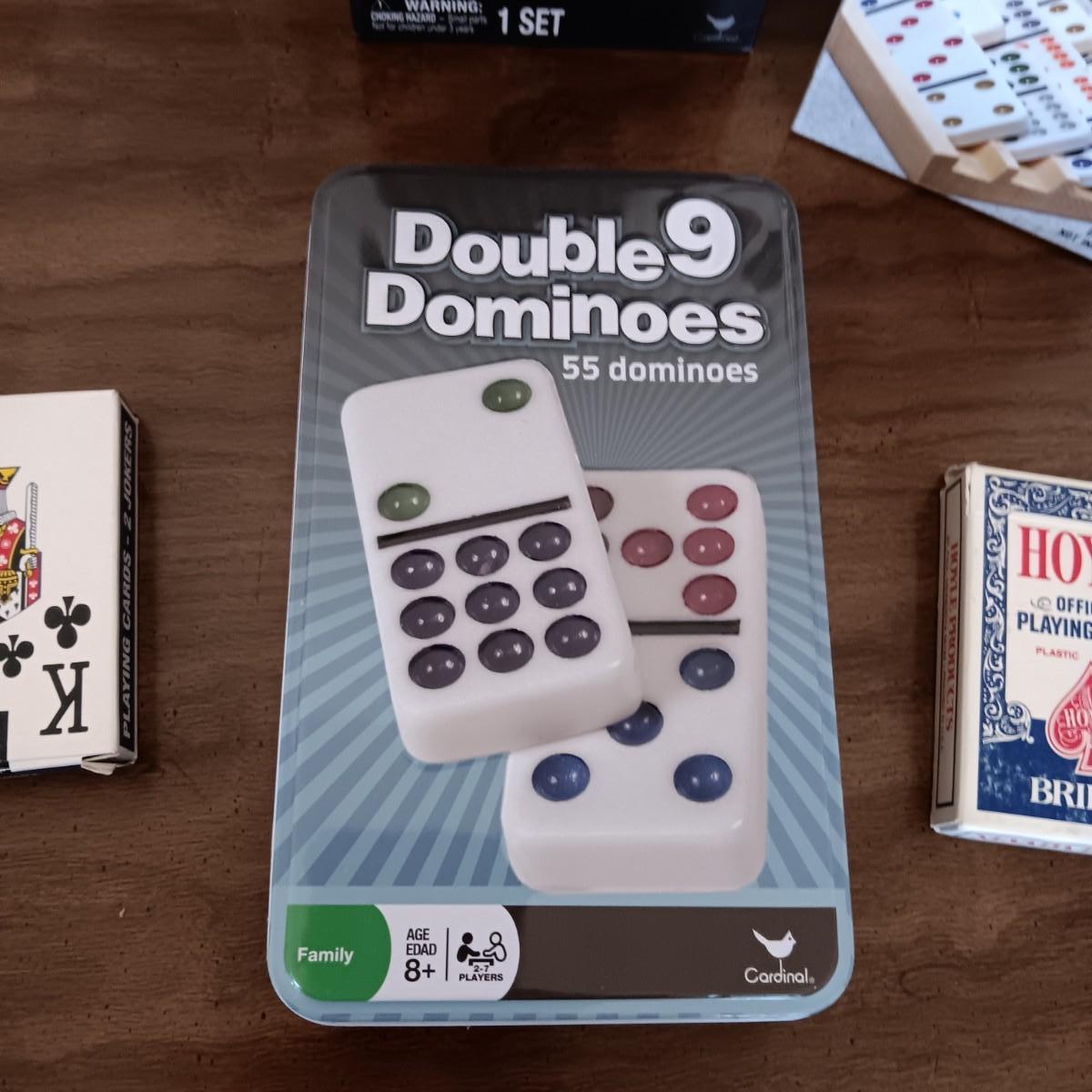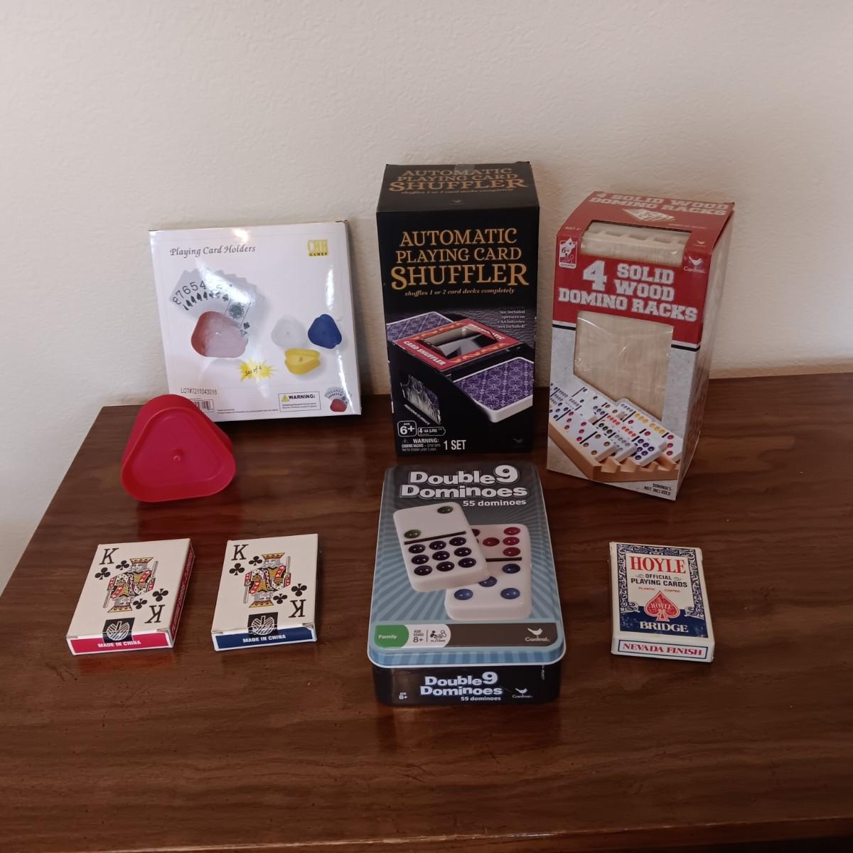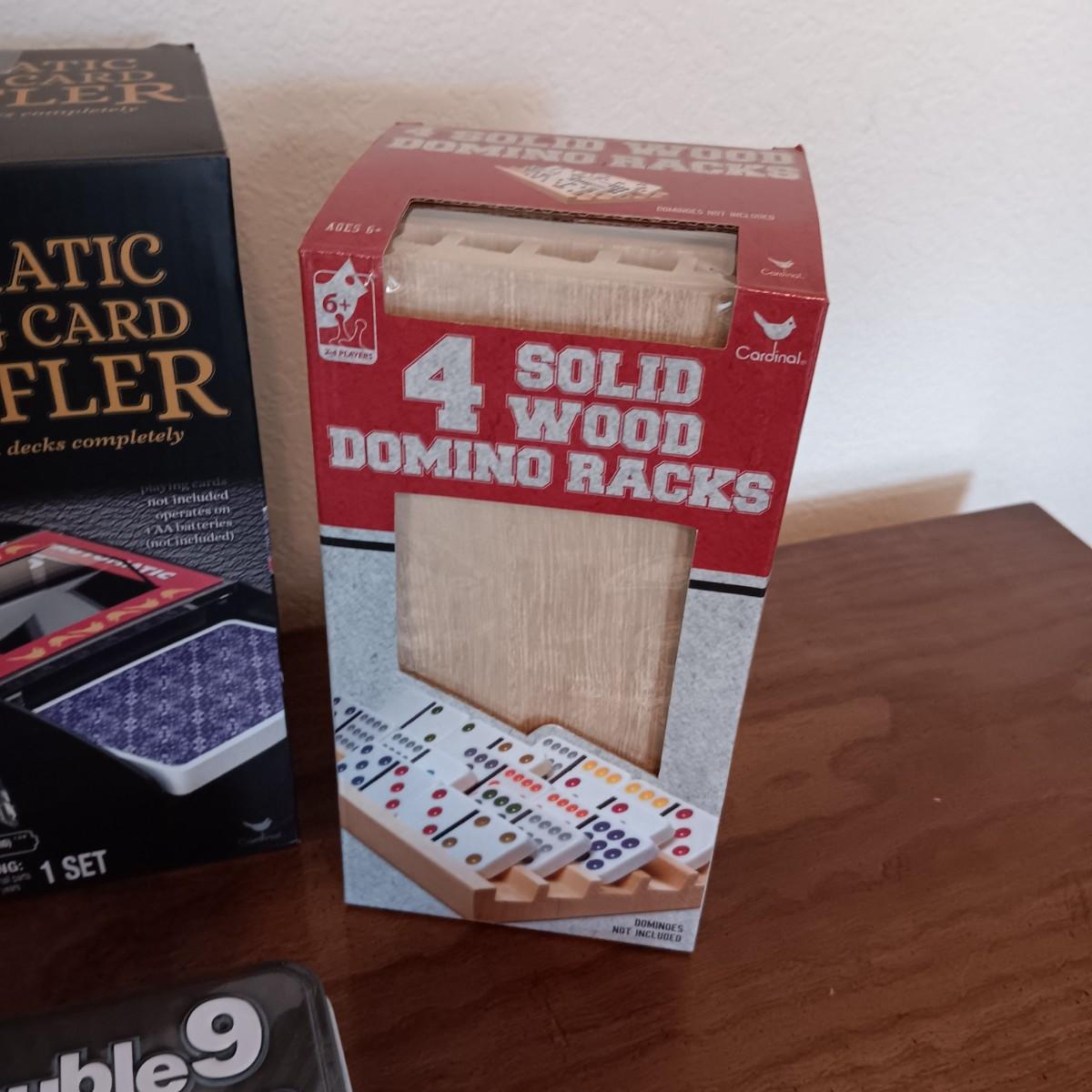 DOUBLE 9 DOMINOES, WOOD DOMINO RACKS, PLAYING CARDS, CARD SHUFFLER AND CARD HOLDERS