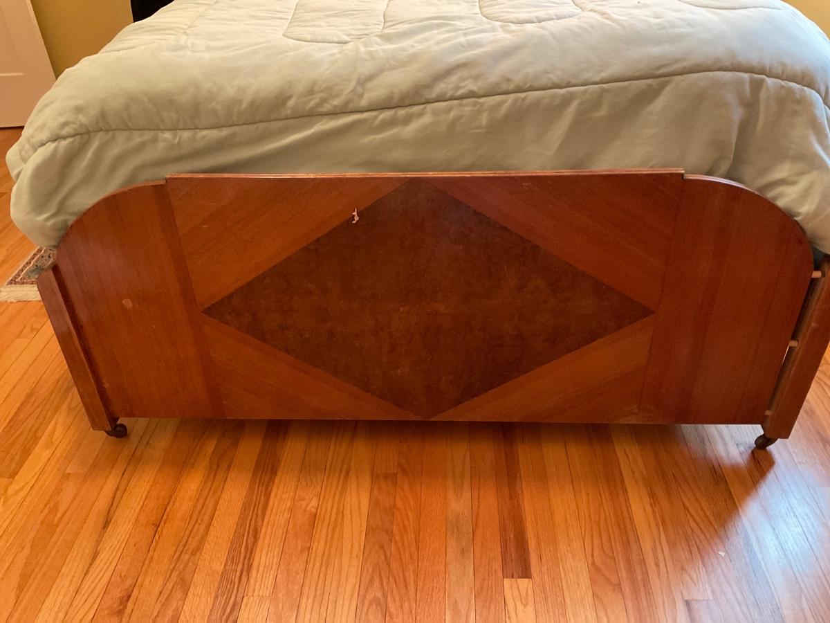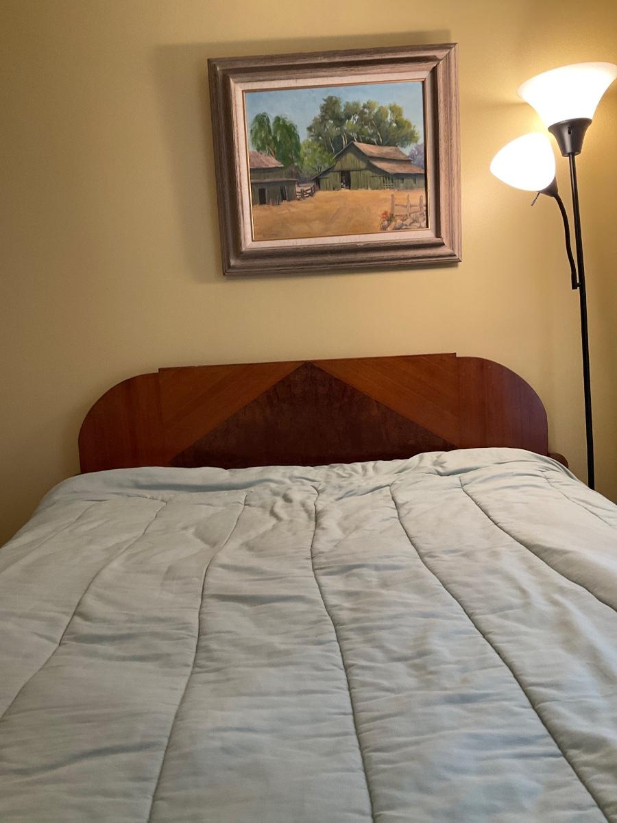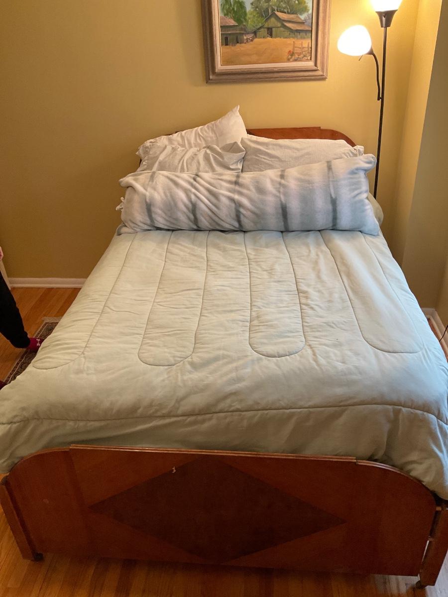 Vintage Hand crafted wood double bed includes headboard, footboard, frame. Includes plush pillow top mattress & box spring. Comforter, sheets, 2 pillows & fuzzy body pillow included. Frame needs some TLC.
