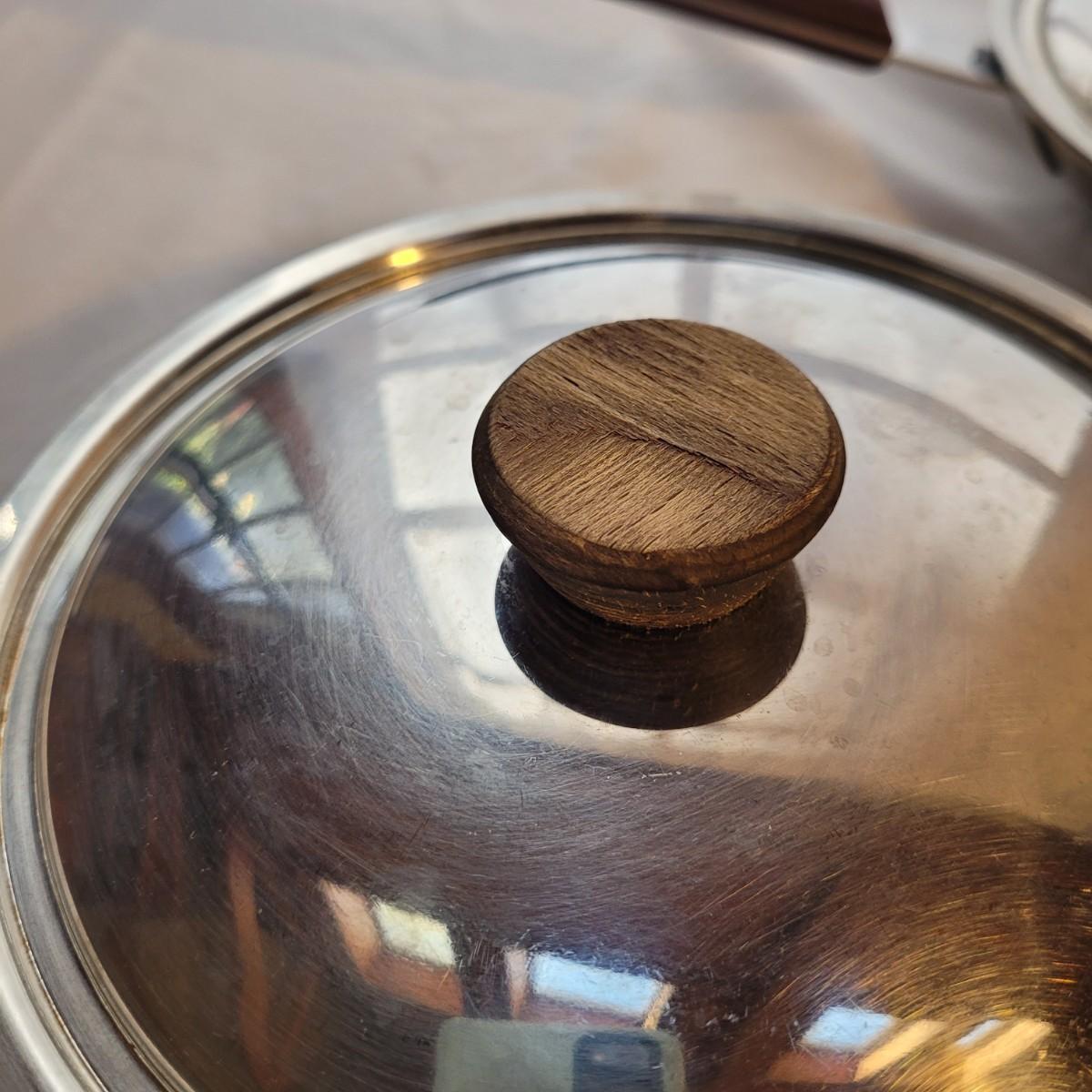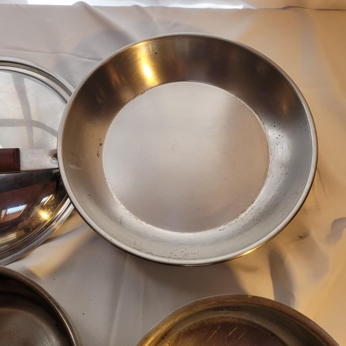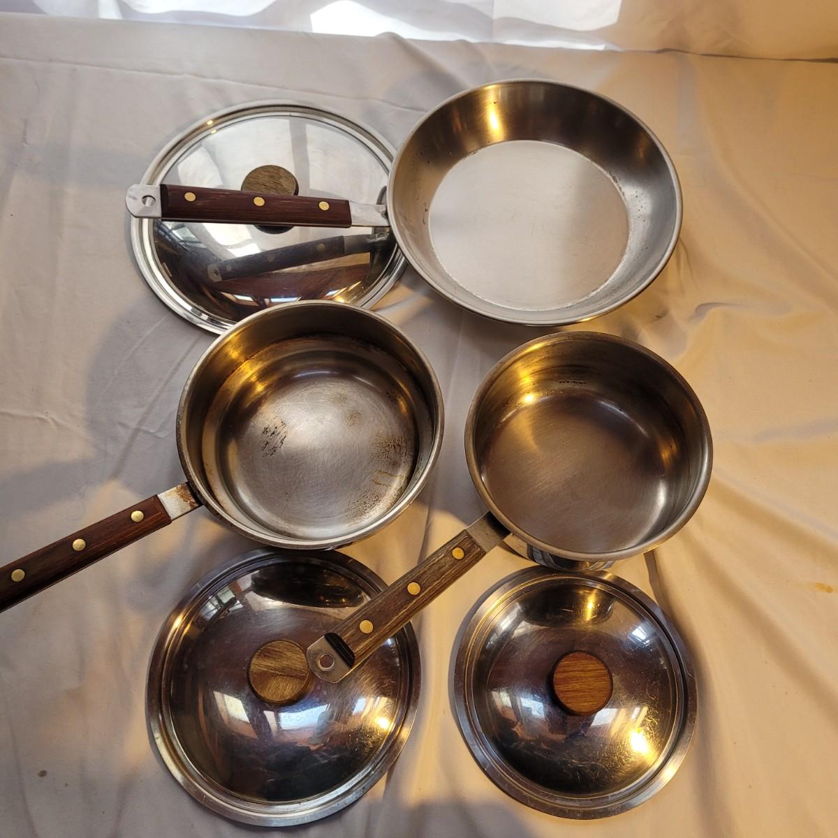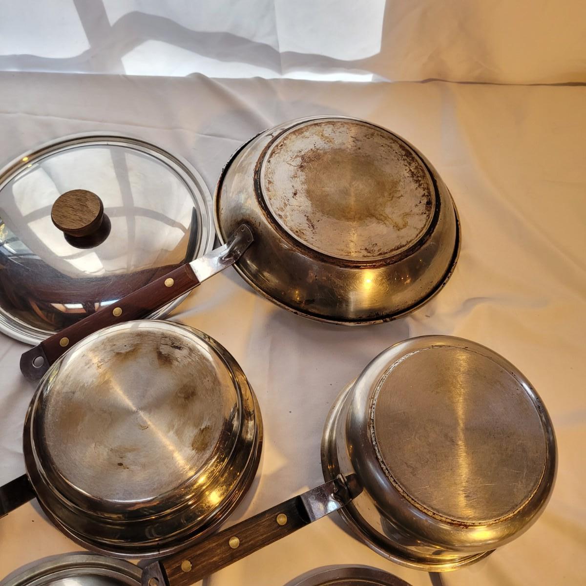 This set of metal pots and pans includes a small pot with a fitted double boiler, and a 10” saute pan. Items show signs of wear. May be able to be cleaned. Shipping available.