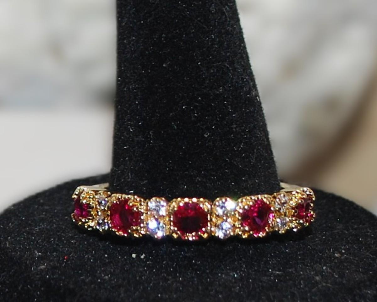 Size 10 Cranberry Red Line of 5 Stones Ring with Middle Clear Stone Accents on a Gold Tone Band (3.2g)