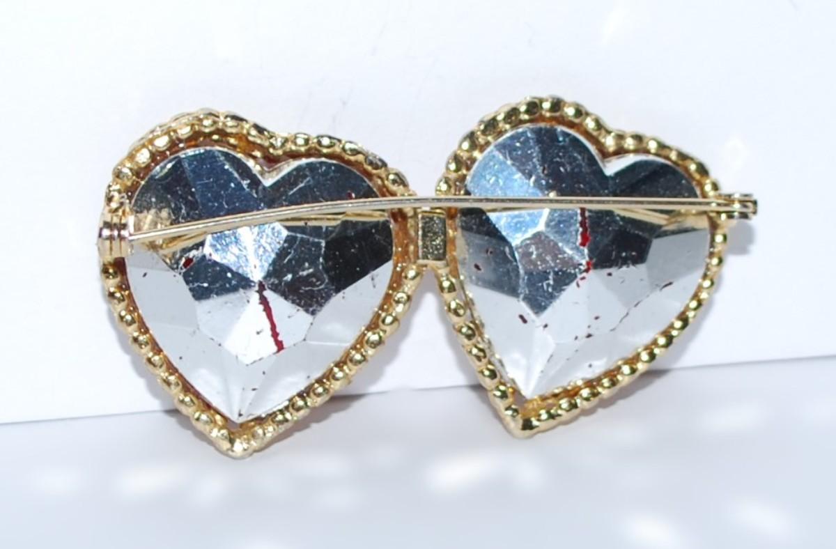 Double Connected RED HEARTS BROOCH (2½" x 1⅛") with Glass Stones and Gold Ribbon Outline on a Gold Tone Setting