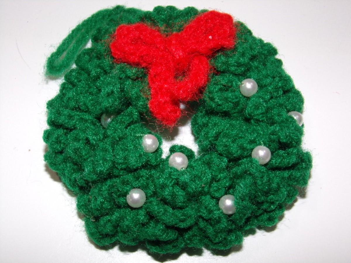 Hand crafted double crocheted Christmas wreath tree ornament.